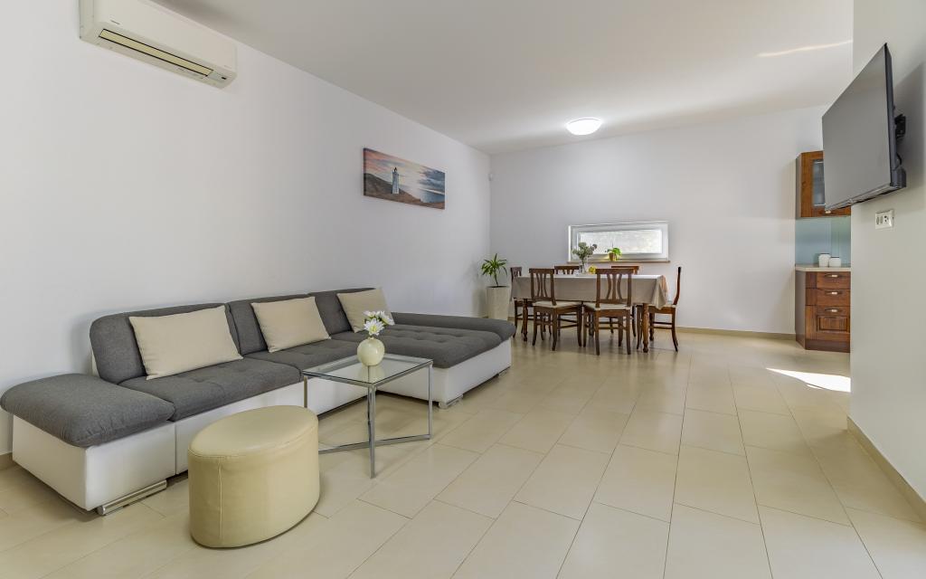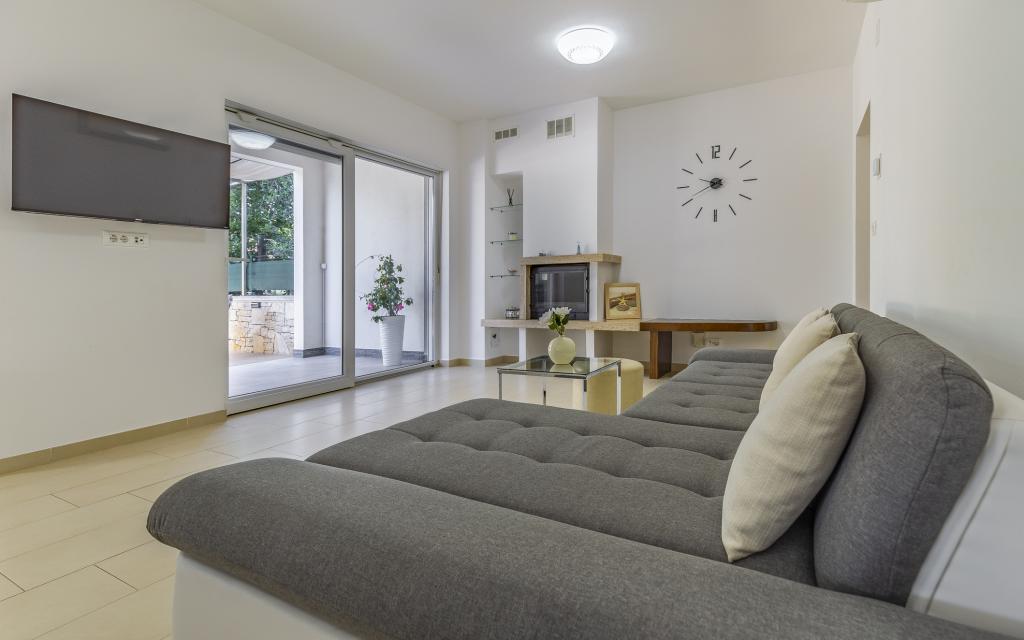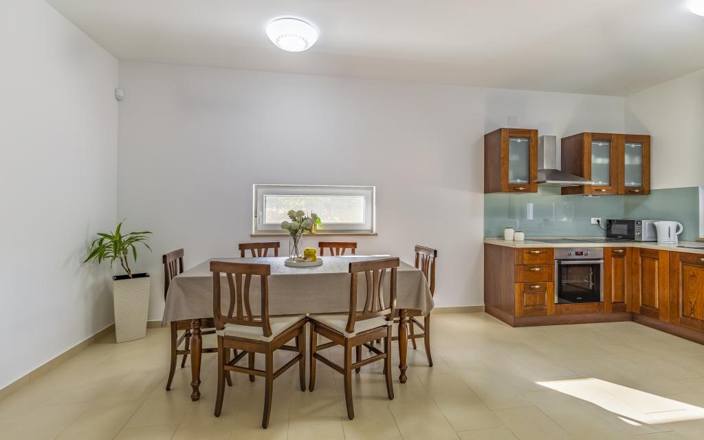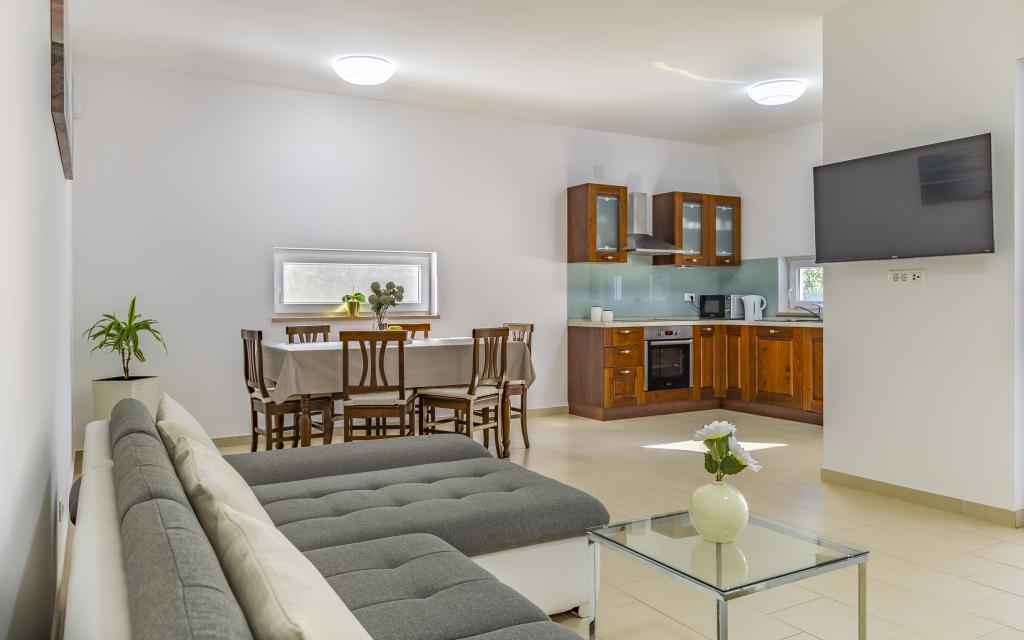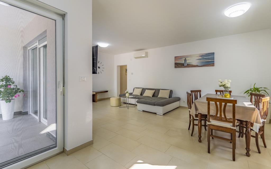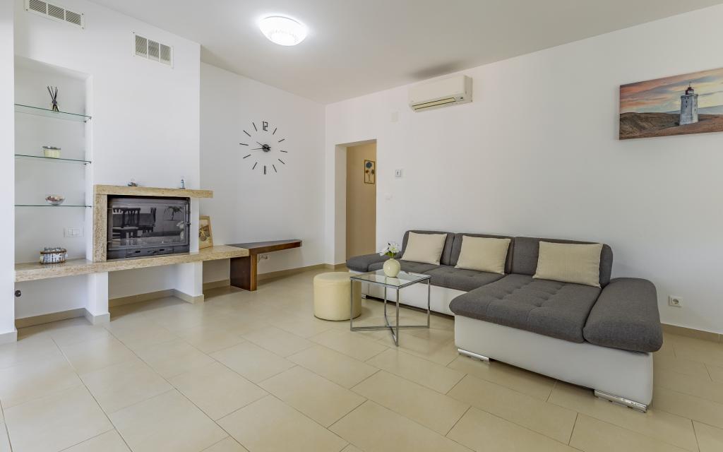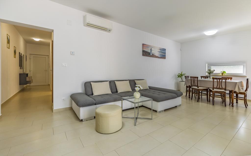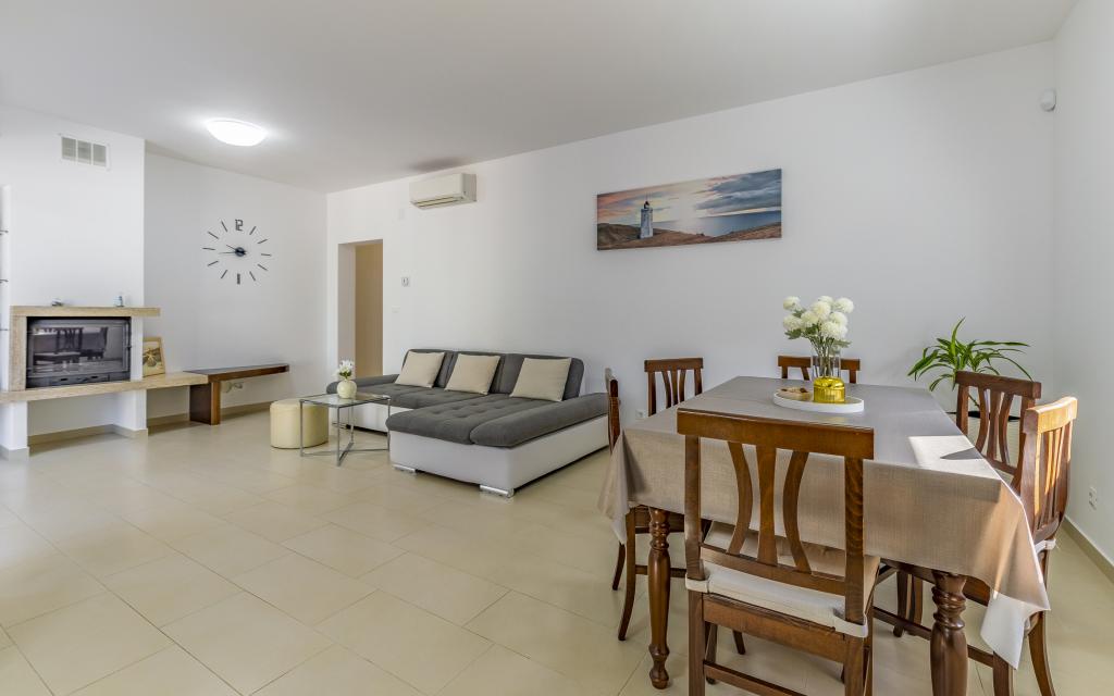 Appartamento (80 m²) completamente arredato e di livello superiore, in una posizione eccellente in una zona tranquilla di Banjol, a soli 5 minuti (300 m) a piedi dalle spiagge più belle della zona. L'appartamento si trova al piano terra di un edificio residenziale con soli tre appartamenti. L'appartamento dispone di un giardino privato (100 m²) con terrazza, tavolo, sedie a sdraio, doccia esterna e barbecue, che consente piacevoli momenti di socializzazione in assoluta privacy ed è particolarmente adatto a famiglie con bambini. Accanto all'edificio si trova un parcheggio privato con accesso diretto al giardino e alla terrazza. Il giardino è stato completamente ristrutturato nel 2024. L'intero edificio è protetto da una recinzione di sicurezza (accesso con tessera magnetica). L'appartamento dispone di 2 camere da letto con letti matrimoniali, 2 bagni con WC e doccia, un ampio soggiorno con divano letto, sala da pranzo e cucina. L'appartamento è climatizzato e riscaldato in inverno (riscaldamento a pavimento) e dispone di un camino interno, quindi è adatto anche per soggiorni nei mesi più freddi dell'autunno e dell'inverno. Nelle immediate vicinanze dell'appartamento si trovano numerosi bar e ristoranti, nonché negozi ben forniti.