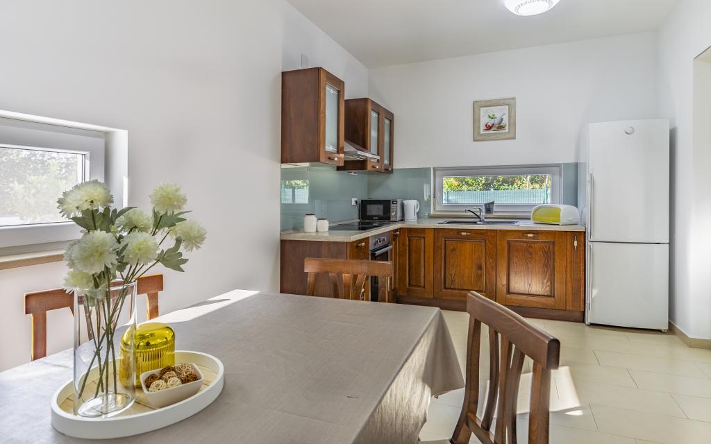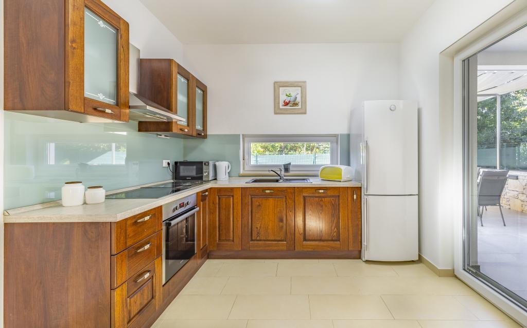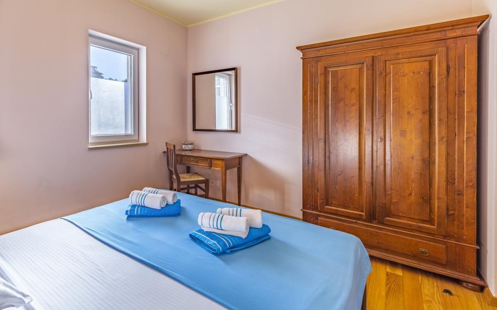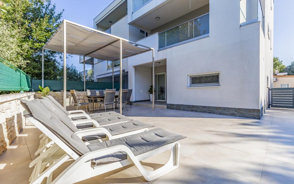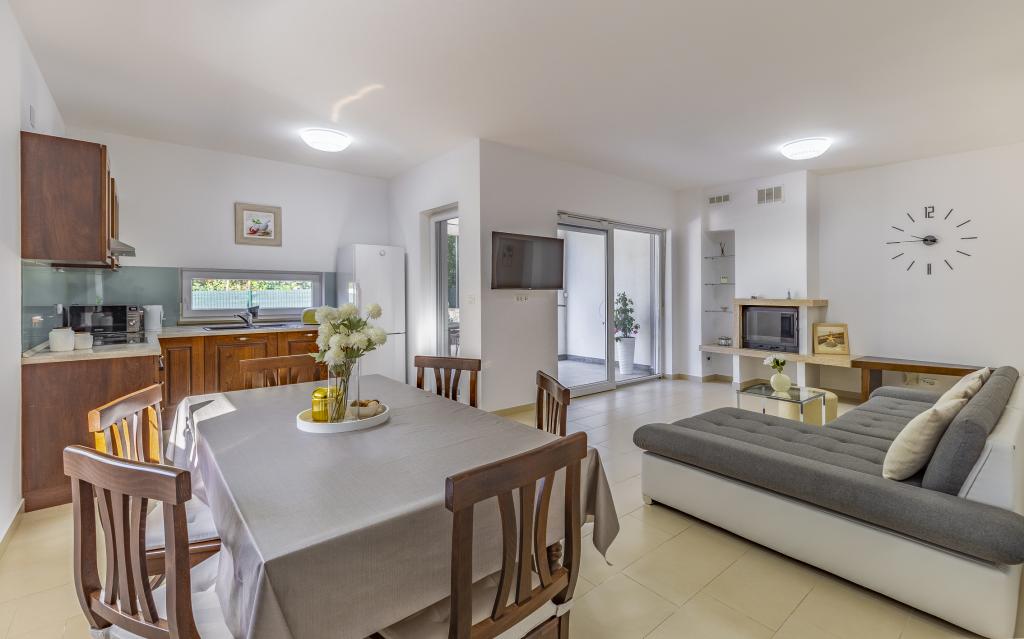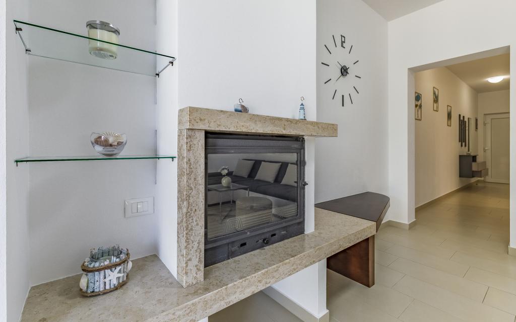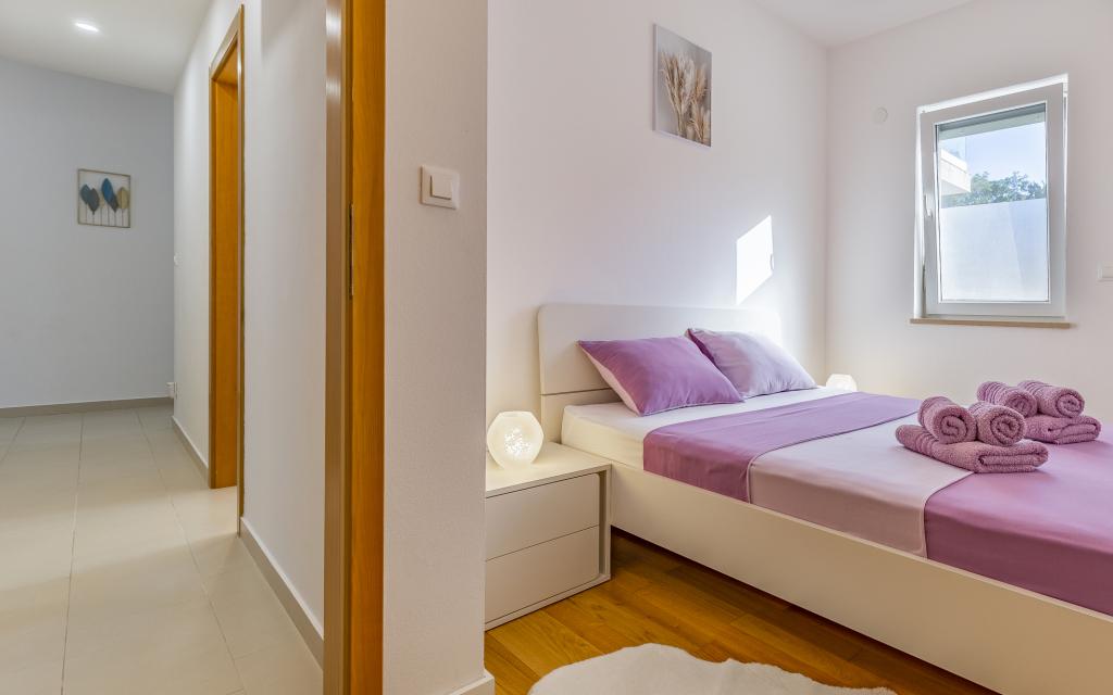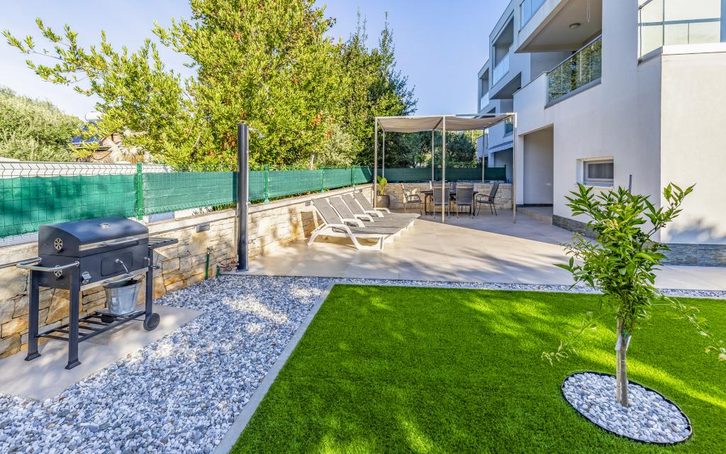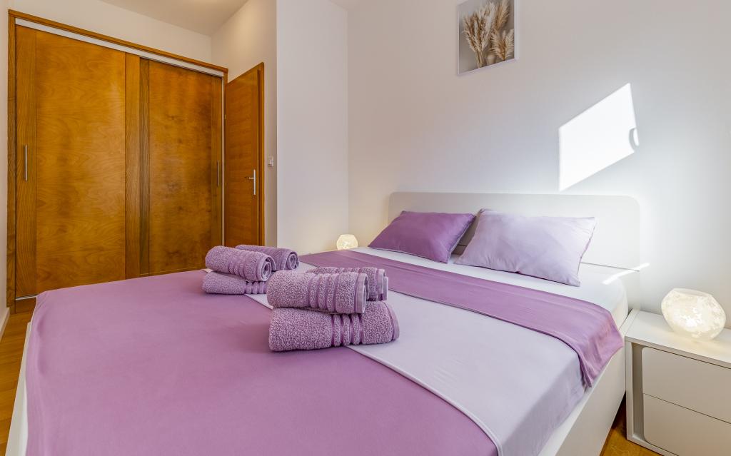 Appartamento (80 m²) completamente arredato e di livello superiore, in una posizione eccellente in una zona tranquilla di Banjol, a soli 5 minuti (300 m) a piedi dalle spiagge più belle della zona. L'appartamento si trova al piano terra di un edificio residenziale con soli tre appartamenti. L'appartamento dispone di un giardino privato (100 m²) con terrazza, tavolo, sedie a sdraio, doccia esterna e barbecue, che consente piacevoli momenti di socializzazione in assoluta privacy ed è particolarmente adatto a famiglie con bambini. Accanto all'edificio si trova un parcheggio privato con accesso diretto al giardino e alla terrazza. Il giardino è stato completamente ristrutturato nel 2024. L'intero edificio è protetto da una recinzione di sicurezza (accesso con tessera magnetica). L'appartamento dispone di 2 camere da letto con letti matrimoniali, 2 bagni con WC e doccia, un ampio soggiorno con divano letto, sala da pranzo e cucina. L'appartamento è climatizzato e riscaldato in inverno (riscaldamento a pavimento) e dispone di un camino interno, quindi è adatto anche per soggiorni nei mesi più freddi dell'autunno e dell'inverno. Nelle immediate vicinanze dell'appartamento si trovano numerosi bar e ristoranti, nonché negozi ben forniti.