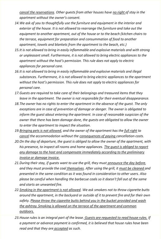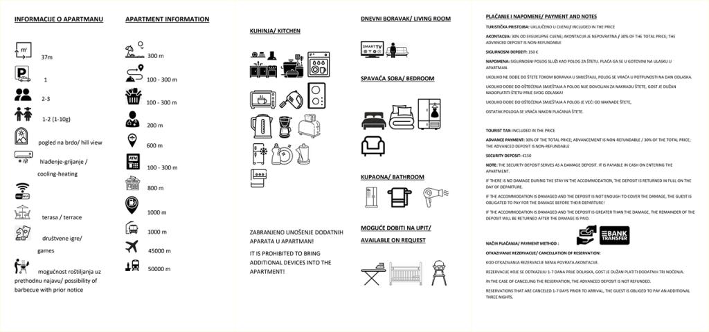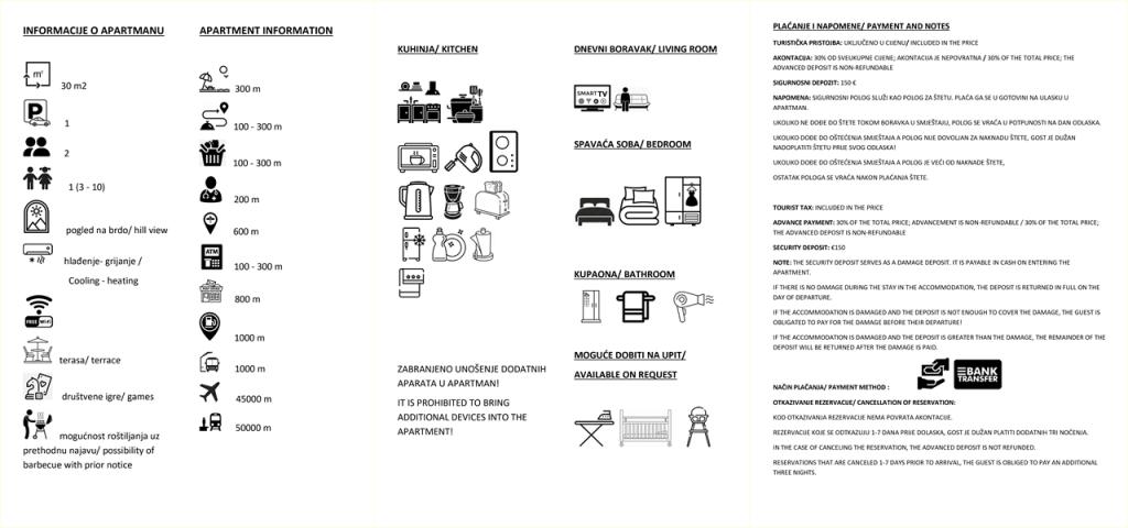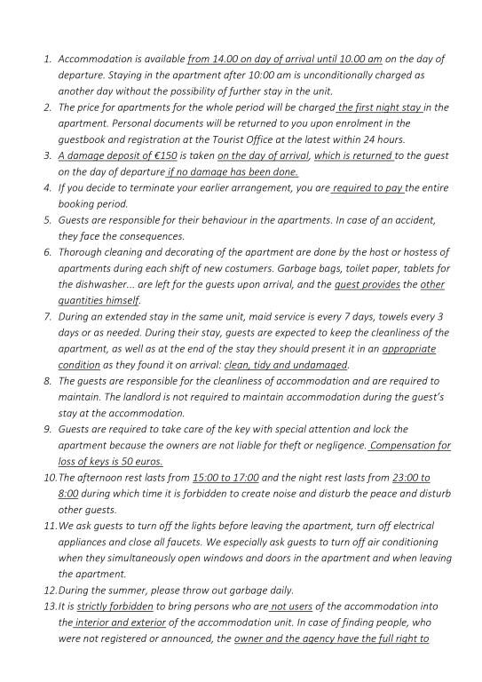 La tassa di soggiorno è inclusa nel prezzo.L'acconto è l'importo versato dall'ospite sul conto del proprietario dell'appartamento ed è l'importo che garantisce l'arrivo dell'ospite al proprietario dell'appartamento e la prenotazione dell'appartamento per una determinata data e un determinato numero di persone, e rappresenta un risarcimento in caso di mancato arrivo dell'ospite; viene trattenuto un anticipo del 30% del prezzo totale e non è rimborsabile. Il saldo viene pagato dall'ospite al momento dell'ingresso nell'appartamento e, dopo il pagamento e il check-in, gli viene consegnata una fattura e i documenti vengono restituiti. All'arrivo, l'ospite versa una cauzione per eventuali danni pari a 150 €, che gli viene restituita il giorno della partenza se non ha causato alcun danno. In caso di danni, la cauzione rimane al proprietario dell'appartamento per coprire l'importo del danno. Se l'importo del danno è superiore alla cauzione, l'ospite è tenuto a pagare immediatamente. Se l'ospite decide di terminare il soggiorno in anticipo, è tenuto a pagare l'intero importo. In caso di violazione del regolamento interno, l'agenzia o il proprietario dell'appartamento ha il diritto di annullare la prenotazione e l'importo dal giorno successivo fino alla fine del soggiorno viene restituito.