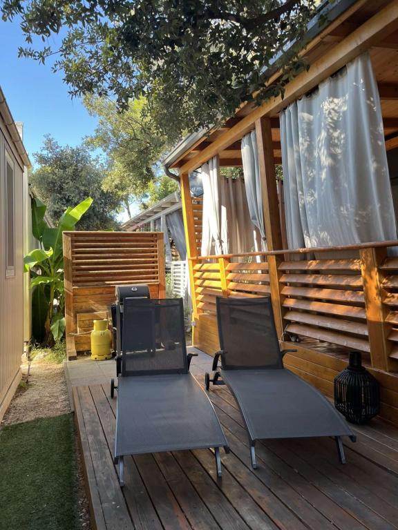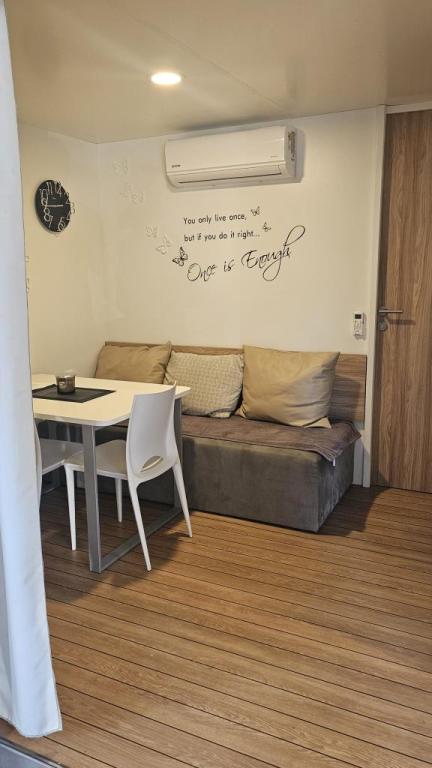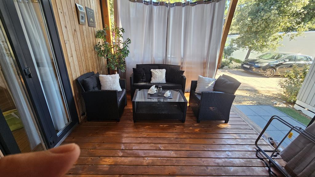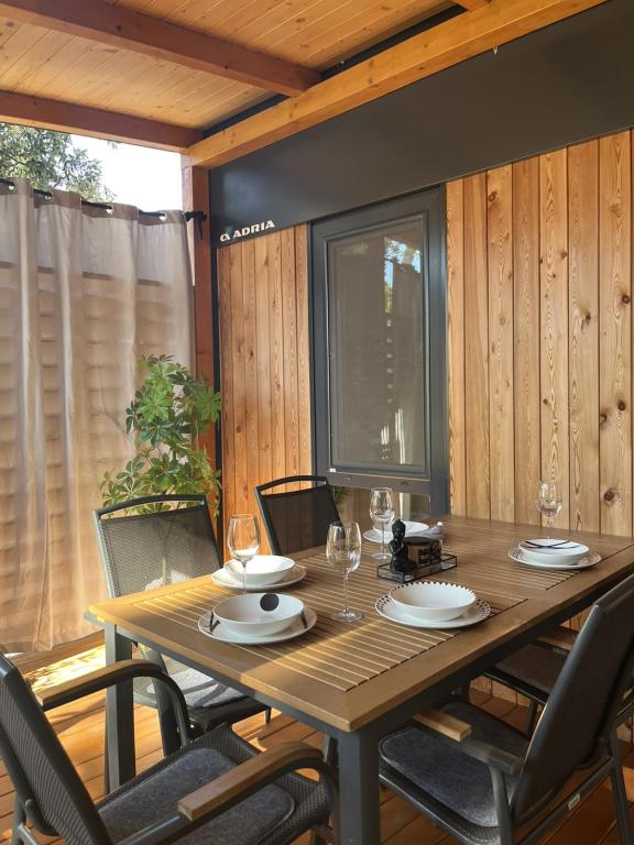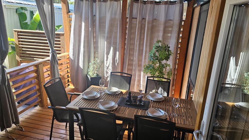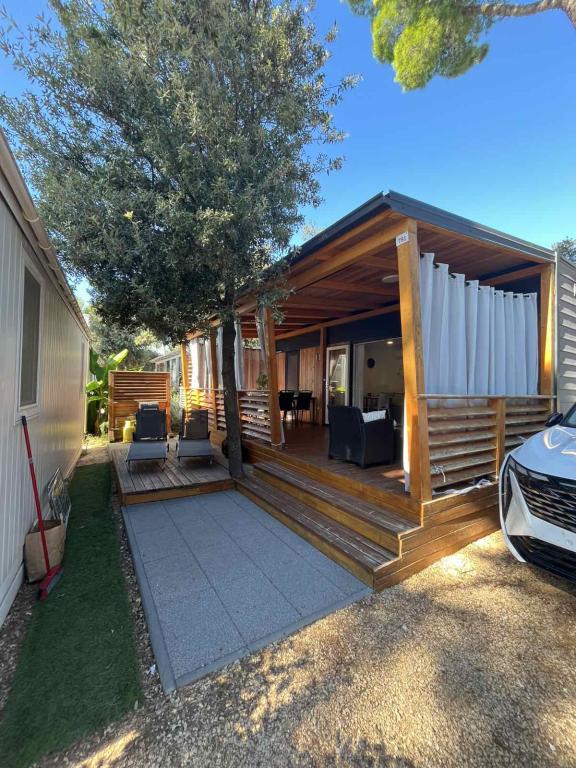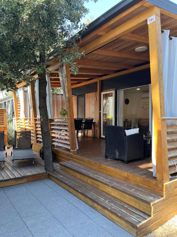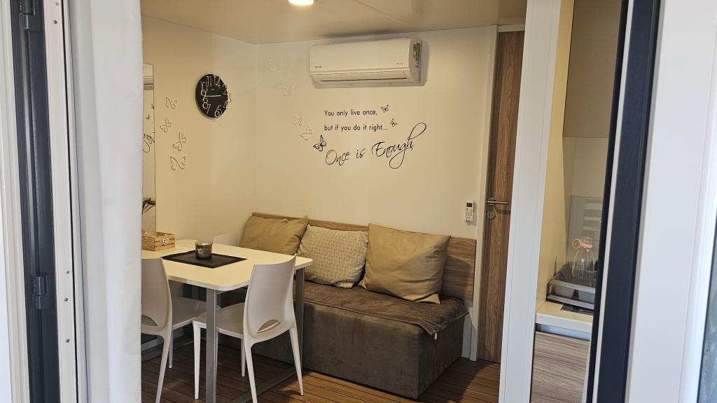 Moderna casa mobile climatizzata nel campeggio Park Soline, a pochi passi dalla spiaggia e a 15 minuti a piedi dal centro di Biograd. Offre 2 camere da letto, una cucina, un soggiorno, 2 bagni e una terrazza coperta con mobili da esterno. Wi-Fi gratuito, parcheggio, animazione per bambini, campi sportivi e un ristorante mediterraneo in loco. Perfetta per famiglie o coppie in cerca di relax all'ombra dei pini, vicino a tutte le principali attrazioni.