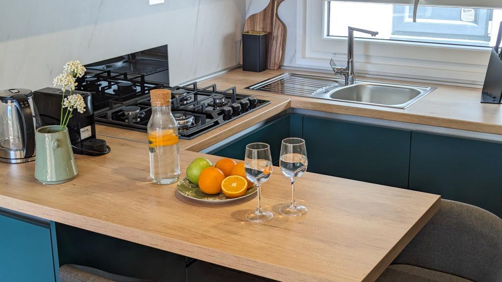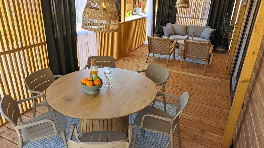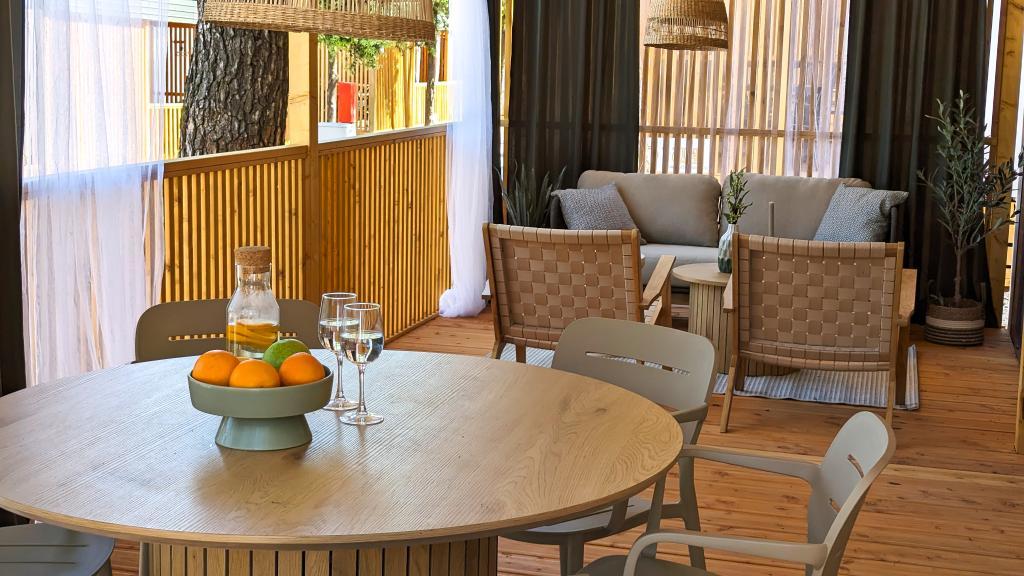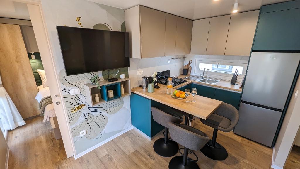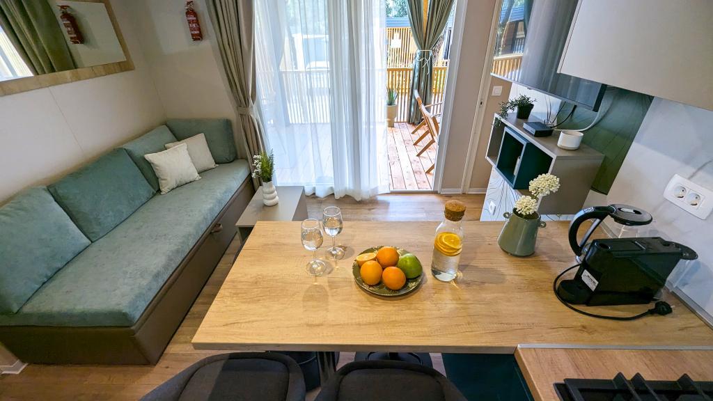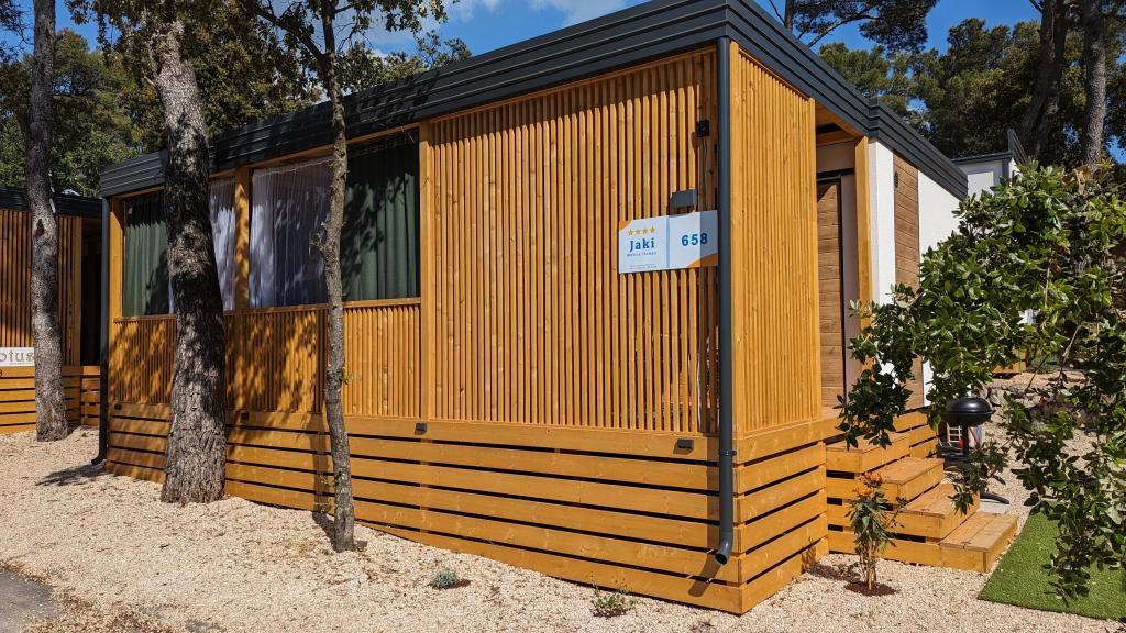 Godetevi la natura e il comfort: case mobili Jaki al campeggio Soline, Biograd na Moru. Situate in una zona tranquilla del campeggio a 4 stelle, circondate da pinete, le nostre case mobili modernamente attrezzate sono ideali per un massimo di 6 persone. Godetevi la vicinanza alla spiaggia (2-5 minuti a piedi), a negozi e ristoranti e al lungomare che conduce al centro città (15 minuti). Queste case offrono 2 camere da letto e 2 bagni, un soggiorno, un'ampia terrazza con tavolo da pranzo e zona lounge e una cucina completamente attrezzata: lavastoviglie, microonde, macchina per il caffè, tostapane, frullatore, barbecue all'aperto. La casa include anche Wi-Fi gratuito, parcheggio gratuito proprio accanto alla casa, Smart TV, aria condizionata, asciugamani e biancheria da letto. Il campeggio offre numerosi servizi per tutta la famiglia: splendide spiagge di sabbia e ciottoli che si estendono fino al centro città, un ristorante con specialità mediterranee, un parco giochi per bambini, attività sportive e noleggio biciclette. Dalmaland, il più grande parco acquatico a tema della Croazia, è raggiungibile in 15 minuti di auto.