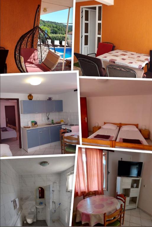 Gli appartamenti moderni e contemporanei con piscina a Okrug Gornji, sul lato meridionale di Čiovo, hanno una bellissima vista sul mare e sulle isole di Solta, Brać e Hvar. La struttura si trova a 10 minuti a piedi dalla spiaggia, a 15 minuti a piedi dal centro del paese dove c'è l'ufficio postale, banca, farmacia, supermercato... la struttura dispone di un appartamento per 5 persone al 2° piano, un appartamento per 3 persone al piano rialzato. Ogni appartamento ha il proprio piano, il proprio ingresso, la propria terrazza e posto auto semi-coperto. Tutti gli appartamenti condividono una piscina, un camino e un cortile.