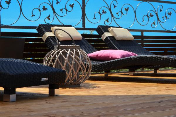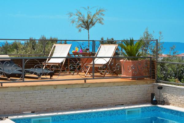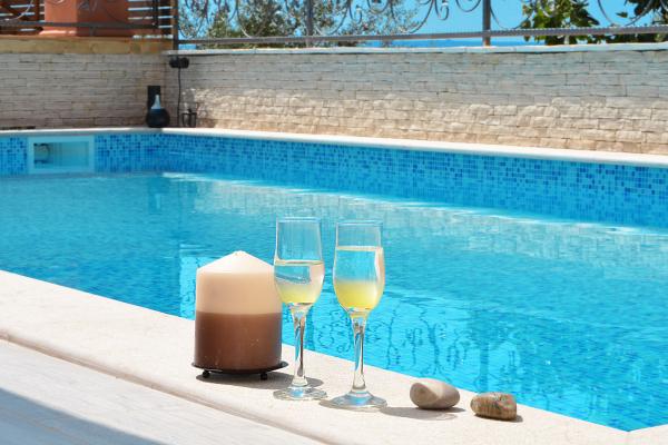 Di fronte alla casa c'è una grande piscina idromassaggio 35m2 attrezzata con sedie a sdraio, altalene, tavolo e sedie e un barbecue.