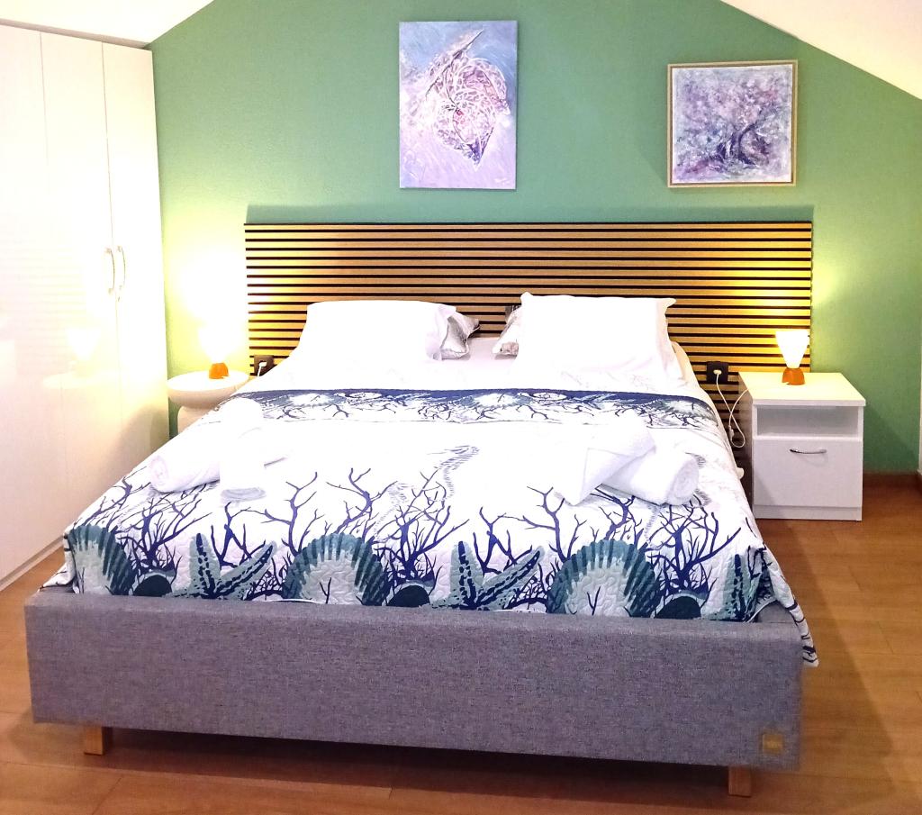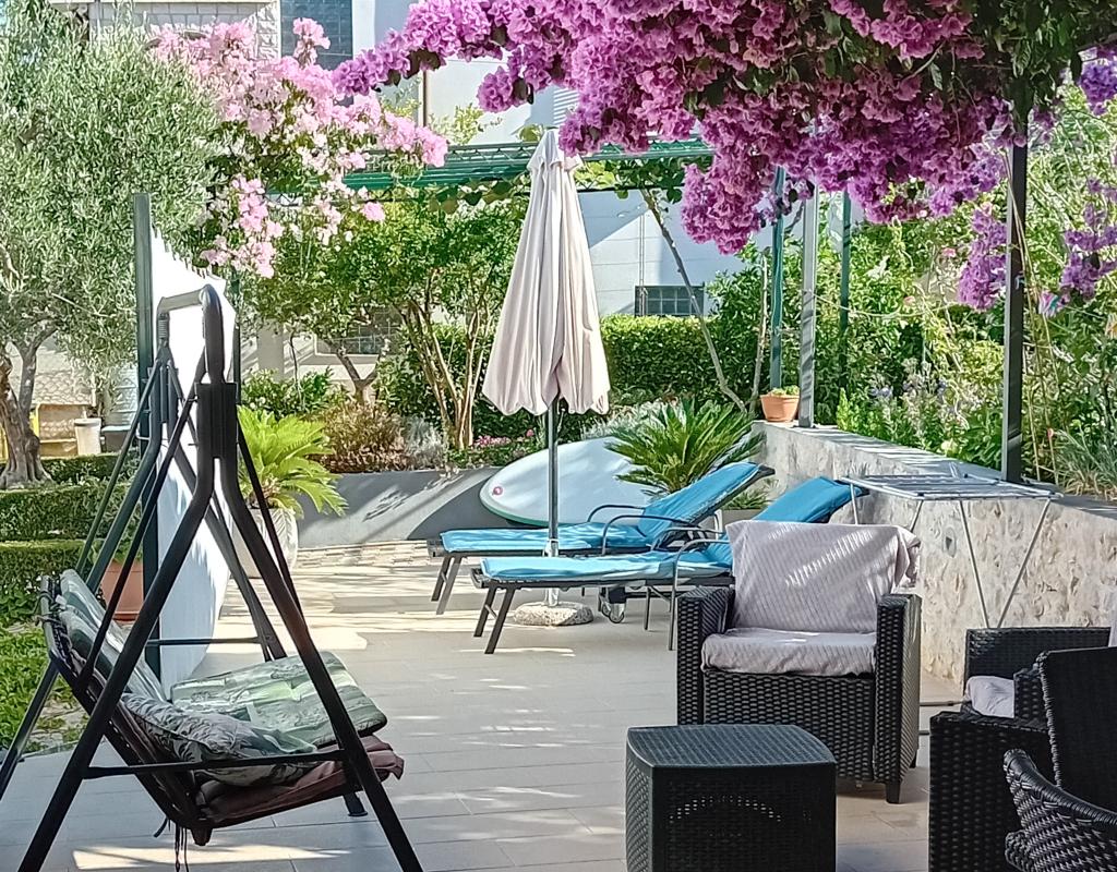 Appartamento modernamente arredato con vista mare, ampia terrazza e giardino, vicino alla spiaggia, 4 stelle. L'appartamento si trova in una casa (piano terra e primo piano). Al piano terra si trovano: ingresso, cucina, soggiorno e bagno. Il soggiorno è dotato di un divano letto per due persone. Al primo piano si trovano: camera da letto, bagno (con doccia e WC separati) e un balcone coperto di 10 m² con vista mare. La camera da letto ha un comodo letto matrimoniale e una poltrona che si trasforma in un lettino. La cucina al piano terra conduce a una terrazza di 45 m². Il barbecue e il tavolo da pranzo si trovano nella parte coperta (15 m²), mentre la parte rimanente è un'area per prendere il sole e rilassarsi con vista sul giardino.
