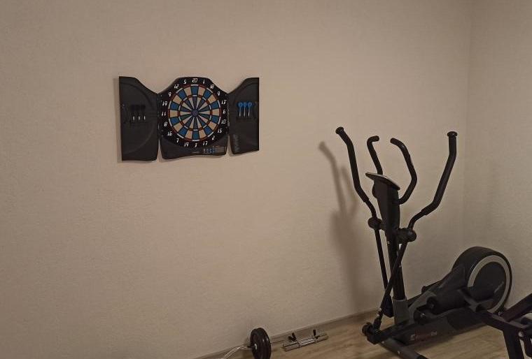 La sala fitness e intrattenimento nel seminterrato, inclusa nel prezzo, è dotata di attrezzi ginnici, un trainer ellittico, un calcio balilla, freccette e una bicicletta, ideali per lo svago e il divertimento in famiglia.