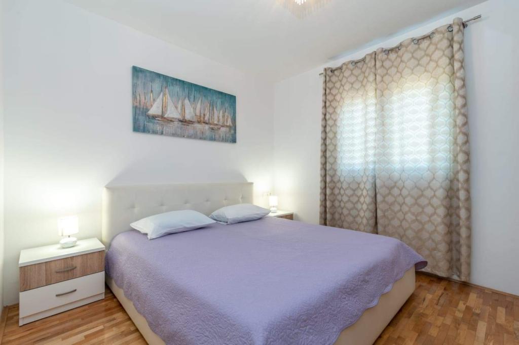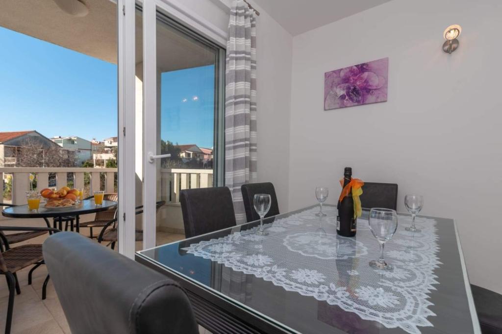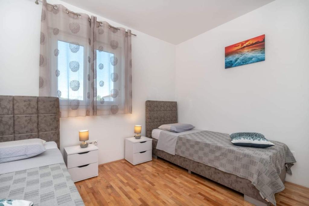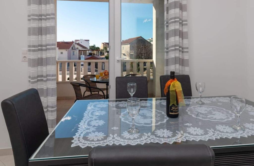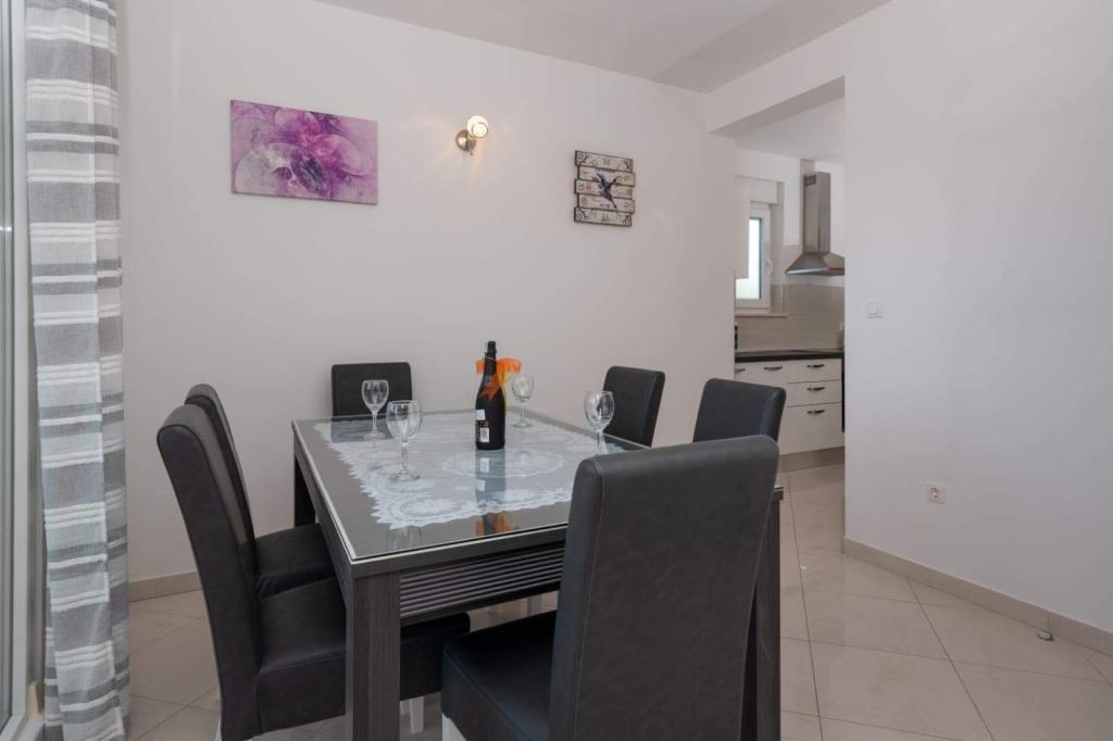 L'appartamento si trova sull'isola di Čiovo, in una tranquilla baia di Okrug Gornji - Rastići, ideale per una vacanza in famiglia. Dista 200 m dalle spiagge rocciose e 400 m dalle spiagge sabbiose, mentre la famosa spiaggia di Copacabana dista 1,6 km. La città di Trogir, patrimonio dell'UNESCO, si trova a pochi chilometri di distanza. L'appartamento si trova al primo piano, ha una superficie di 72,5 m² con un balcone di 7 m² e può ospitare fino a 6 persone (7 se necessario), inclusa una culla. Gli ospiti possono usufruire di aria condizionata, Wi-Fi gratuito e parcheggio privato. Una caratteristica speciale dell'appartamento è il centro fitness e la sala giochi nel seminterrato, inclusi nel prezzo, dotati di attrezzi ginnici, ellittica, calcio balilla, freccette e una bicicletta, ideali per il tempo libero e il divertimento in famiglia.