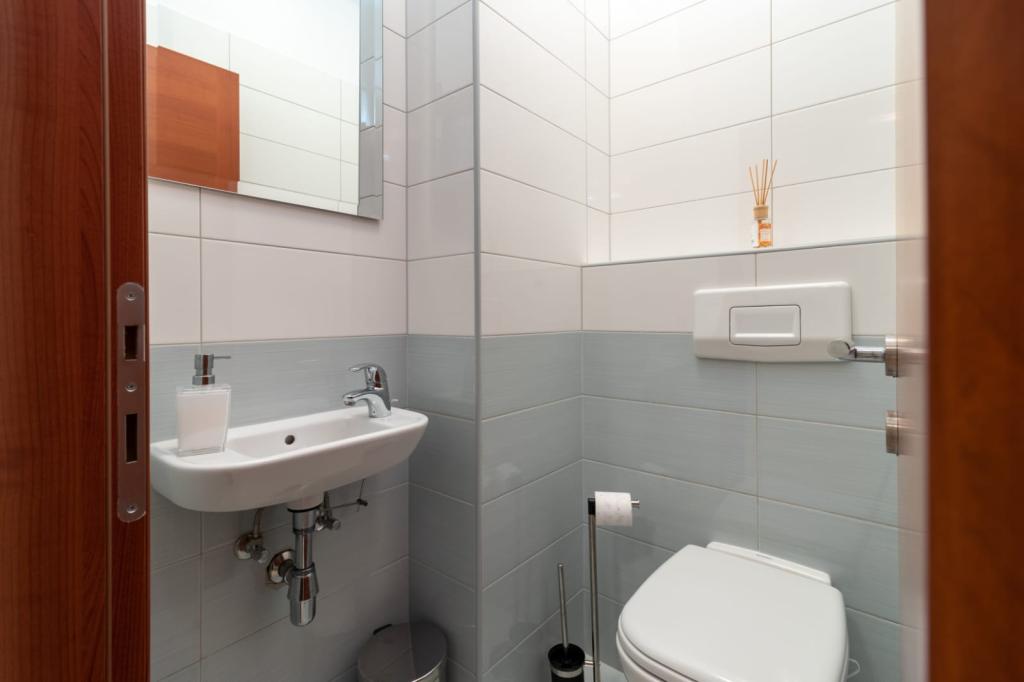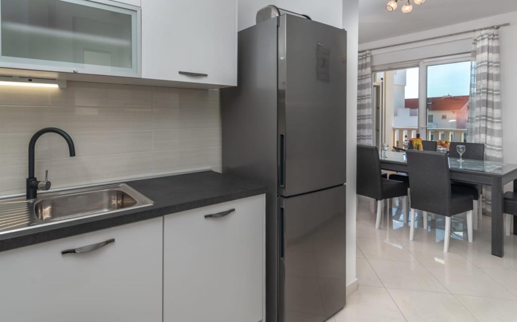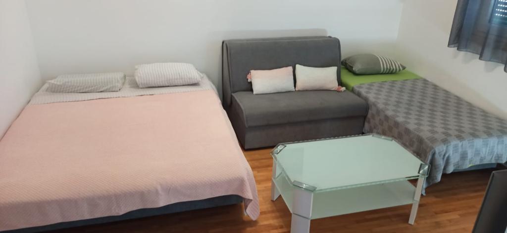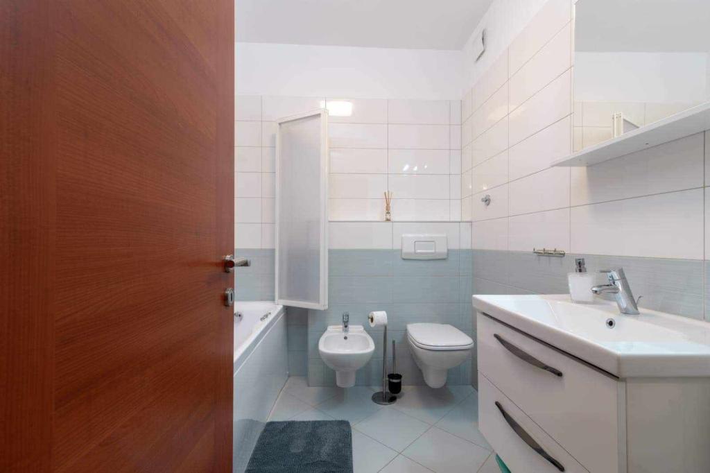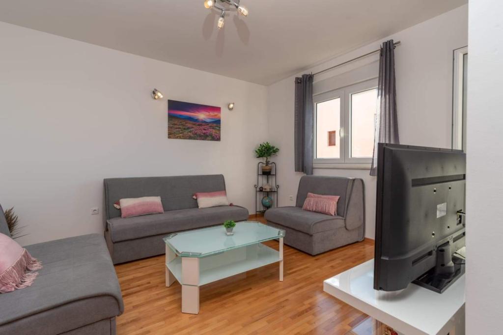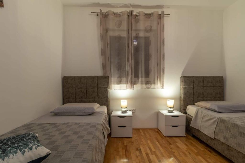 L'appartamento si trova sull'isola di Čiovo, in una tranquilla baia di Okrug Gornji - Rastići, ideale per una vacanza in famiglia. Dista 200 m dalle spiagge rocciose e 400 m dalle spiagge sabbiose, mentre la famosa spiaggia di Copacabana dista 1,6 km. La città di Trogir, patrimonio dell'UNESCO, si trova a pochi chilometri di distanza. L'appartamento si trova al primo piano, ha una superficie di 72,5 m² con un balcone di 7 m² e può ospitare fino a 6 persone (7 se necessario), inclusa una culla. Gli ospiti possono usufruire di aria condizionata, Wi-Fi gratuito e parcheggio privato. Una caratteristica speciale dell'appartamento è il centro fitness e la sala giochi nel seminterrato, inclusi nel prezzo, dotati di attrezzi ginnici, ellittica, calcio balilla, freccette e una bicicletta, ideali per il tempo libero e il divertimento in famiglia.