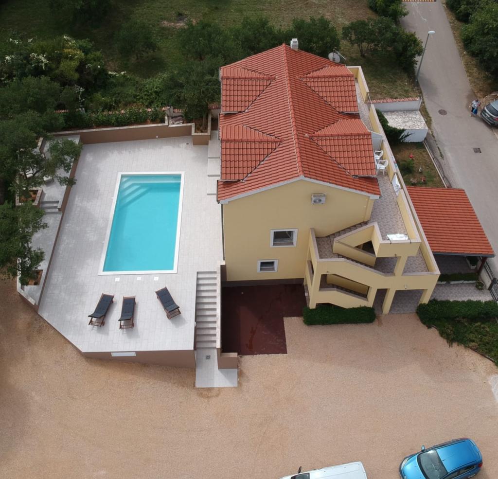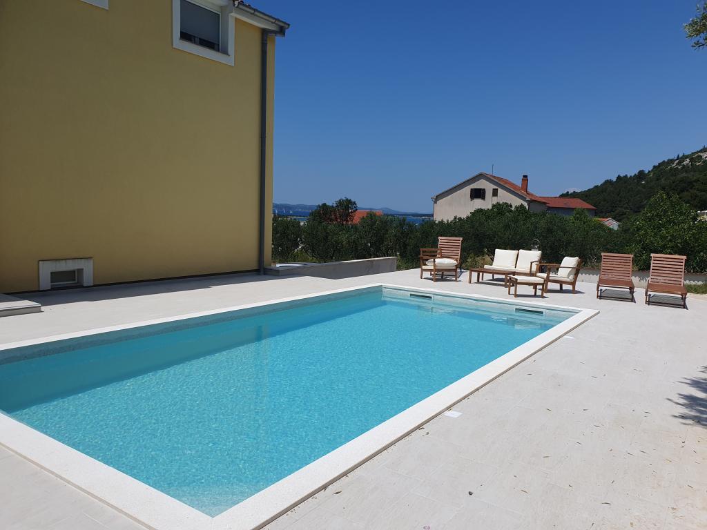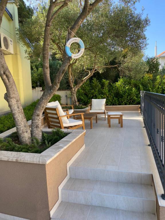 Appartamenti nuovi e completamente attrezzati con vista mare, piscina, TV satellitare, aria condizionata, cucina, bagno con doccia, a 2-3 minuti a piedi dal mare. La proprietà è situata in uno splendido uliveto che si estende su circa 2500 m², con molti fiori e verde. Piscina di nuova costruzione di 32 m² con area nuoto di 200 m² e vista mare. Barbecue disponibile per uso comune. L'appartamento numero 1 è composto da: 3 stanze (di cui 2 camere da letto), 55 m², 4+2 persone. Ingresso al piano terra, tramite la terrazza nel soggiorno. Piano terra: camera da letto 1 con letto matrimoniale, soggiorno con cucina e zona soggiorno, camera da letto 2 con letto matrimoniale e divano letto, bagno/doccia, terrazza. Gli appartamenti 2 e 3 sono composti da 2 stanze di cui 1 camera da letto, soggiorno con cucina e zona soggiorno, bagno/doccia, balcone. Relax House è composta da 3 stanze, di cui 2 camere da letto, nel soggiorno c'è una cucina e un divano letto, bagno/doccia, terrazza. La casa vacanze è composta da 3 stanze, di cui 2 camere da letto, soggiorno e bagno/doccia, terrazza.