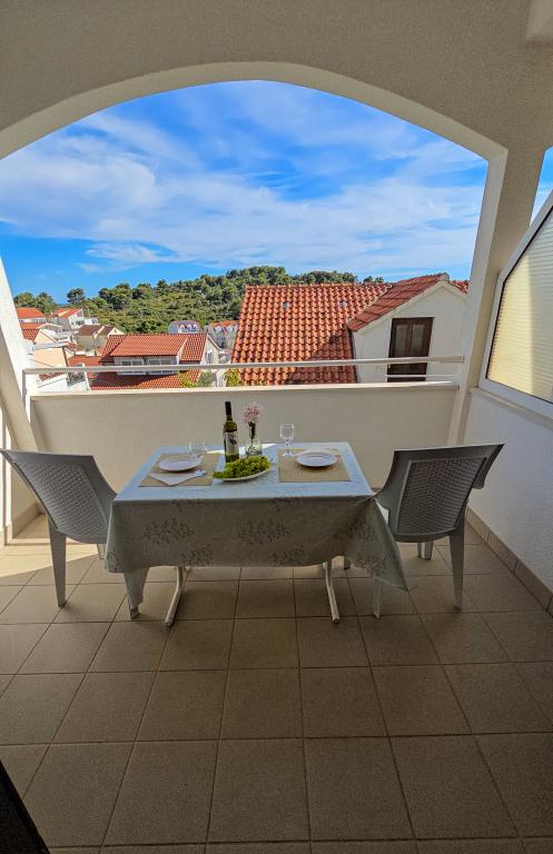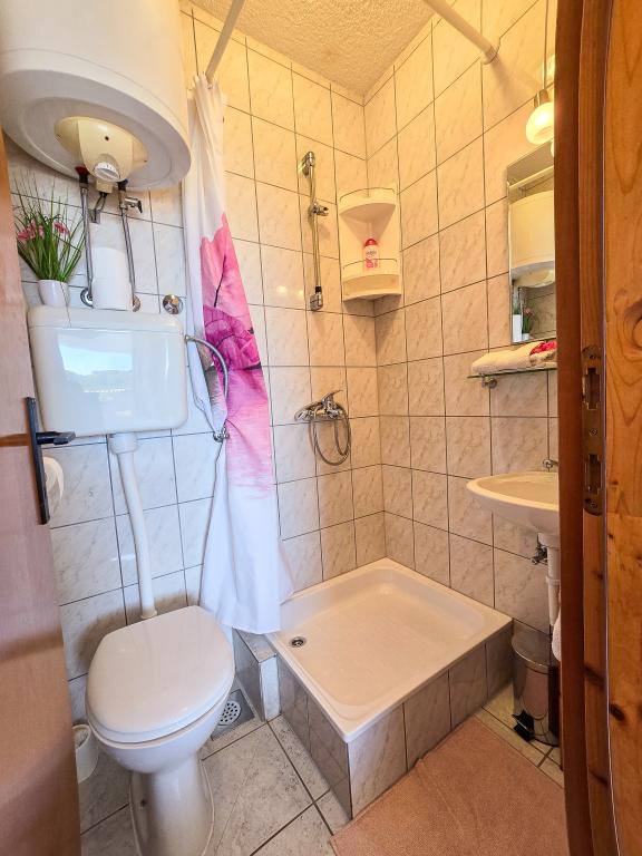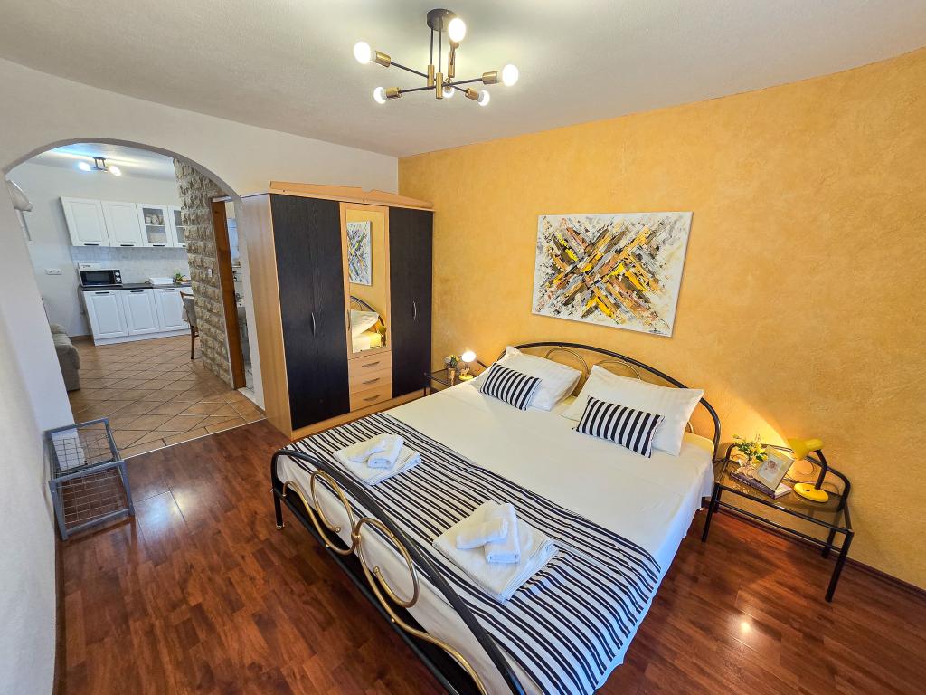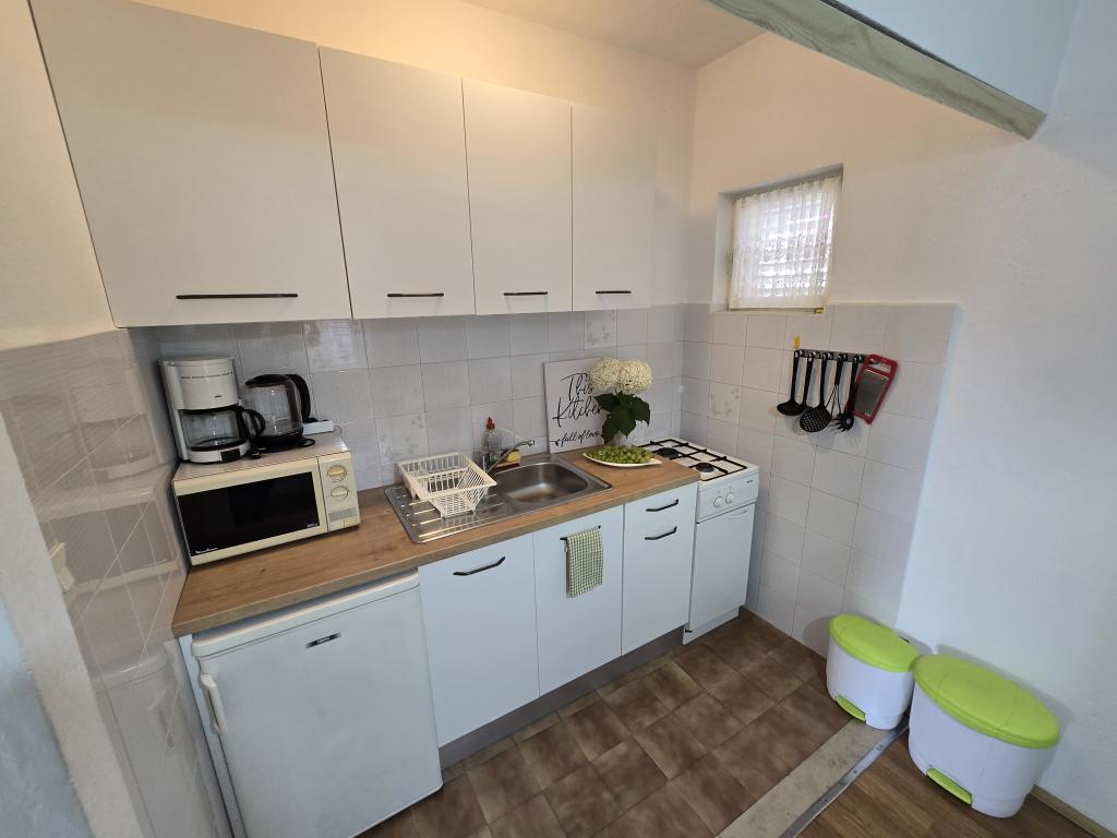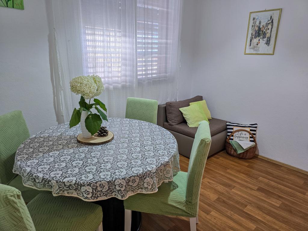Grande smjetsaj, ottima vista dal balcone, appartamenti molto ordinate; Persone molto cordiali, discreti, e molto accessibile a tutte le informazioni. Zona tranquilla, parcheggio proprio di fronte alla casa, negozio di alimentari vicino, 15 minuti a piedi dal centro. Plaza a bada Pokonji lungo il bellissimo, mare pulito, con diversi ristoranti, vicino al sentiero per la spiaggia ripida (grande formazione), ma ha un modo per aggirare da raggiungere in auto. Estremamente soddisfatto.