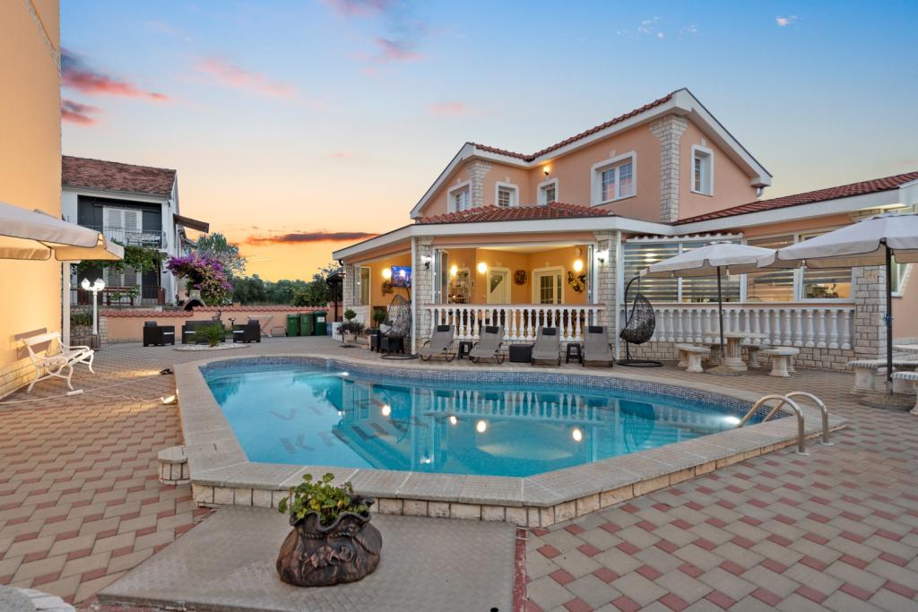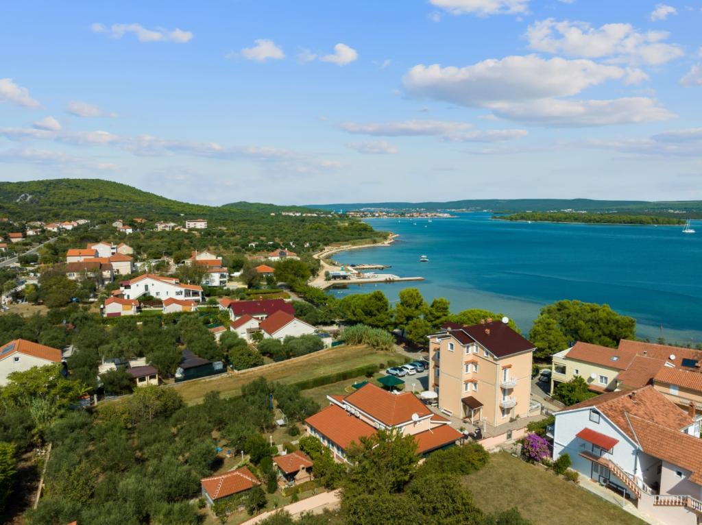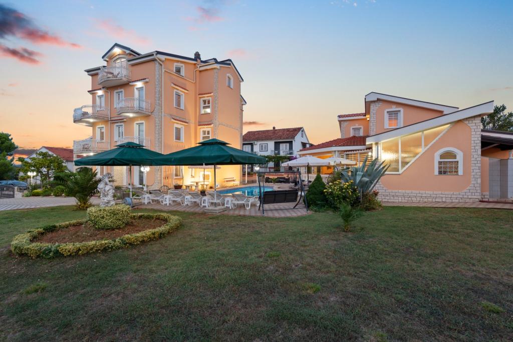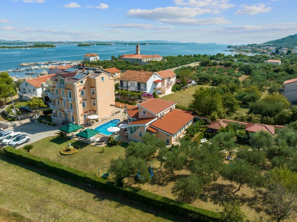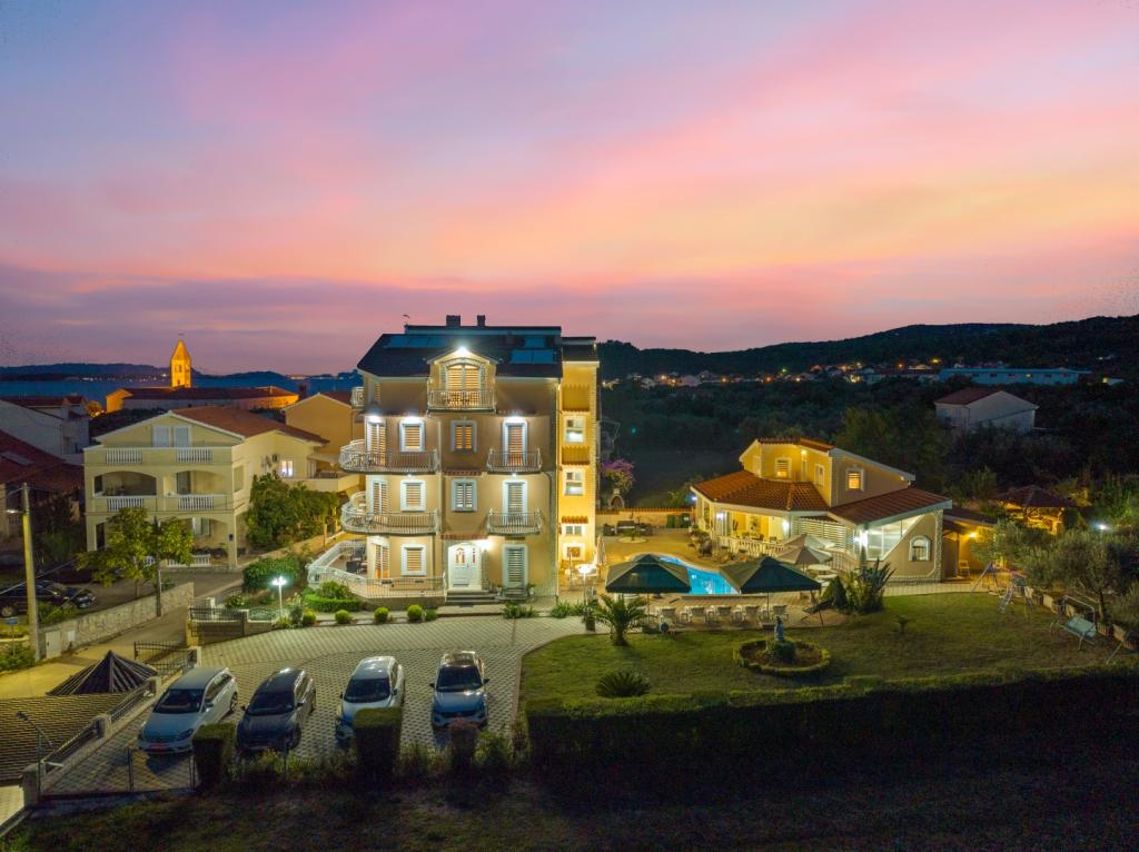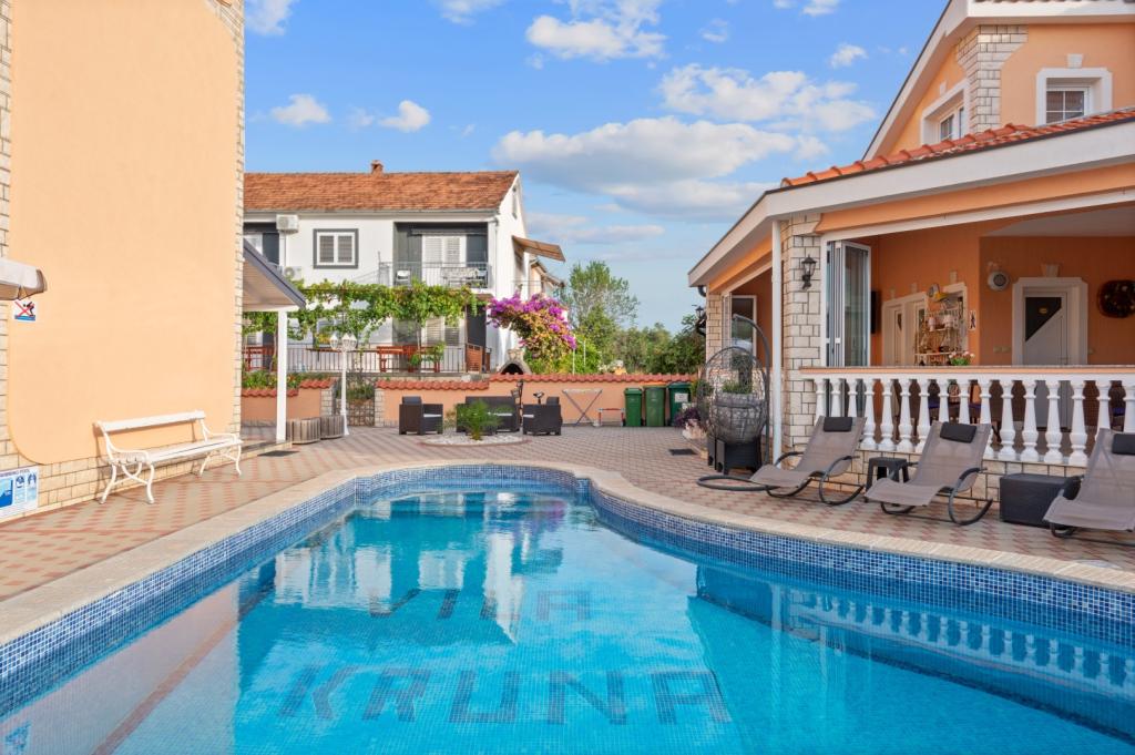 Crown Villa è un lussuoso albergo a 4 stelle che può ospitare comodamente 30 persone. Villa è il primo di una serie, situato in una splendida posizione proprio sulla spiaggia di sabbia con vista sul canale di Pasman. Giardino con una ricca vegetazione mediterranea che circonda la villa e la rende particolarmente attraente. Nel giardino c'è una piscina riscaldata con illuminazione. La villa dispone di 7 suite spaziose, ognuna decorata in modo speciale. Ogni appartamento dispone di balcone o terrazza privata con vista sulle ville mare, spiaggia e giardino.