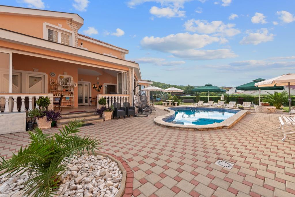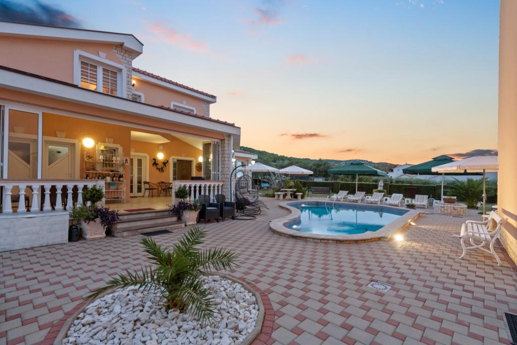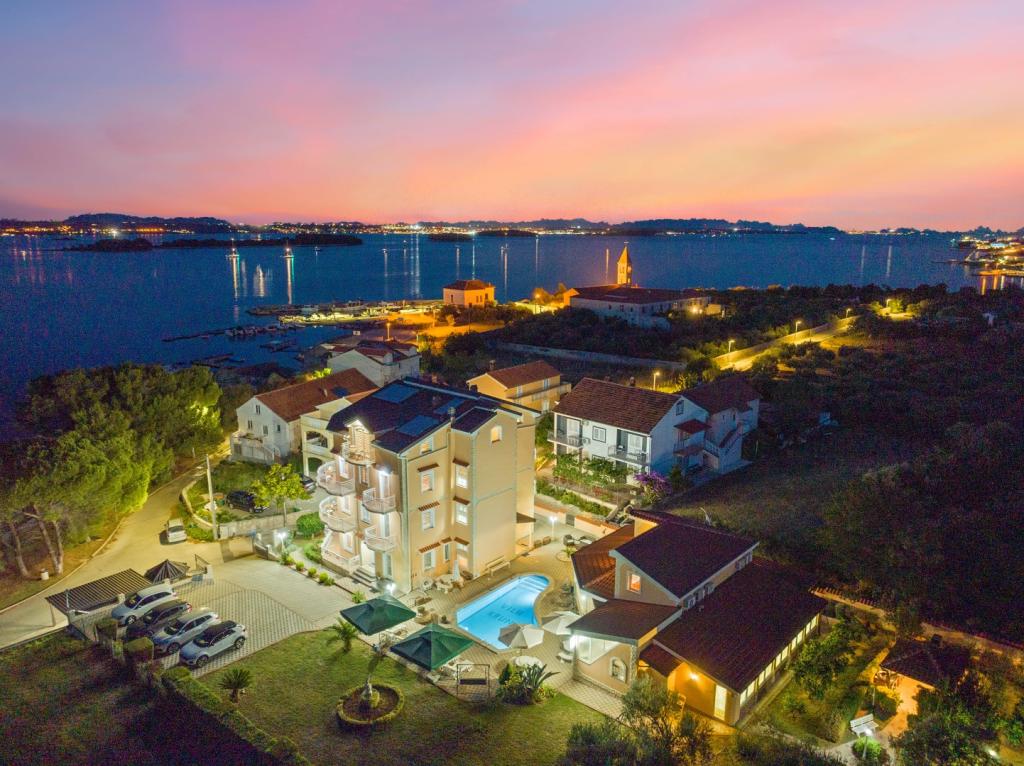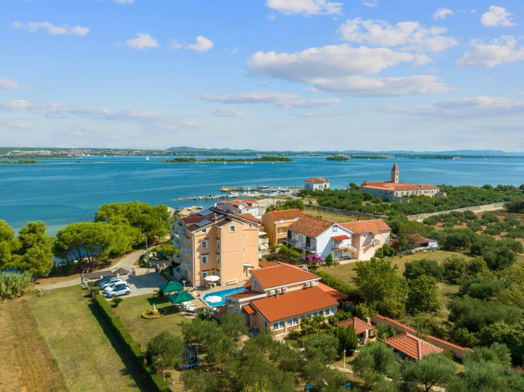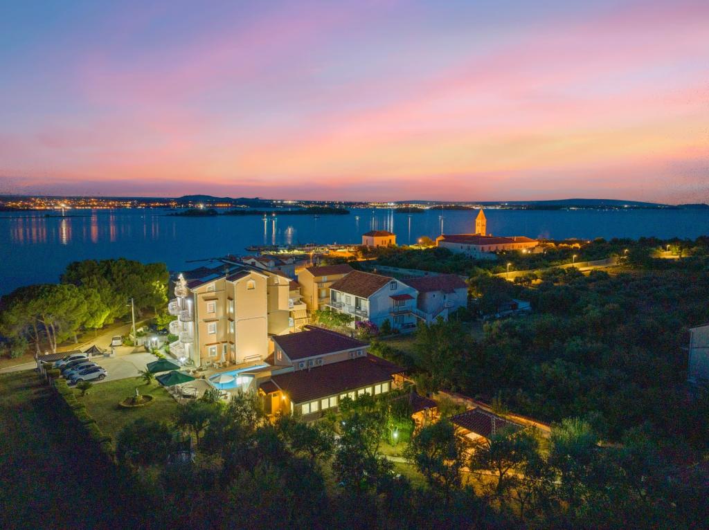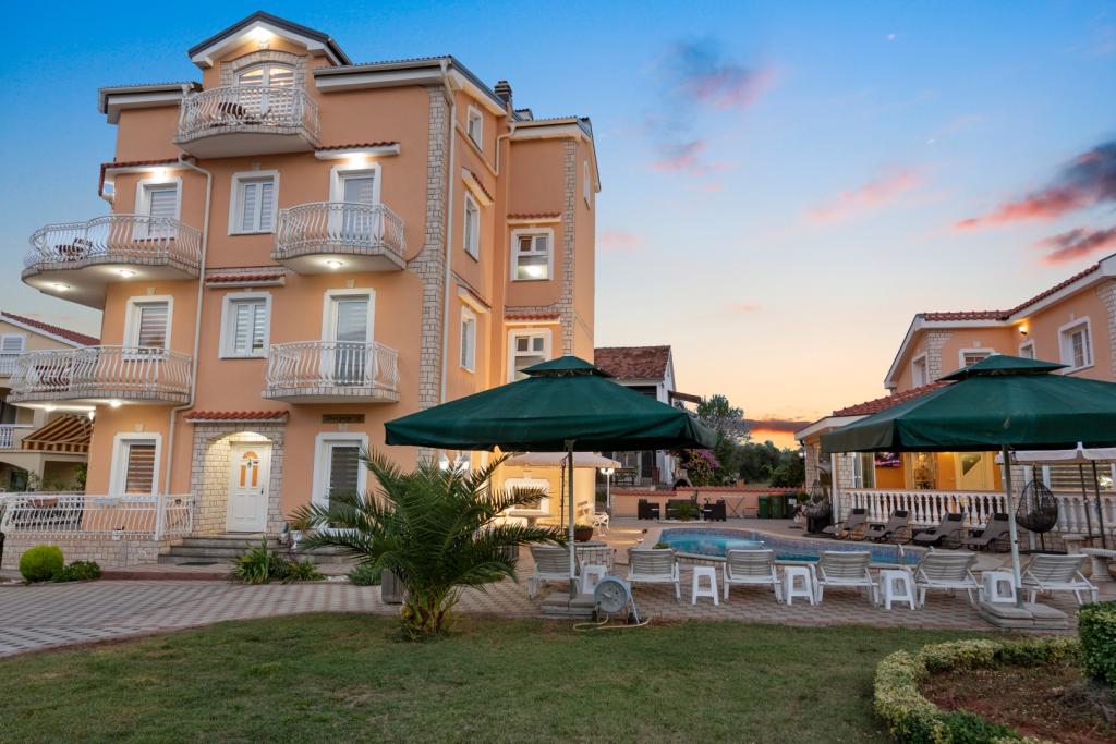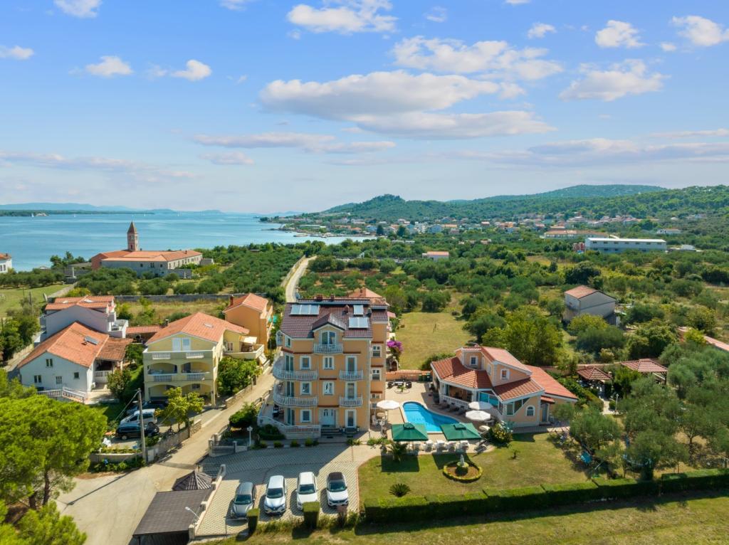 Crown Villa è un lussuoso albergo a 4 stelle che può ospitare comodamente 30 persone. Villa è il primo di una serie, situato in una splendida posizione proprio sulla spiaggia di sabbia con vista sul canale di Pasman. Giardino con una ricca vegetazione mediterranea che circonda la villa e la rende particolarmente attraente. Nel giardino c'è una piscina riscaldata con illuminazione. La villa dispone di 7 suite spaziose, ognuna decorata in modo speciale. Ogni appartamento dispone di balcone o terrazza privata con vista sulle ville mare, spiaggia e giardino.