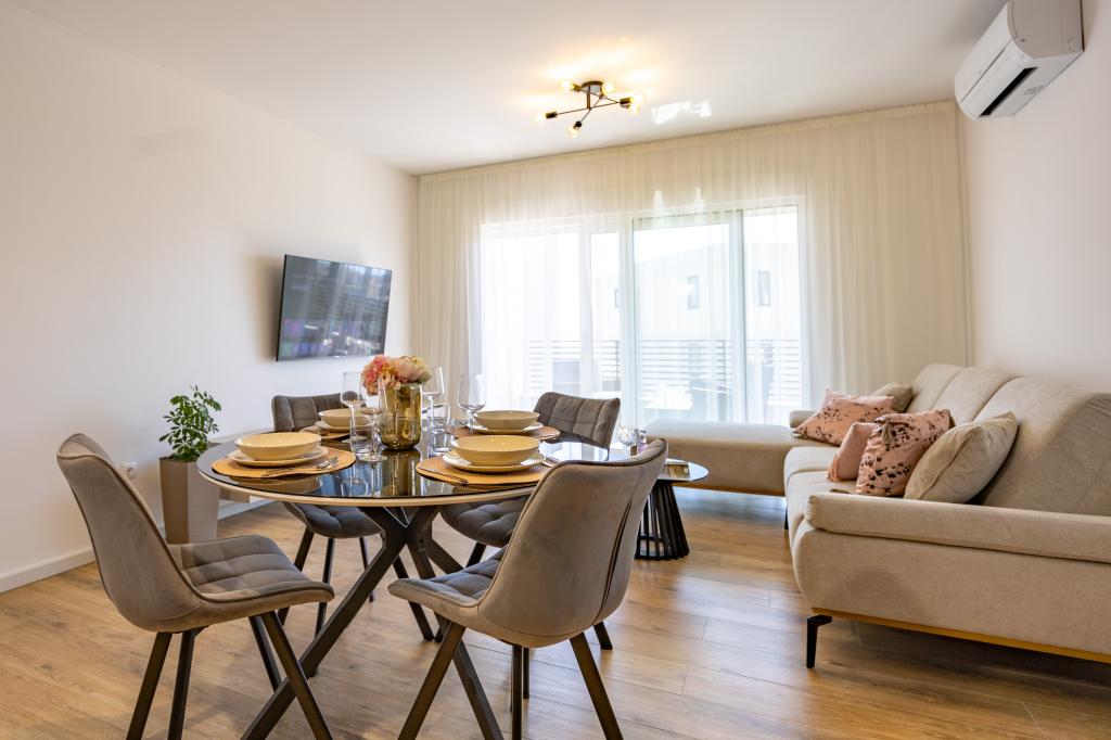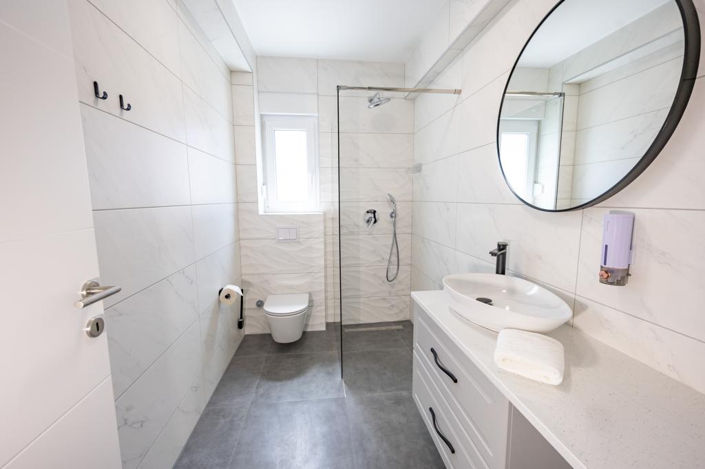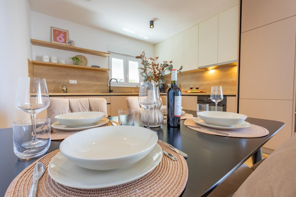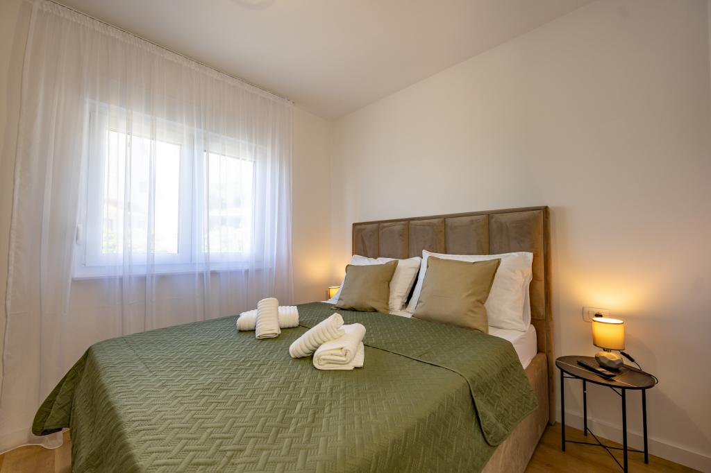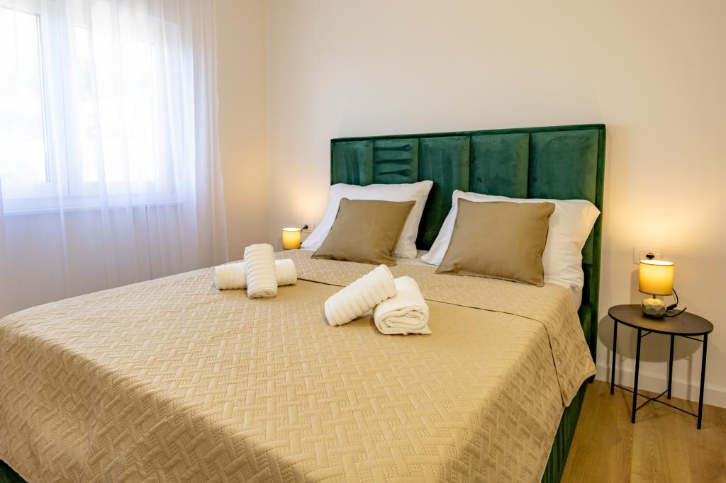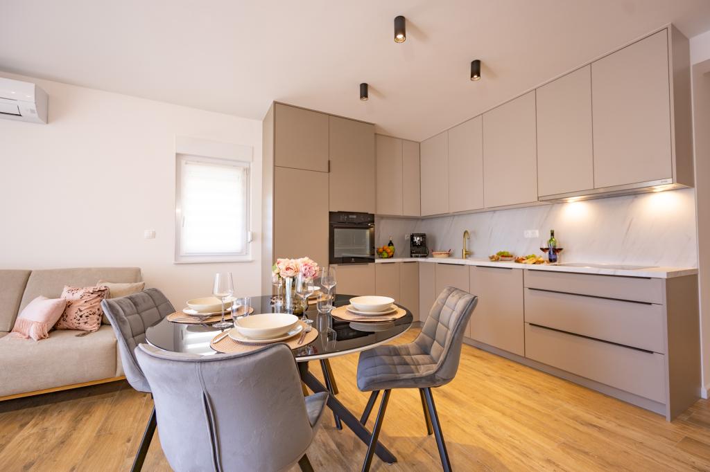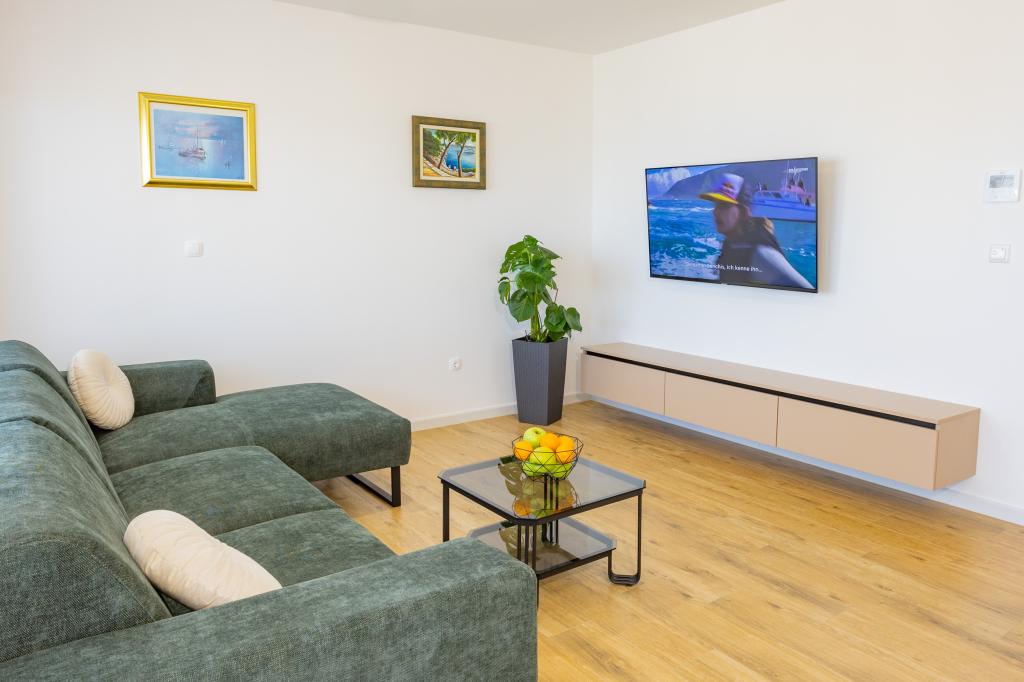 Ogni appartamento è caratterizzato da un design moderno e da interni recentemente rinnovati. Nell'ampio soggiorno, arredato con mobili di buon gusto e dettagli contemporanei, vi sentirete come a casa. Il concetto di open space collega naturalmente il soggiorno con una cucina completamente attrezzata, dove vi attendono eleganti piani di lavoro, elettrodomestici di qualità e tutto lo spazio necessario per preparare i vostri piatti preferiti. La zona giorno si apre su un piacevole balcone, il luogo ideale per un caffè mattutino o per rilassarsi la sera con un bicchiere di vino e un indimenticabile tramonto sull'Adriatico. Ogni appartamento dispone di due comode camere da letto con letti matrimoniali, dotate di morbida biancheria e ampio spazio per riporre gli oggetti, un bagno moderno e un WC aggiuntivo. Gli appartamenti sono climatizzati e completamente attrezzati: TV/SAT, internet, lavatrice, lavastoviglie, macchina per il caffè e tutto il necessario per un soggiorno piacevole e spensierato.