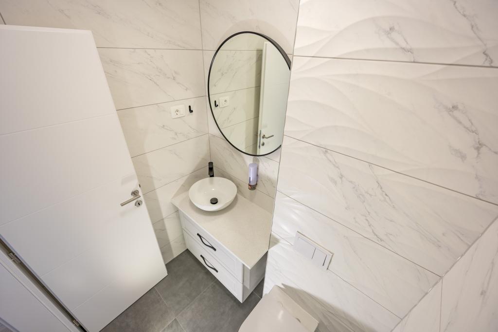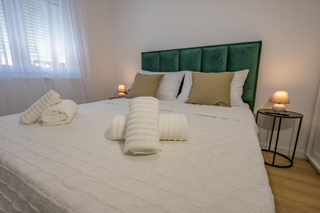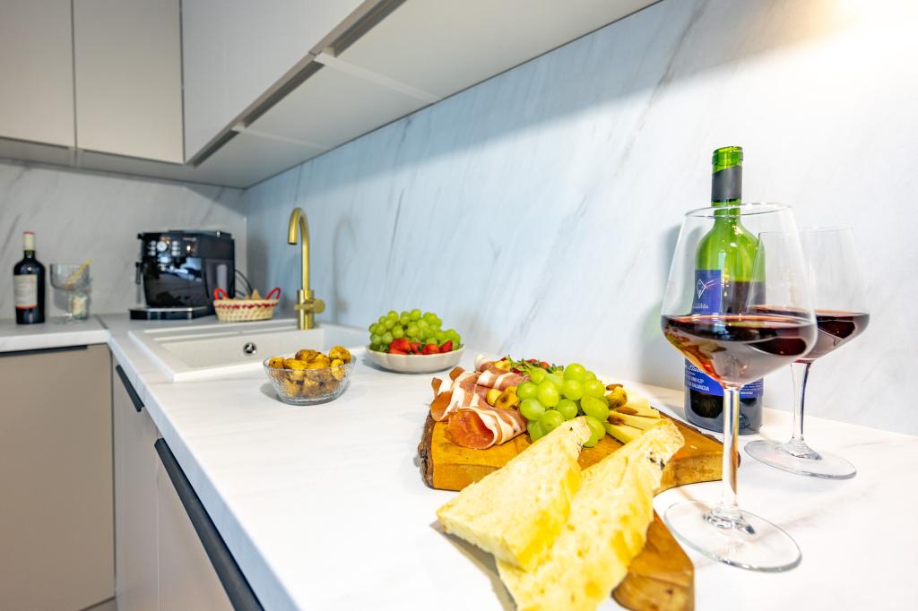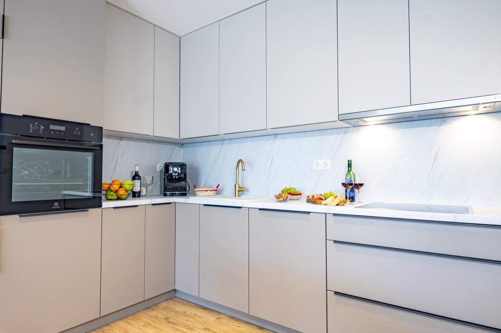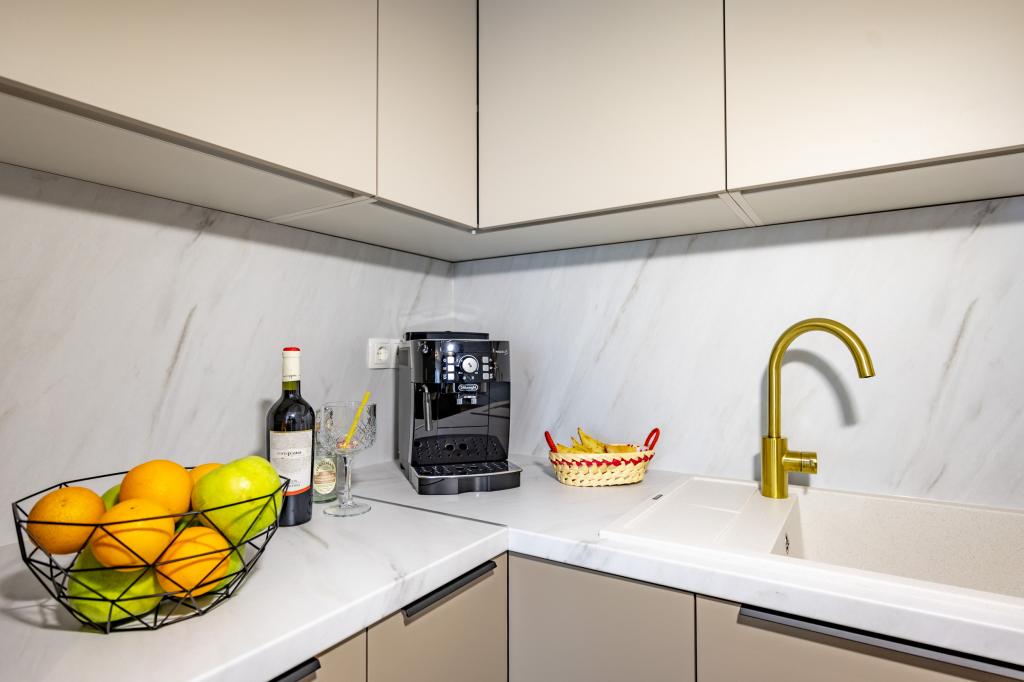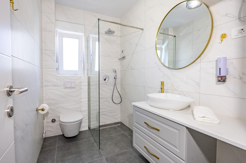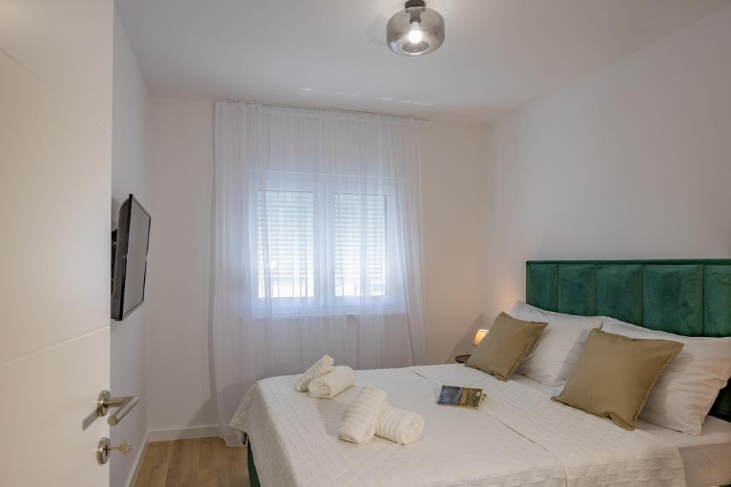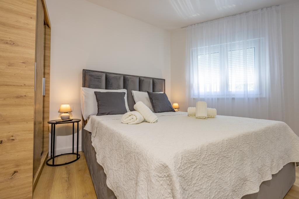 Ogni appartamento è caratterizzato da un design moderno e da interni recentemente rinnovati. Nell'ampio soggiorno, arredato con mobili di buon gusto e dettagli contemporanei, vi sentirete come a casa. Il concetto di open space collega naturalmente il soggiorno con una cucina completamente attrezzata, dove vi attendono eleganti piani di lavoro, elettrodomestici di qualità e tutto lo spazio necessario per preparare i vostri piatti preferiti. La zona giorno si apre su un piacevole balcone, il luogo ideale per un caffè mattutino o per rilassarsi la sera con un bicchiere di vino e un indimenticabile tramonto sull'Adriatico. Ogni appartamento dispone di due comode camere da letto con letti matrimoniali, dotate di morbida biancheria e ampio spazio per riporre gli oggetti, un bagno moderno e un WC aggiuntivo. Gli appartamenti sono climatizzati e completamente attrezzati: TV/SAT, internet, lavatrice, lavastoviglie, macchina per il caffè e tutto il necessario per un soggiorno piacevole e spensierato.