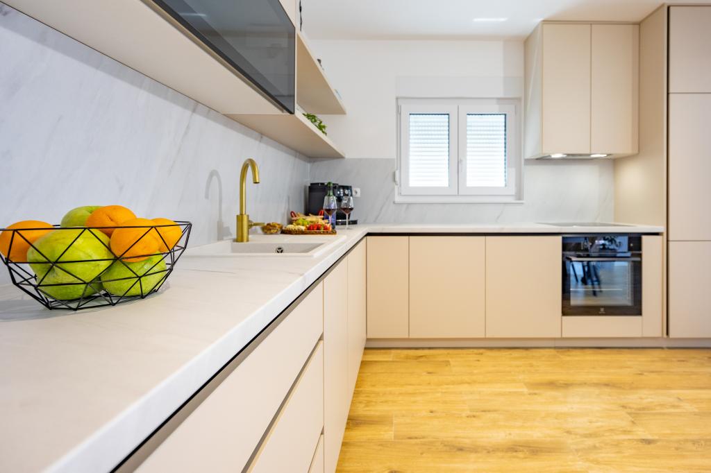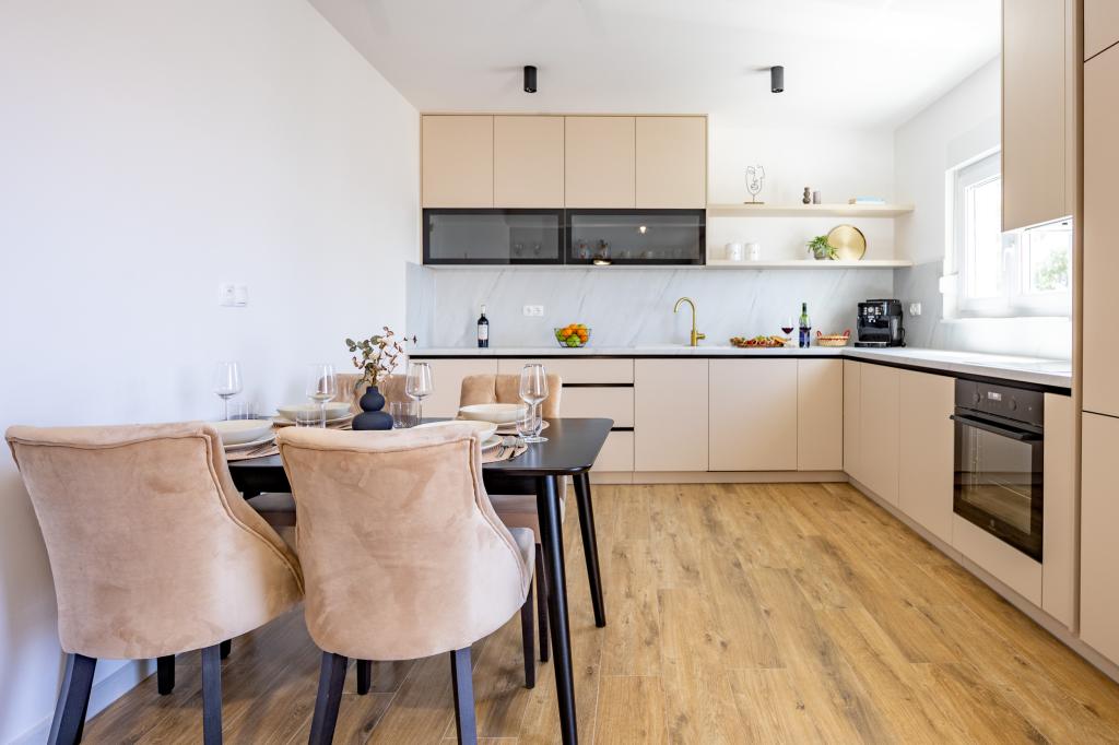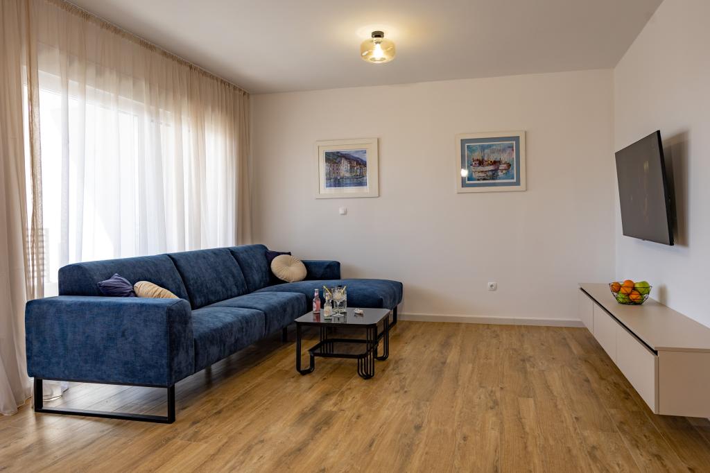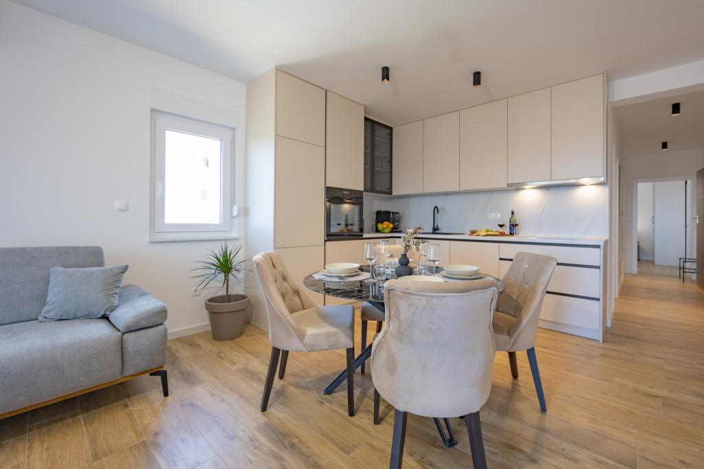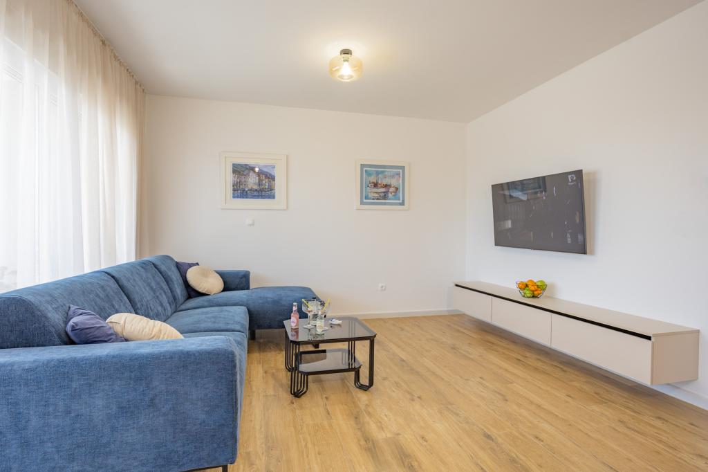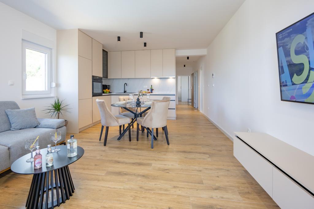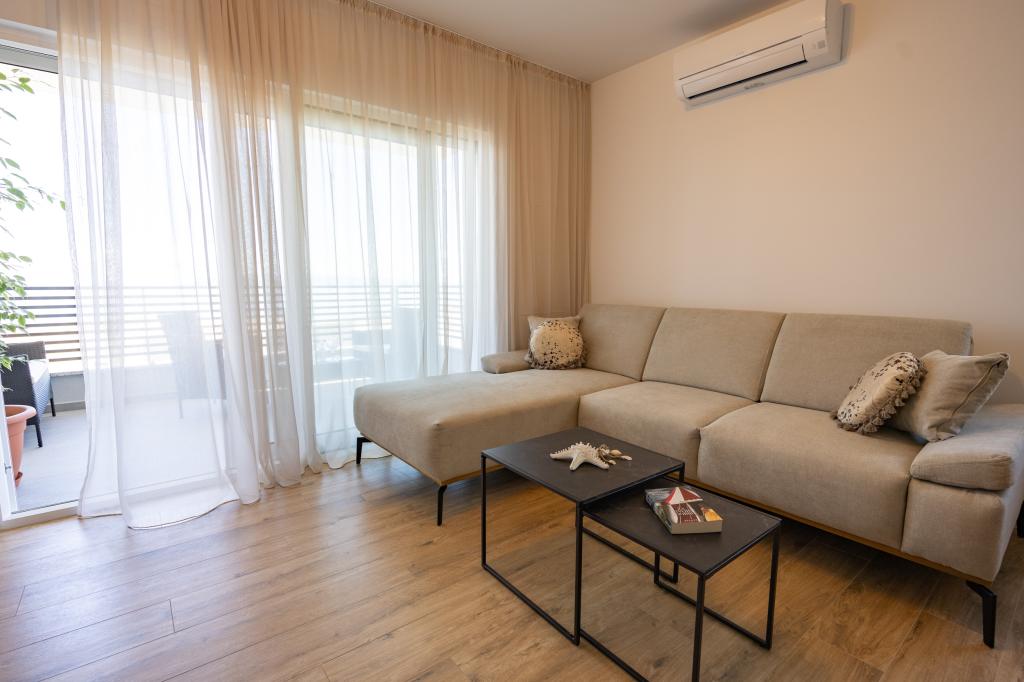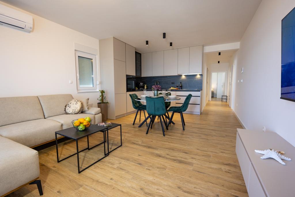 Ogni appartamento è caratterizzato da un design moderno e da interni recentemente rinnovati. Nell'ampio soggiorno, arredato con mobili di buon gusto e dettagli contemporanei, vi sentirete come a casa. Il concetto di open space collega naturalmente il soggiorno con una cucina completamente attrezzata, dove vi attendono eleganti piani di lavoro, elettrodomestici di qualità e tutto lo spazio necessario per preparare i vostri piatti preferiti. La zona giorno si apre su un piacevole balcone, il luogo ideale per un caffè mattutino o per rilassarsi la sera con un bicchiere di vino e un indimenticabile tramonto sull'Adriatico. Ogni appartamento dispone di due comode camere da letto con letti matrimoniali, dotate di morbida biancheria e ampio spazio per riporre gli oggetti, un bagno moderno e un WC aggiuntivo. Gli appartamenti sono climatizzati e completamente attrezzati: TV/SAT, internet, lavatrice, lavastoviglie, macchina per il caffè e tutto il necessario per un soggiorno piacevole e spensierato.