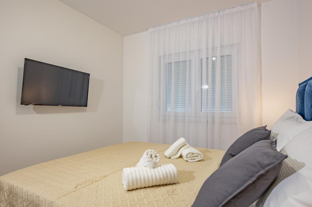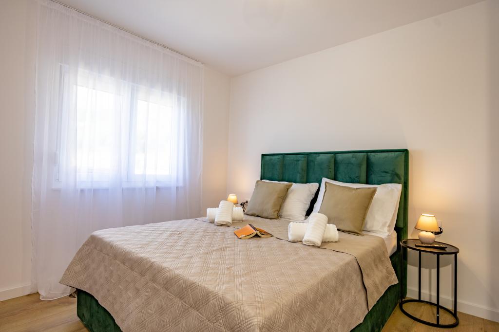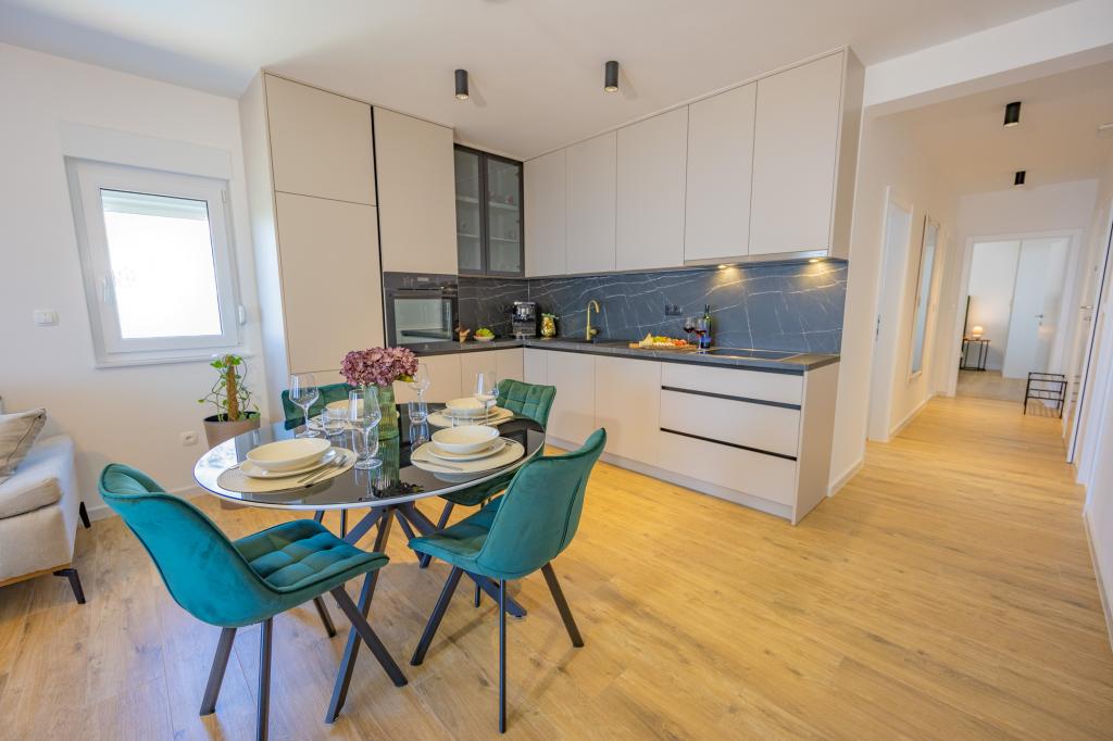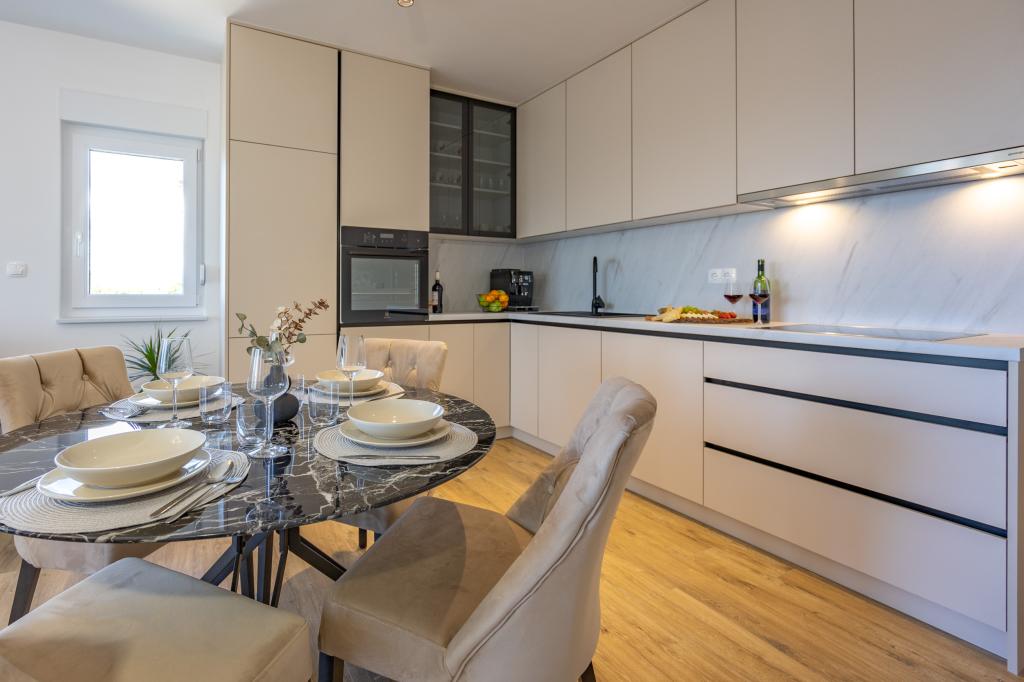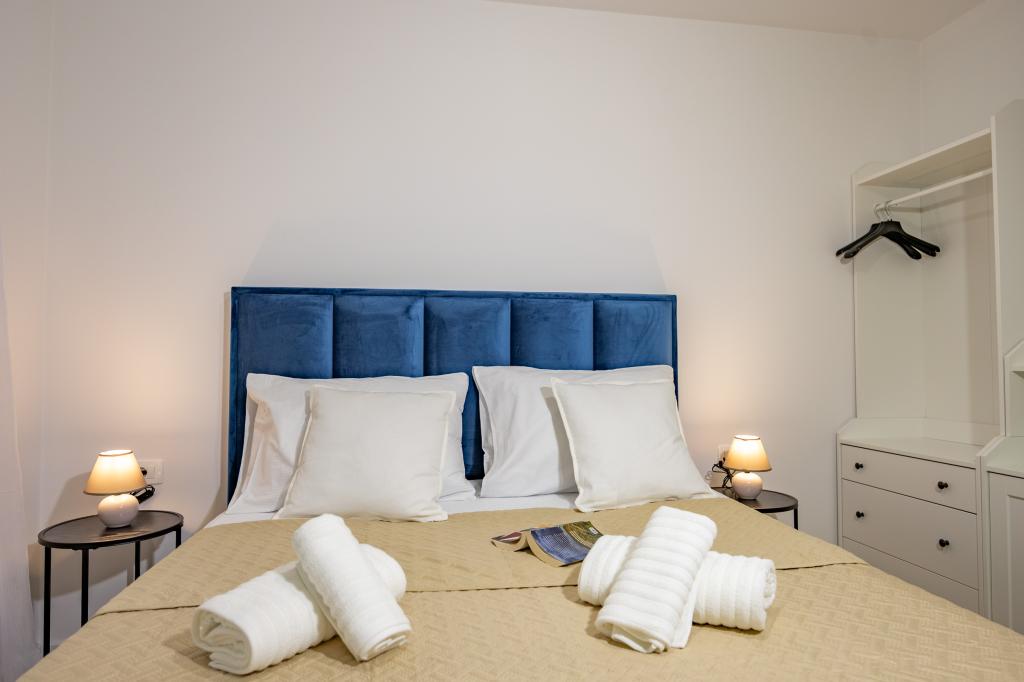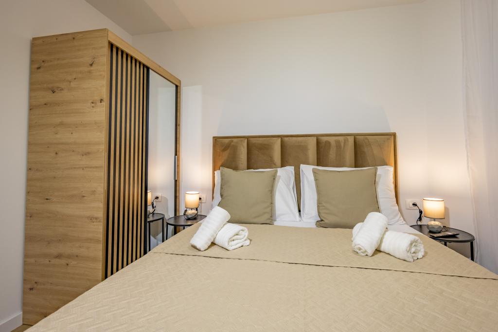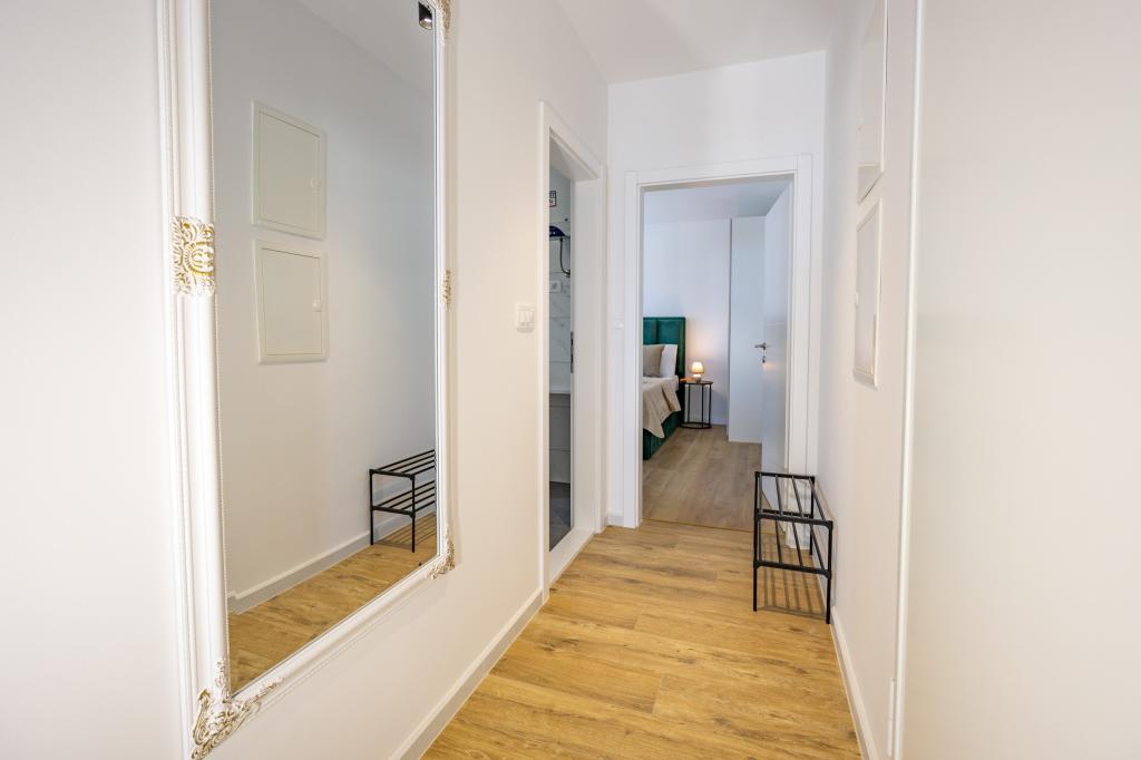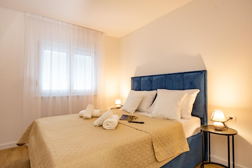 Ogni appartamento è caratterizzato da un design moderno e da interni recentemente rinnovati. Nell'ampio soggiorno, arredato con mobili di buon gusto e dettagli contemporanei, vi sentirete come a casa. Il concetto di open space collega naturalmente il soggiorno con una cucina completamente attrezzata, dove vi attendono eleganti piani di lavoro, elettrodomestici di qualità e tutto lo spazio necessario per preparare i vostri piatti preferiti. La zona giorno si apre su un piacevole balcone, il luogo ideale per un caffè mattutino o per rilassarsi la sera con un bicchiere di vino e un indimenticabile tramonto sull'Adriatico. Ogni appartamento dispone di due comode camere da letto con letti matrimoniali, dotate di morbida biancheria e ampio spazio per riporre gli oggetti, un bagno moderno e un WC aggiuntivo. Gli appartamenti sono climatizzati e completamente attrezzati: TV/SAT, internet, lavatrice, lavastoviglie, macchina per il caffè e tutto il necessario per un soggiorno piacevole e spensierato.