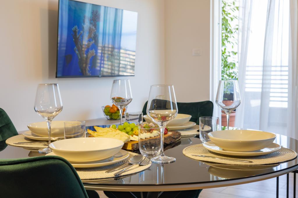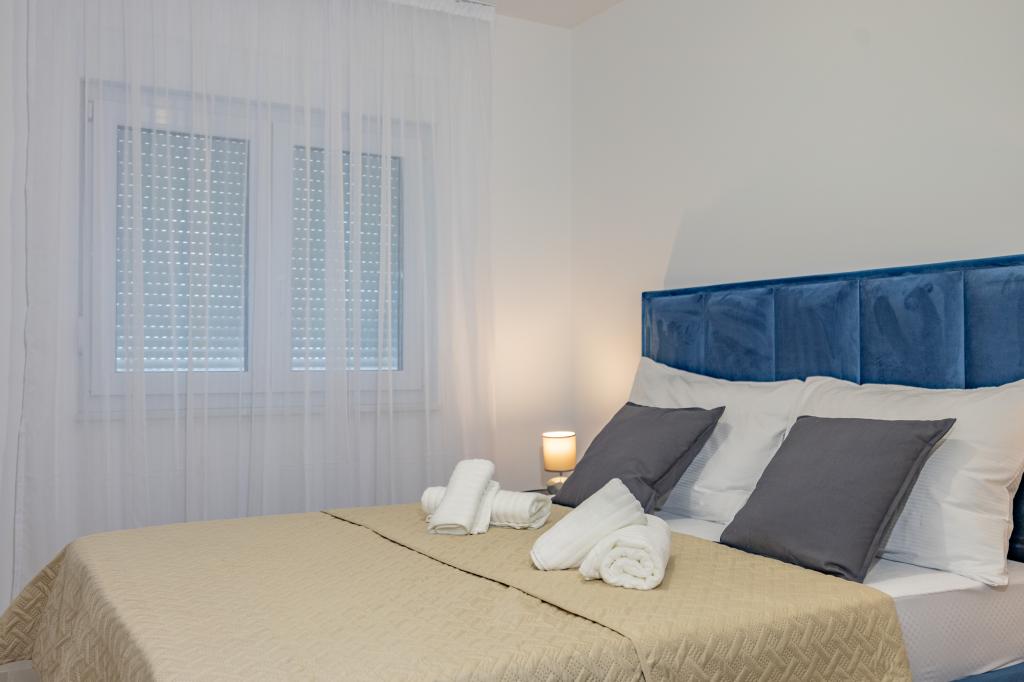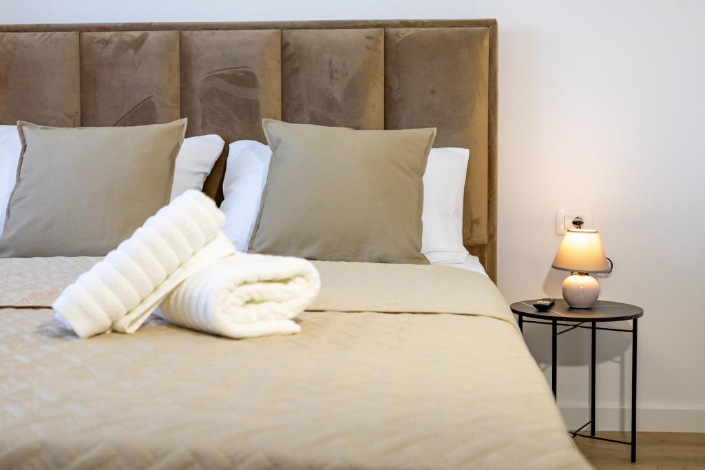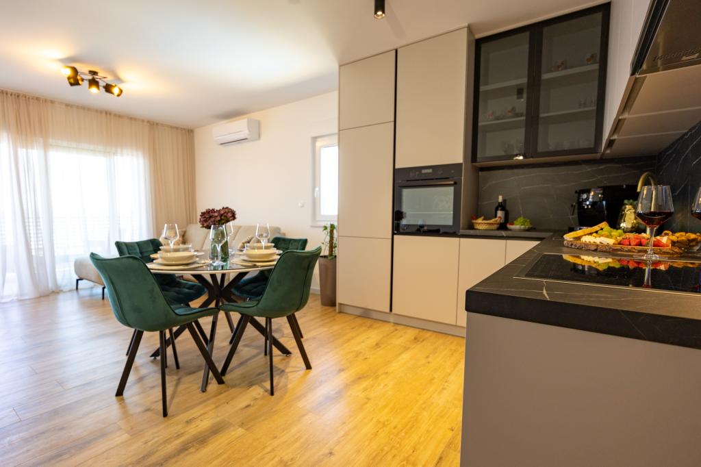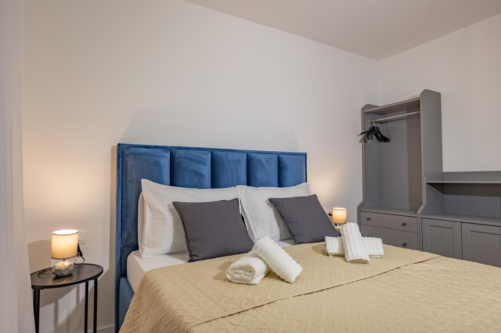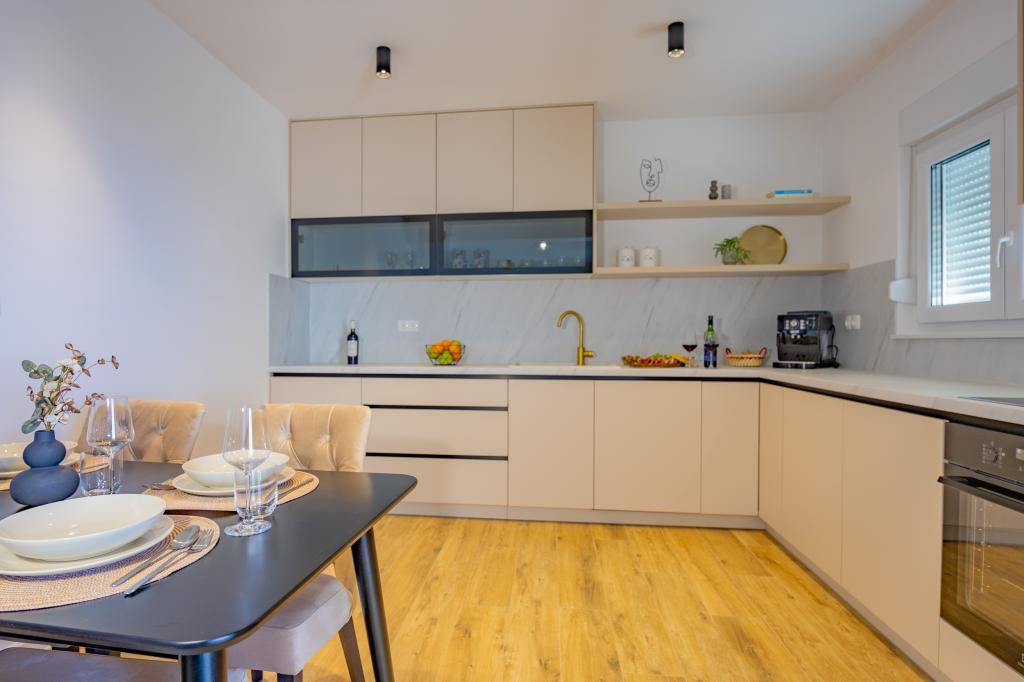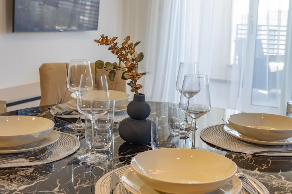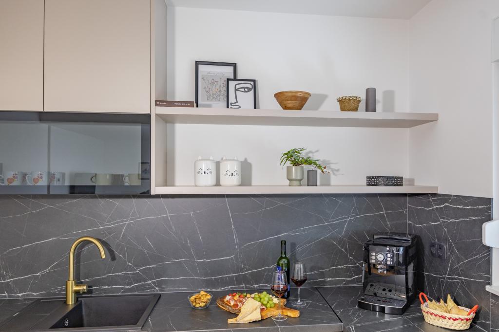Ogni appartamento è caratterizzato da un design moderno e da interni recentemente rinnovati. Nell'ampio soggiorno, arredato con mobili di buon gusto e dettagli contemporanei, vi sentirete come a casa. Il concetto di open space collega naturalmente il soggiorno con una cucina completamente attrezzata, dove vi attendono eleganti piani di lavoro, elettrodomestici di qualità e tutto lo spazio necessario per preparare i vostri piatti preferiti. La zona giorno si apre su un piacevole balcone, il luogo ideale per un caffè mattutino o per rilassarsi la sera con un bicchiere di vino e un indimenticabile tramonto sull'Adriatico. Ogni appartamento dispone di due comode camere da letto con letti matrimoniali, dotate di morbida biancheria e ampio spazio per riporre gli oggetti, un bagno moderno e un WC aggiuntivo. Gli appartamenti sono climatizzati e completamente attrezzati: TV/SAT, internet, lavatrice, lavastoviglie, macchina per il caffè e tutto il necessario per un soggiorno piacevole e spensierato.