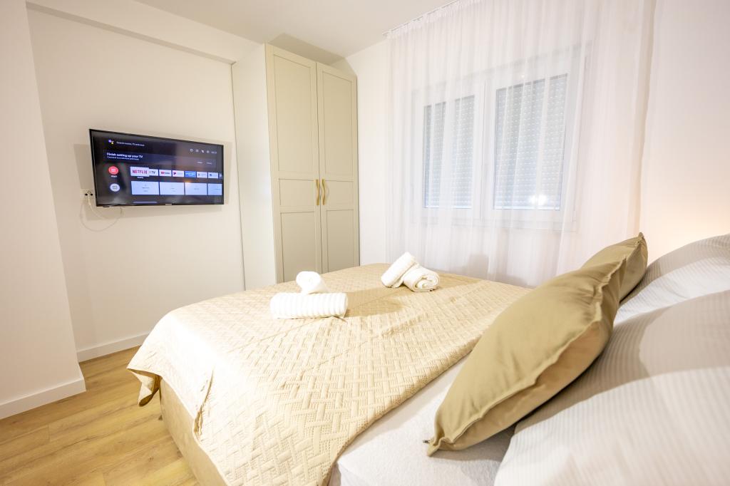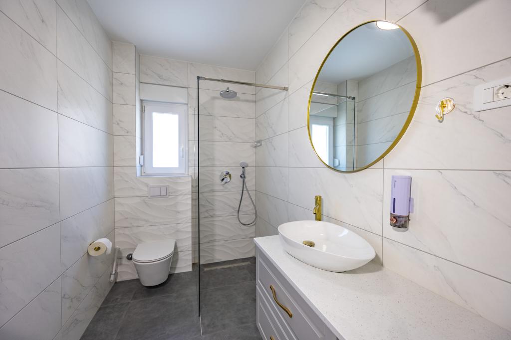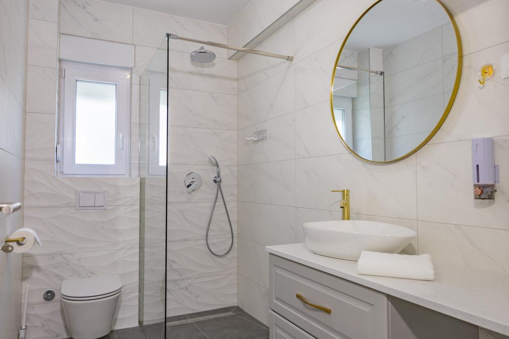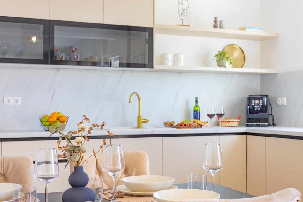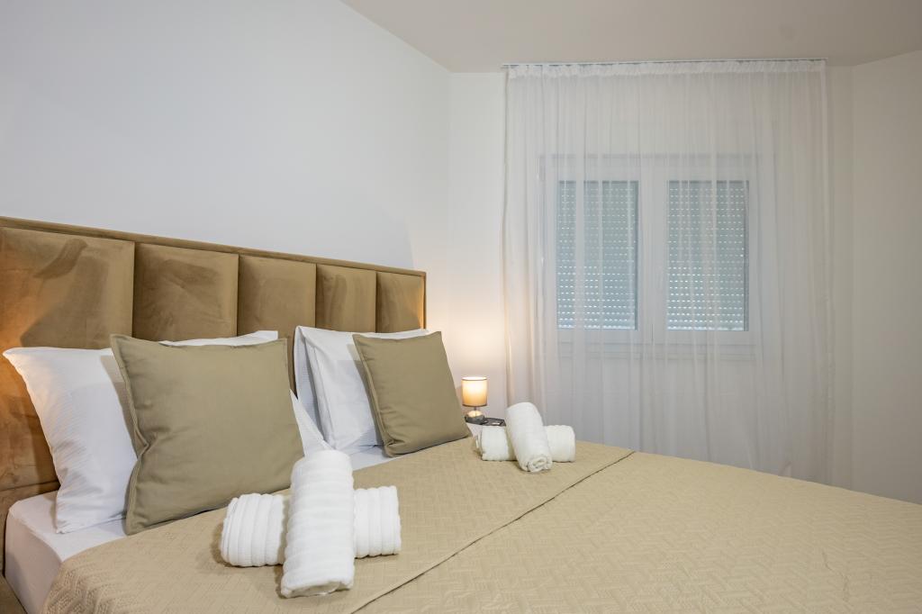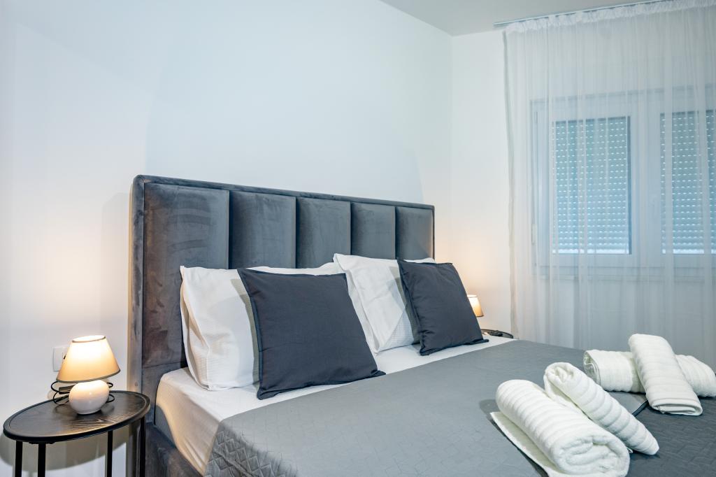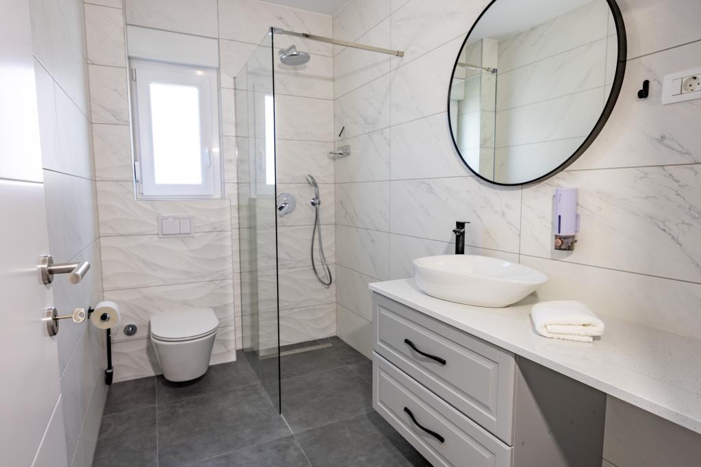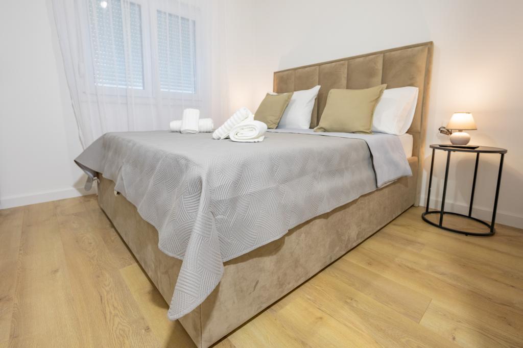 Ogni appartamento è caratterizzato da un design moderno e da interni recentemente rinnovati. Nell'ampio soggiorno, arredato con mobili di buon gusto e dettagli contemporanei, vi sentirete come a casa. Il concetto di open space collega naturalmente il soggiorno con una cucina completamente attrezzata, dove vi attendono eleganti piani di lavoro, elettrodomestici di qualità e tutto lo spazio necessario per preparare i vostri piatti preferiti. La zona giorno si apre su un piacevole balcone, il luogo ideale per un caffè mattutino o per rilassarsi la sera con un bicchiere di vino e un indimenticabile tramonto sull'Adriatico. Ogni appartamento dispone di due comode camere da letto con letti matrimoniali, dotate di morbida biancheria e ampio spazio per riporre gli oggetti, un bagno moderno e un WC aggiuntivo. Gli appartamenti sono climatizzati e completamente attrezzati: TV/SAT, internet, lavatrice, lavastoviglie, macchina per il caffè e tutto il necessario per un soggiorno piacevole e spensierato.