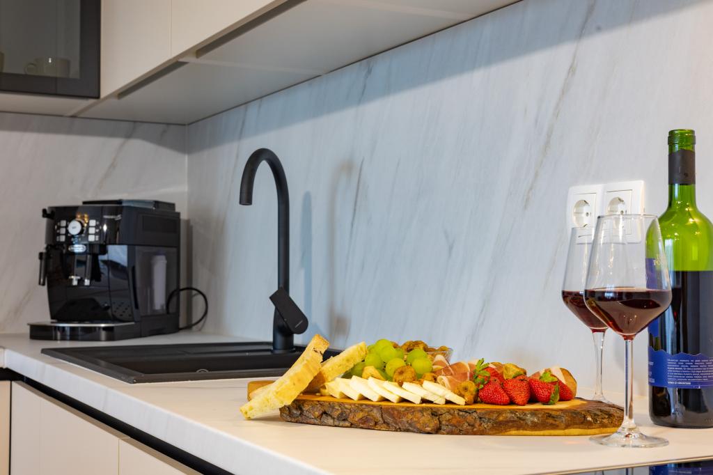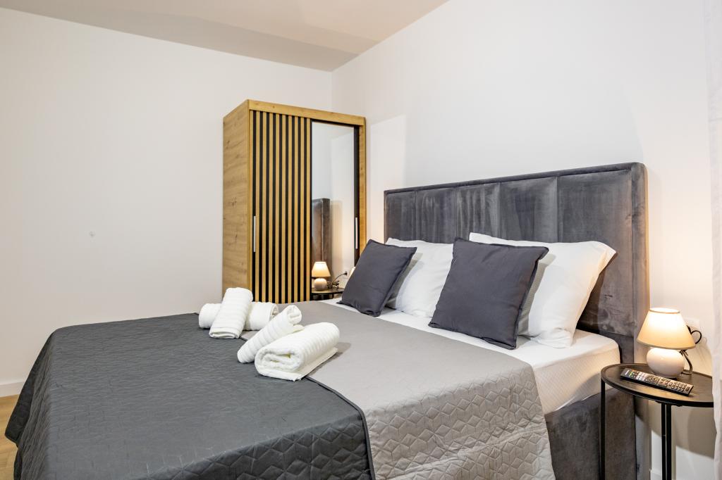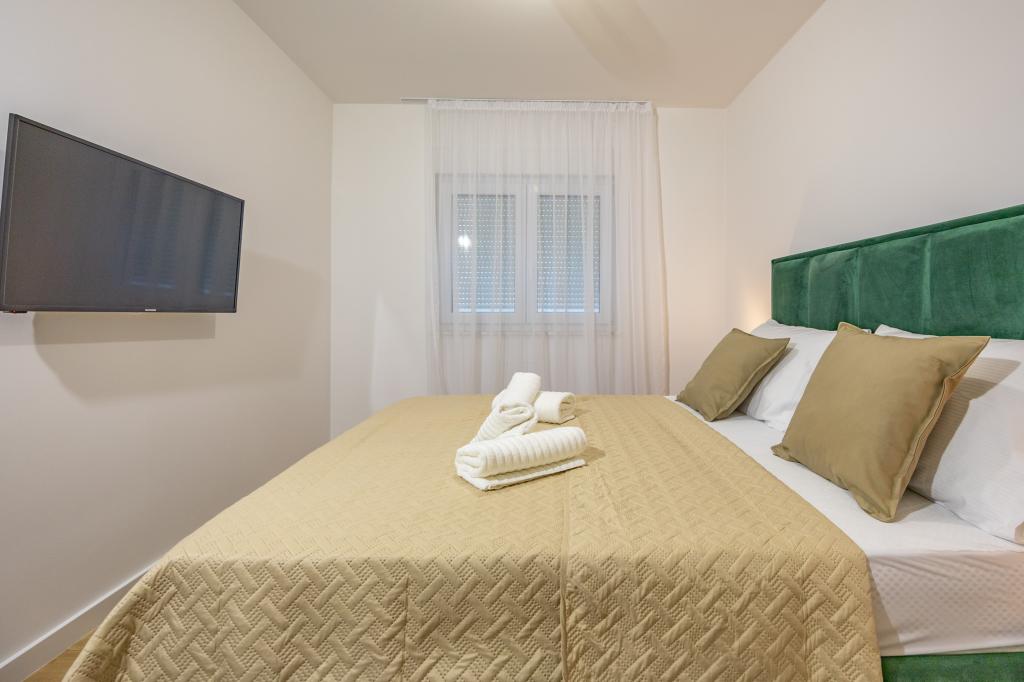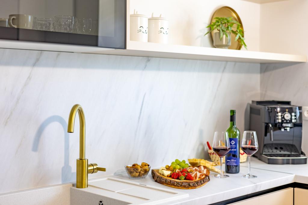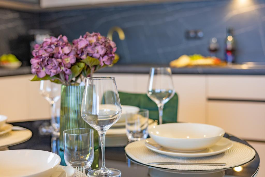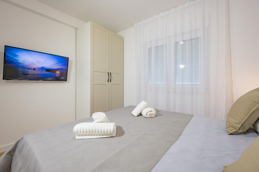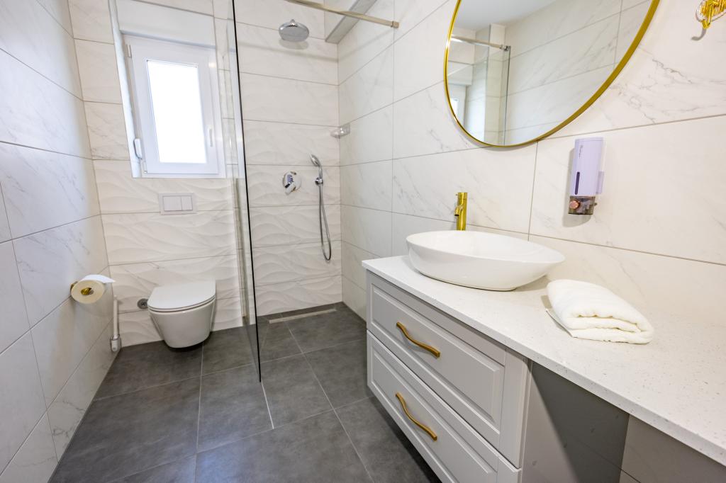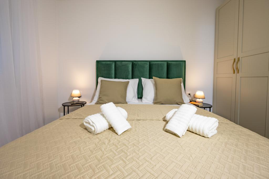 Ogni appartamento è caratterizzato da un design moderno e da interni recentemente rinnovati. Nell'ampio soggiorno, arredato con mobili di buon gusto e dettagli contemporanei, vi sentirete come a casa. Il concetto di open space collega naturalmente il soggiorno con una cucina completamente attrezzata, dove vi attendono eleganti piani di lavoro, elettrodomestici di qualità e tutto lo spazio necessario per preparare i vostri piatti preferiti. La zona giorno si apre su un piacevole balcone, il luogo ideale per un caffè mattutino o per rilassarsi la sera con un bicchiere di vino e un indimenticabile tramonto sull'Adriatico. Ogni appartamento dispone di due comode camere da letto con letti matrimoniali, dotate di morbida biancheria e ampio spazio per riporre gli oggetti, un bagno moderno e un WC aggiuntivo. Gli appartamenti sono climatizzati e completamente attrezzati: TV/SAT, internet, lavatrice, lavastoviglie, macchina per il caffè e tutto il necessario per un soggiorno piacevole e spensierato.