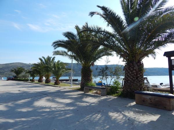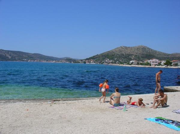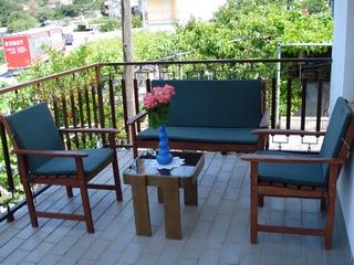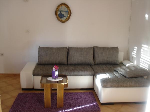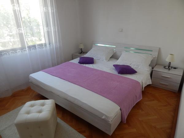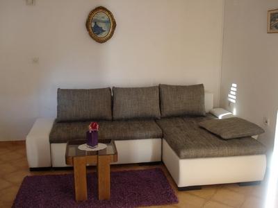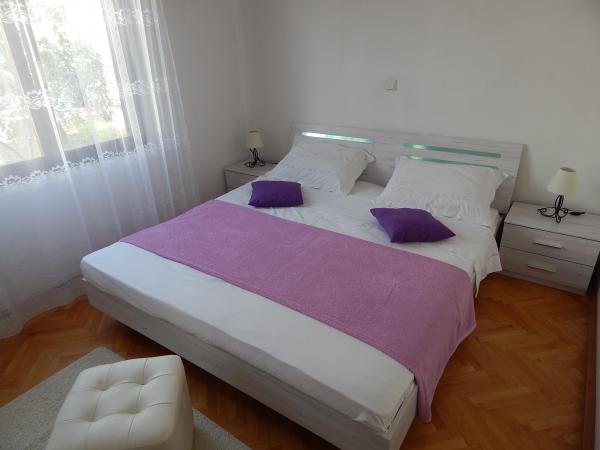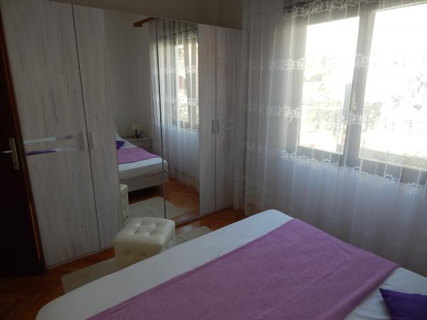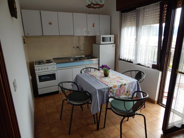 L'appartamento è l'intero piano superiore della casa, 60m2, aria condizionata, con vista sul mare. Dispone di 2 camere da letto, soggiorno con divano letto, cucina (fornello a gas, frigorifero, stoviglie e cucina), bagno, 20m2 grande terrazza con vista sul mare, parcheggio gratuito, barbecue, lavatrice.