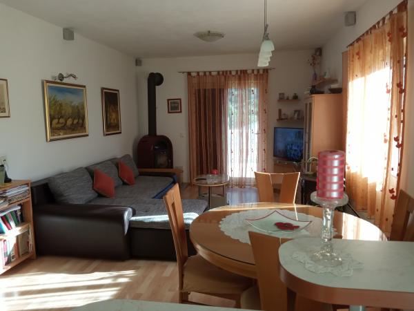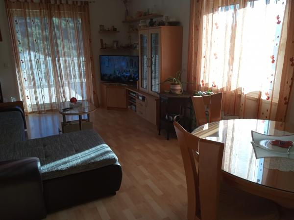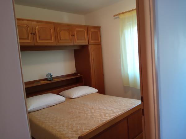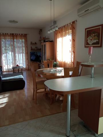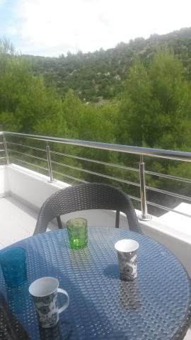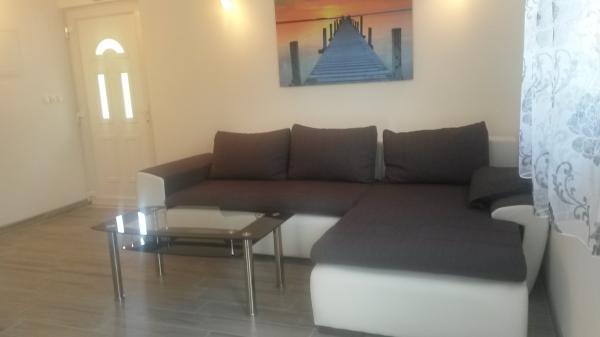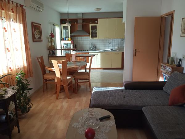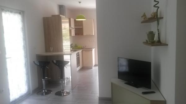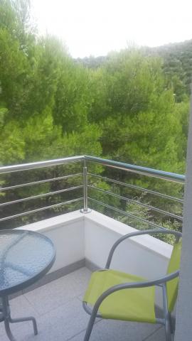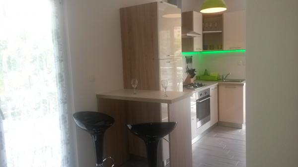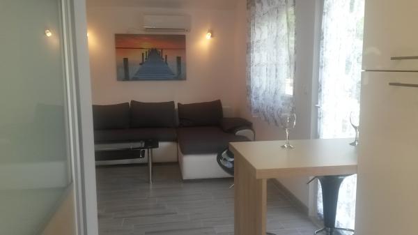 P e P di nuova costruzione appartamenti moderni. Capacità ricettiva per due persone più due letti aggiunti (grande divano letto). La cucina è attrezzata con tutti gli elettrodomestici da cucina necessari: cucina posate e la cucina, bollitore elettrico, frigorifero, macchina per il caffè. Ospiti Offerta libera: Wi-Fi, cassetta di sicurezza, aria, lenzuola e asciugamani puliti, carta igienica, sapone, coperte, parcheggio, uso del barbecue esterno e giardino. L'appartamento è circondato da alberi di pino e la terrazza lumaca bella vista sul mare. La distanza dalle case vicine. E 'ideale per vacanze familiari. La spiaggia si trova a 5 minuti a piedi, adatto per bambini piccoli, e comprende tutti i servizi per la ricreazione.