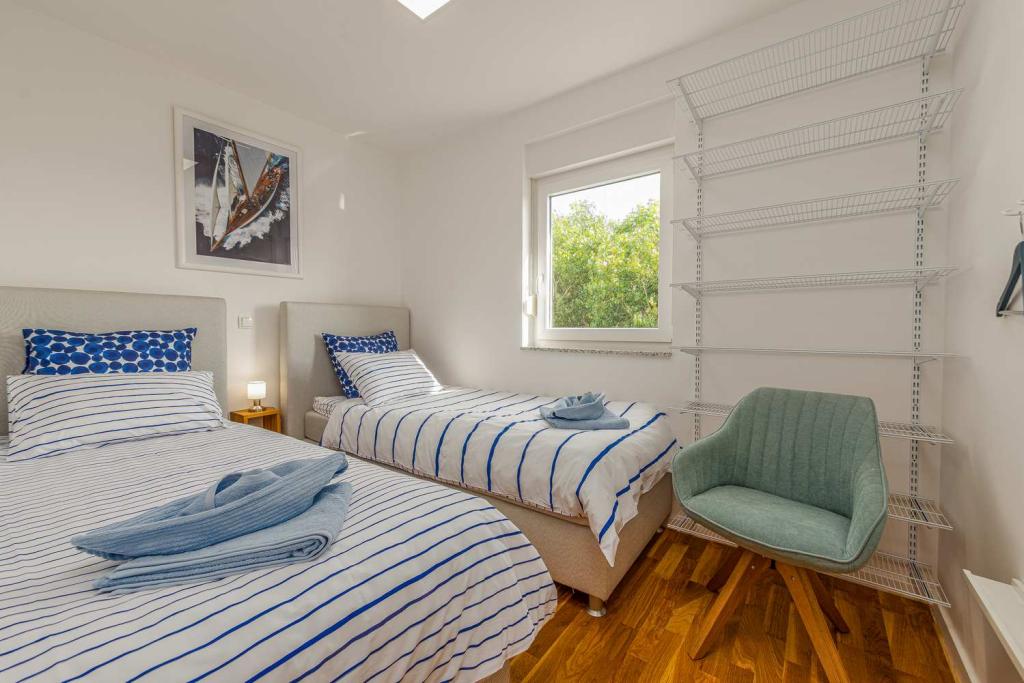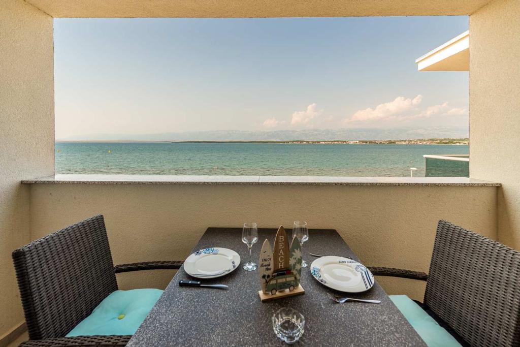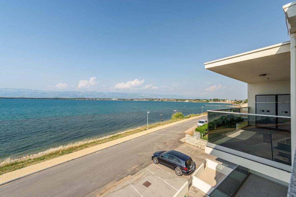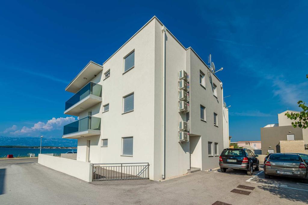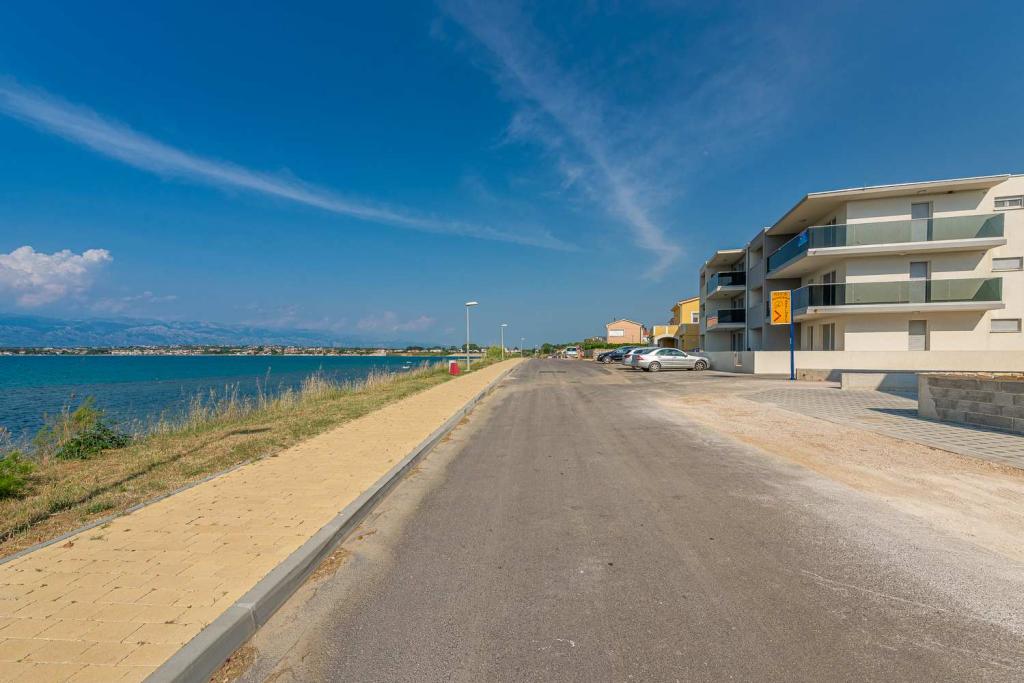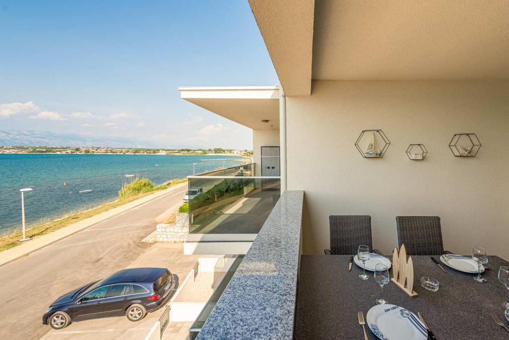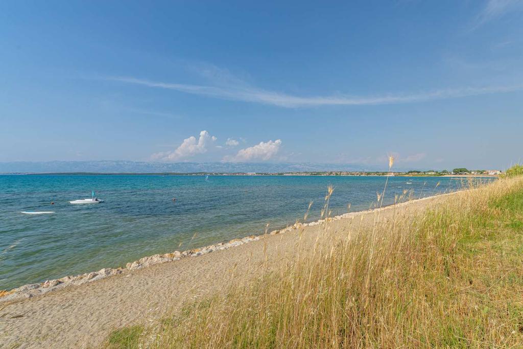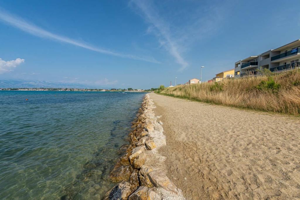 PRIMA FILA dal mare! A 10 metri dalla spiaggia pedonale. A 5 minuti dal centro storico di Nin. Appartamento moderno, ben arredato, cucina molto ben attrezzata (lavastoviglie, tostapane, bollitore, macchina da caffè elettrica, microonde, frigorifero e congelatore, forno, 4 fornelli a induzione). 1 camera con letto matrimoniale + 1 camera con 2 letti singoli. Doccia e lavatrice. Fantastica vista mare dalla terrazza.