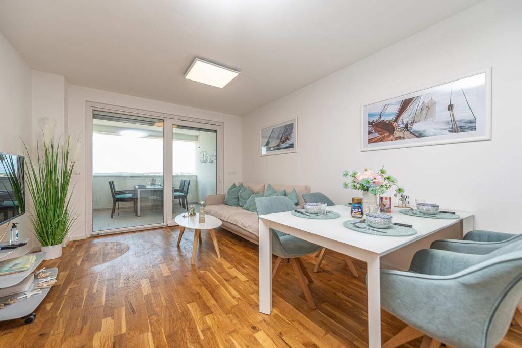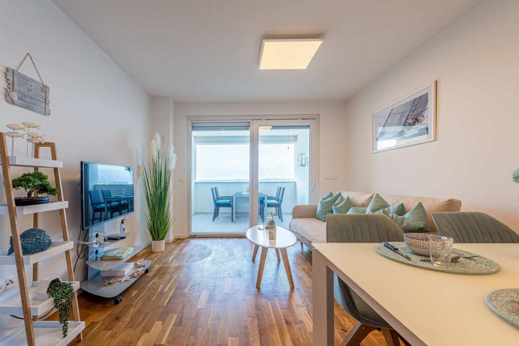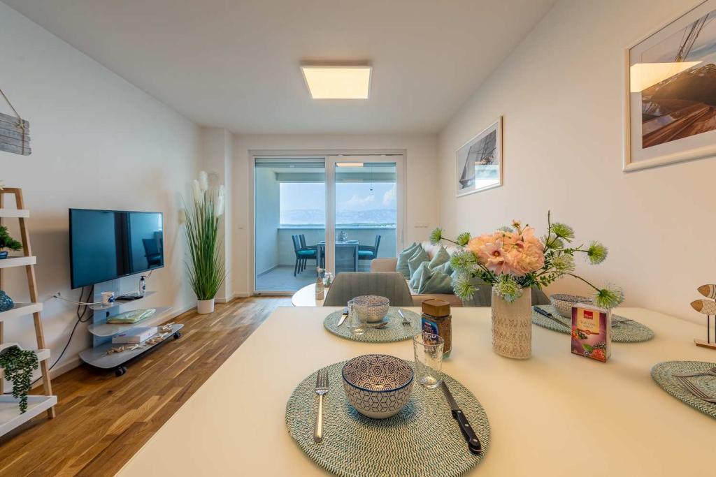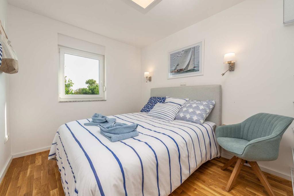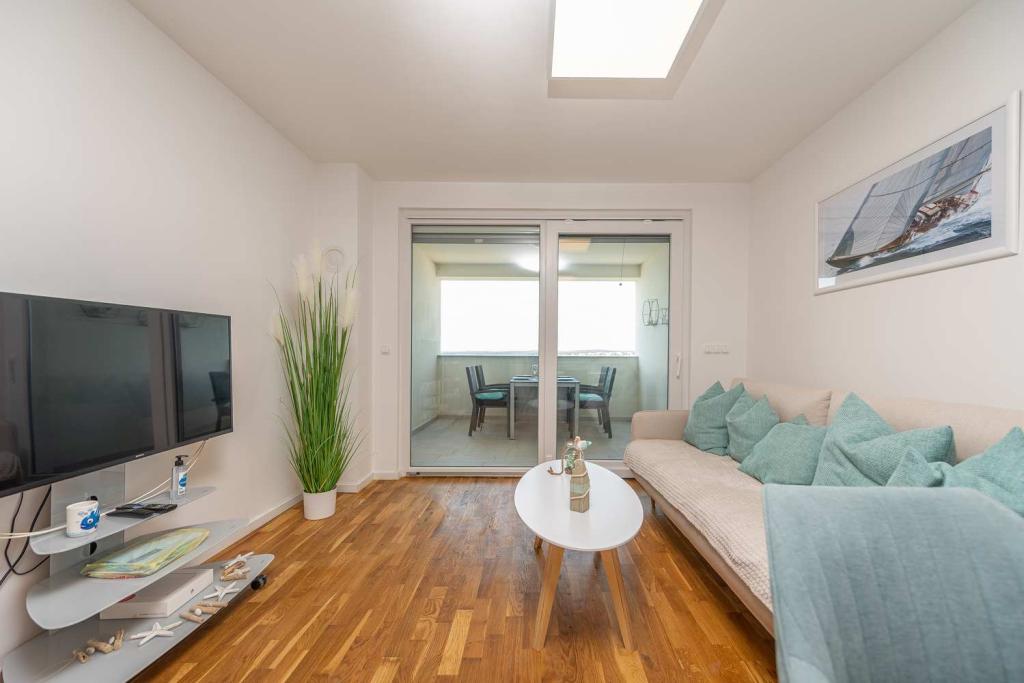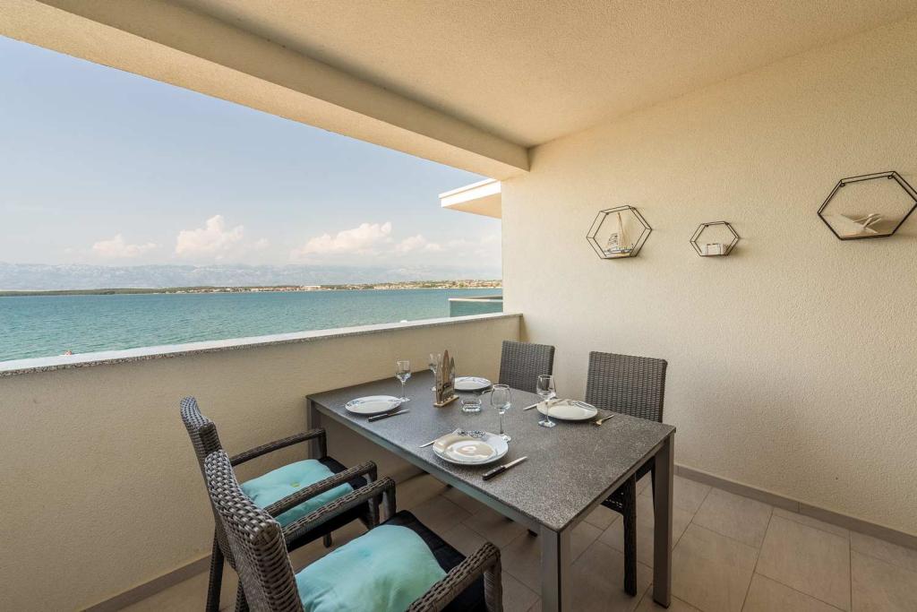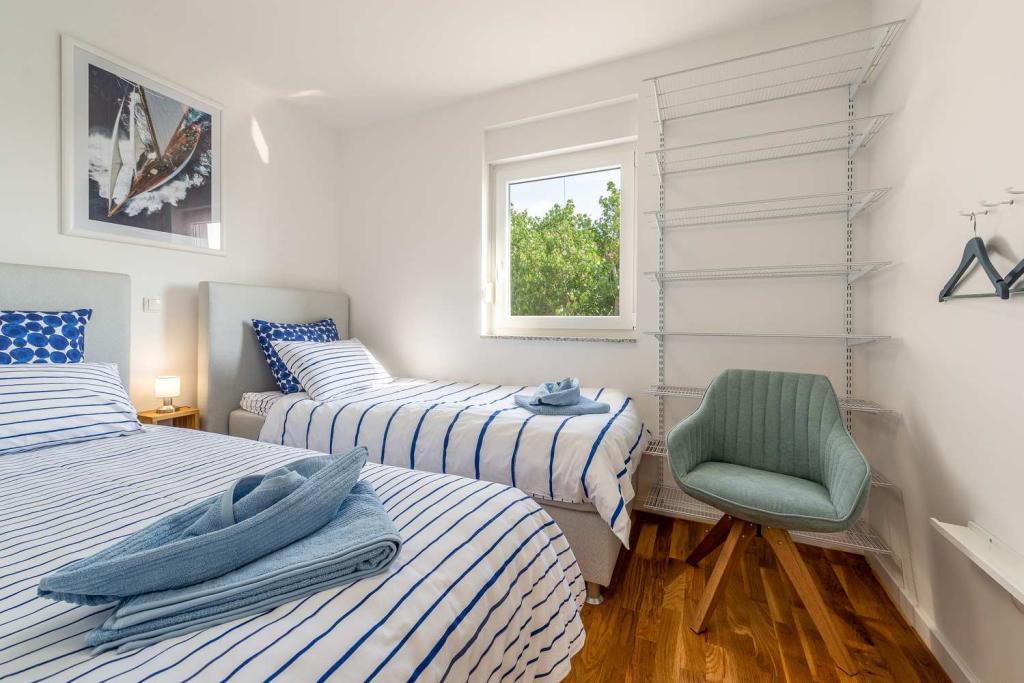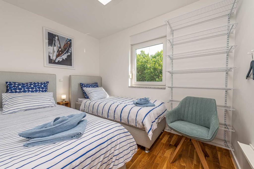 PRIMA FILA dal mare! A 10 metri dalla spiaggia pedonale. A 5 minuti dal centro storico di Nin. Appartamento moderno, ben arredato, cucina molto ben attrezzata (lavastoviglie, tostapane, bollitore, macchina da caffè elettrica, microonde, frigorifero e congelatore, forno, 4 fornelli a induzione). 1 camera con letto matrimoniale + 1 camera con 2 letti singoli. Doccia e lavatrice. Fantastica vista mare dalla terrazza.