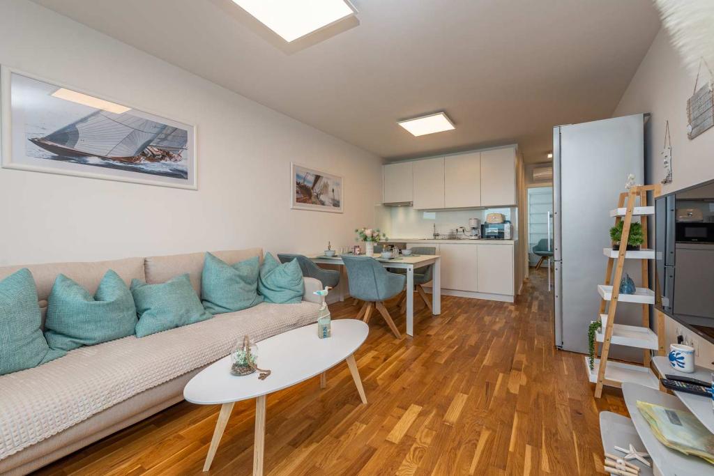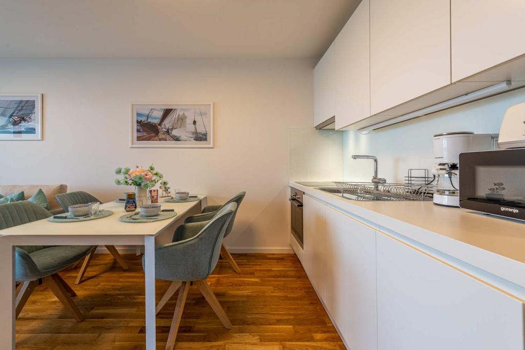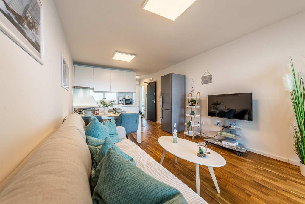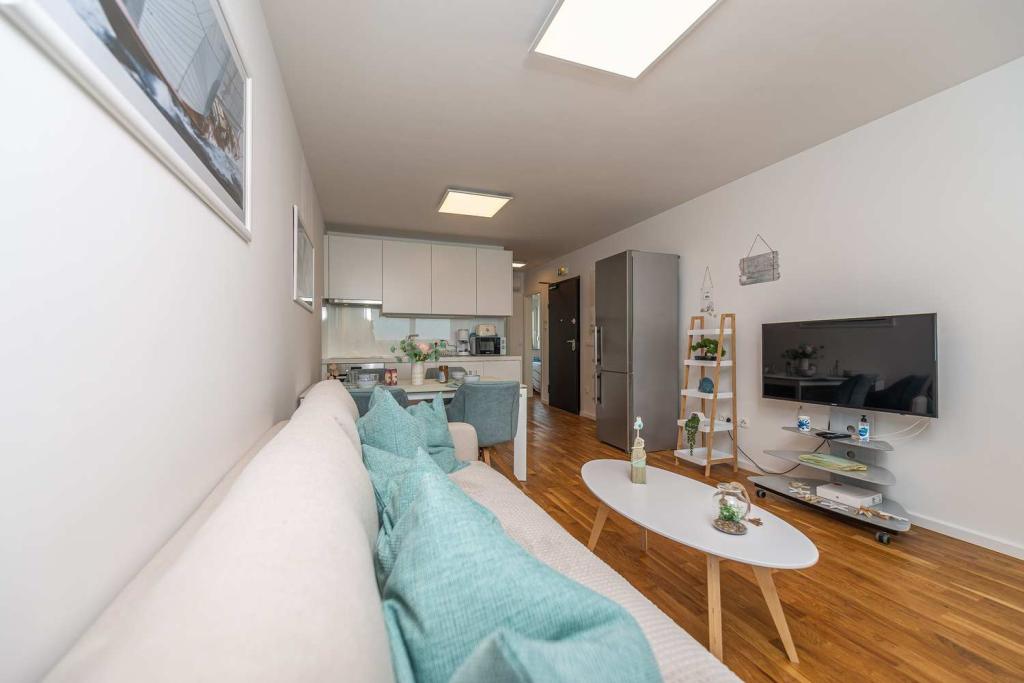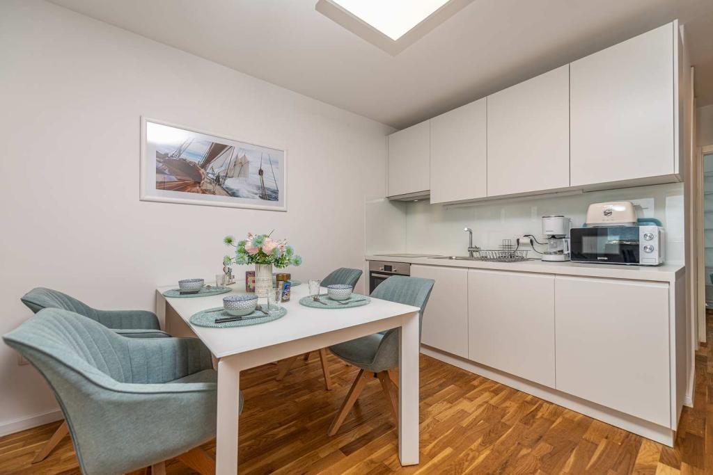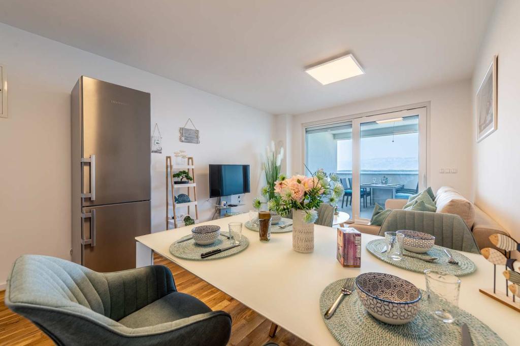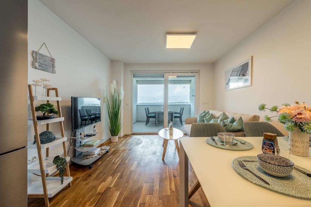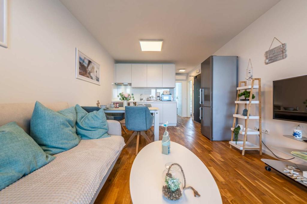 PRIMA FILA dal mare! A 10 metri dalla spiaggia pedonale. A 5 minuti dal centro storico di Nin. Appartamento moderno, ben arredato, cucina molto ben attrezzata (lavastoviglie, tostapane, bollitore, macchina da caffè elettrica, microonde, frigorifero e congelatore, forno, 4 fornelli a induzione). 1 camera con letto matrimoniale + 1 camera con 2 letti singoli. Doccia e lavatrice. Fantastica vista mare dalla terrazza.