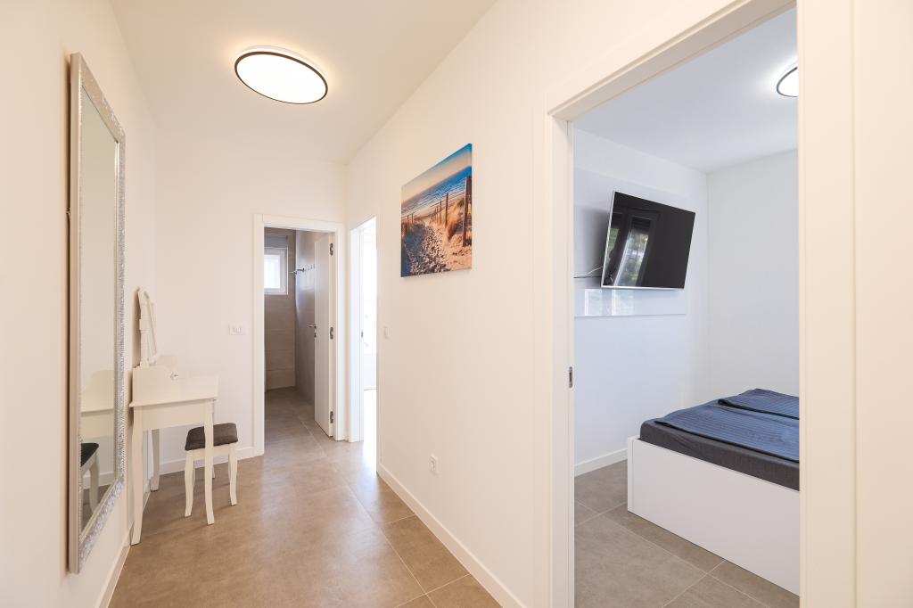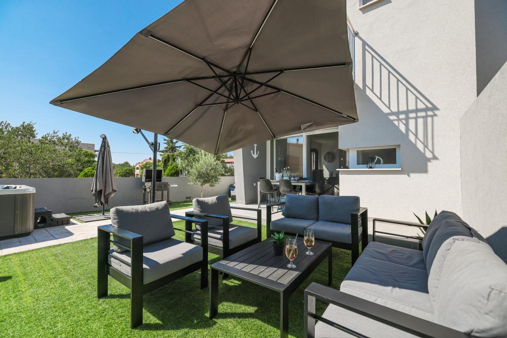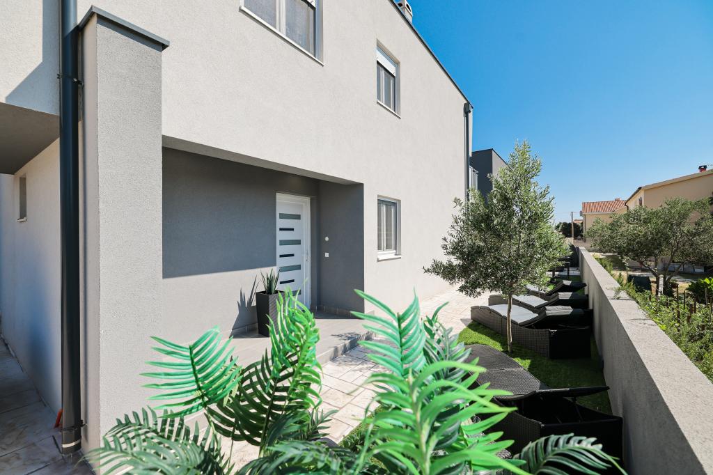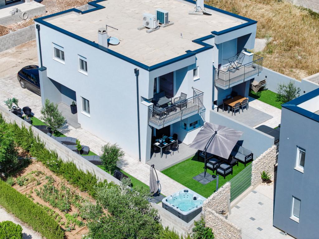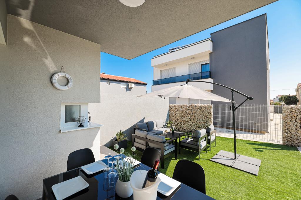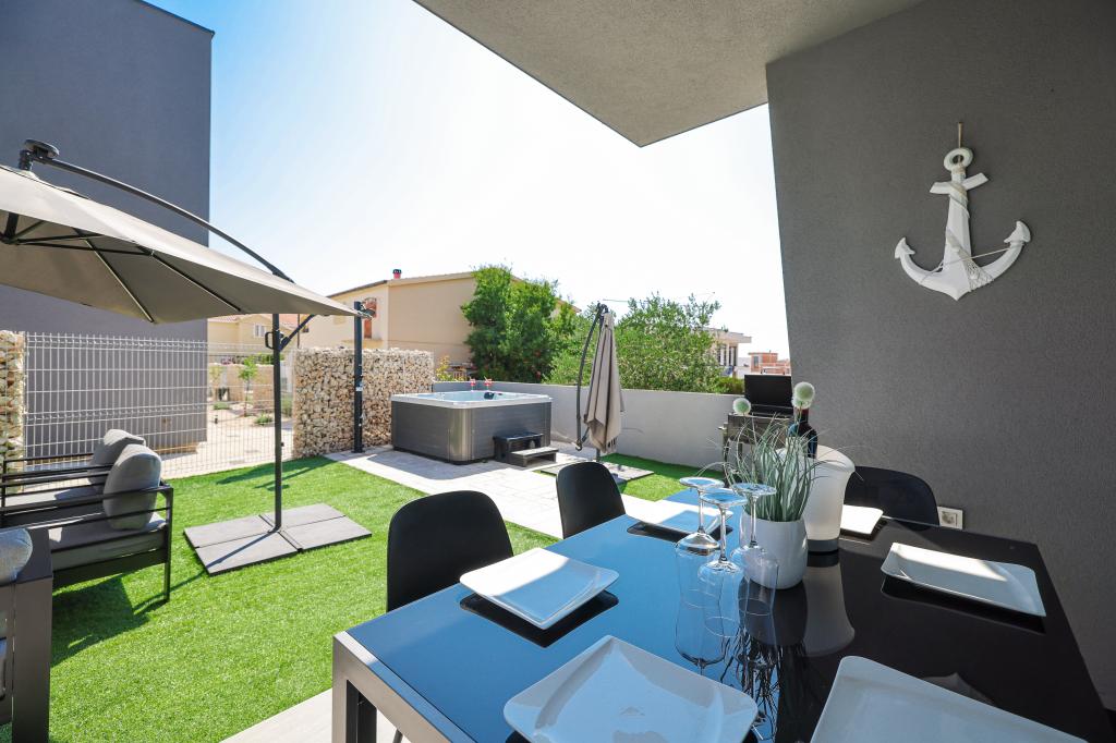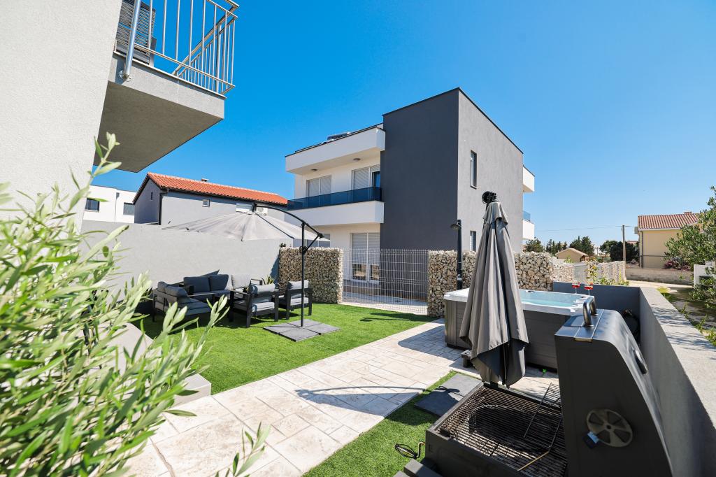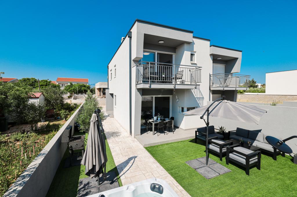 Appartamento trilocale moderno e completamente arredato in una zona tranquilla e silenziosa del villaggio di Vrsi. La struttura si trova a 800 metri dal mare, dispone di 3 camere da letto dotate di aria condizionata e tv, due bagni, un bellissimo terrazzo con vasca idromassaggio, tavolo da pranzo e lettini prendisole. La cucina è completamente attrezzata e nell'area comune sono disponibili un'altra TV e un condizionatore d'aria.