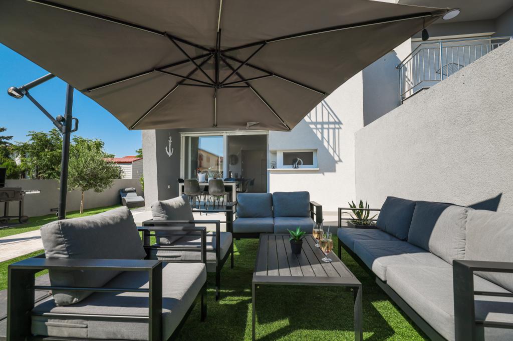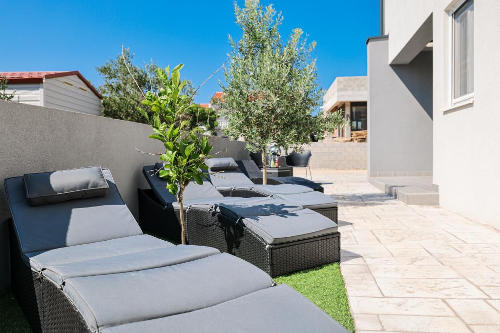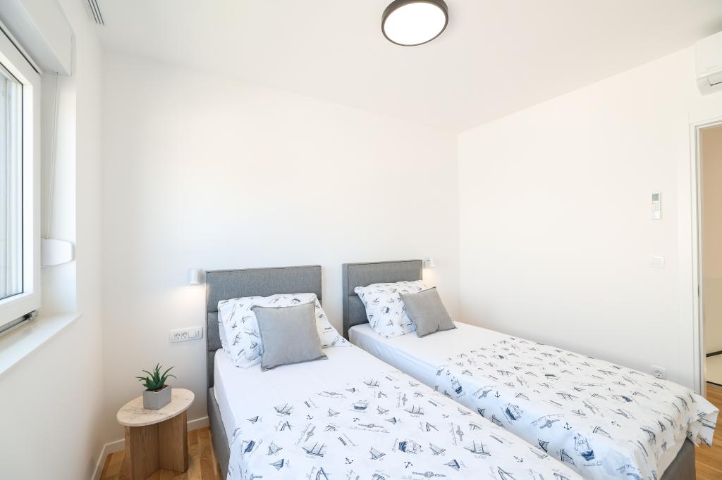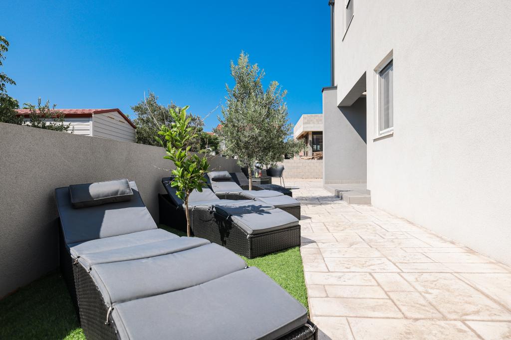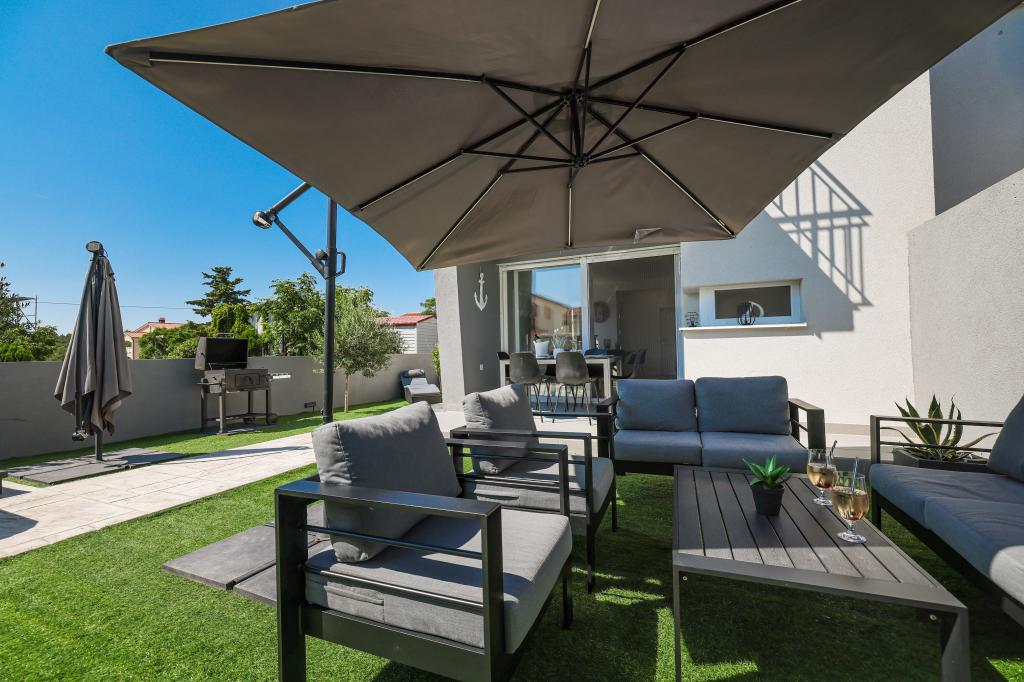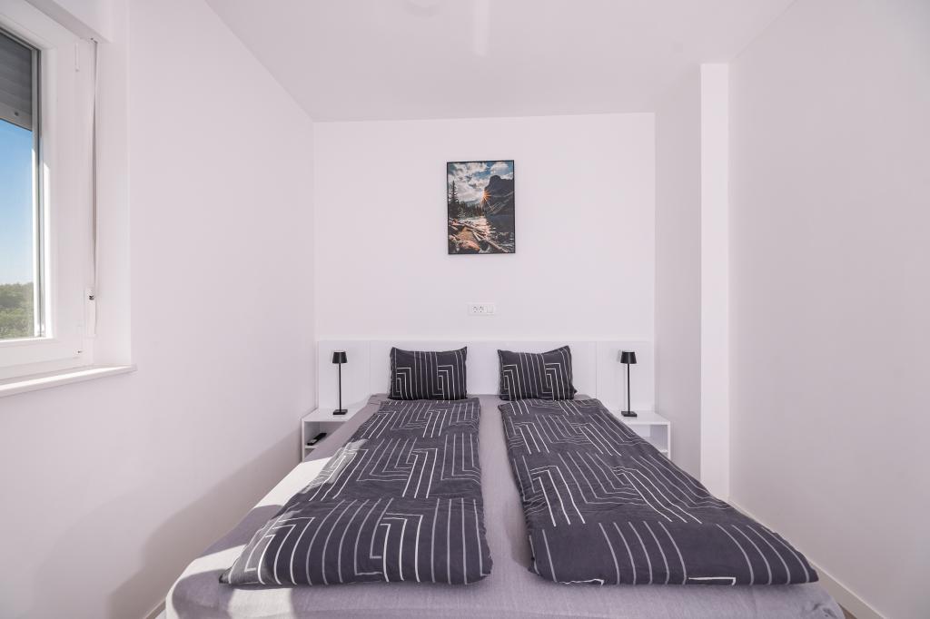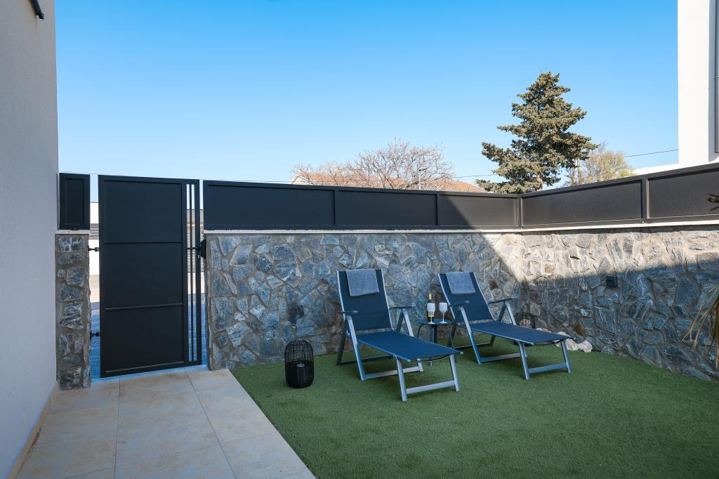 Appartamento trilocale moderno e completamente arredato in una zona tranquilla e silenziosa del villaggio di Vrsi. La struttura si trova a 800 metri dal mare, dispone di 3 camere da letto dotate di aria condizionata e tv, due bagni, un bellissimo terrazzo con vasca idromassaggio, tavolo da pranzo e lettini prendisole. La cucina è completamente attrezzata e nell'area comune sono disponibili un'altra TV e un condizionatore d'aria.