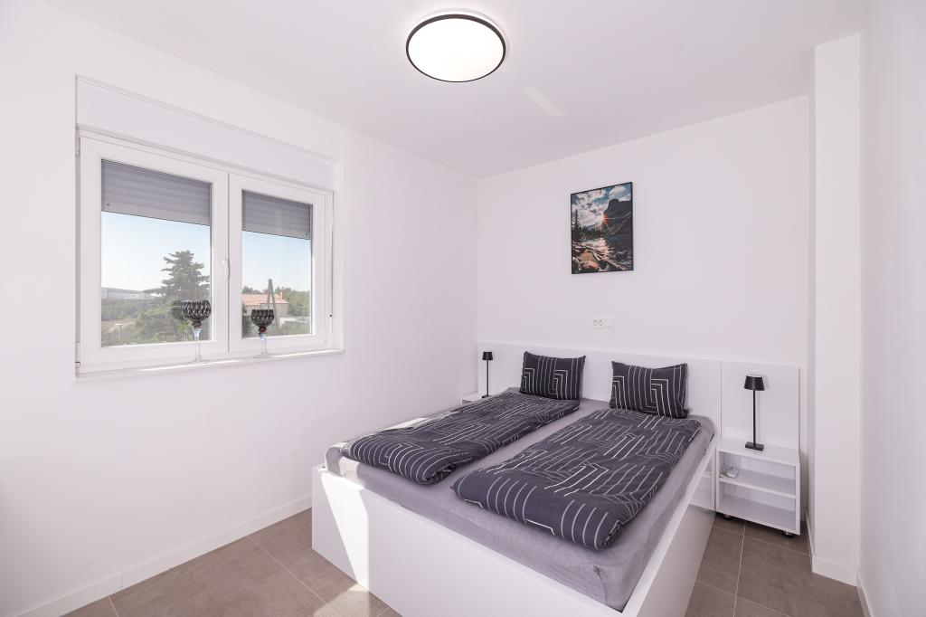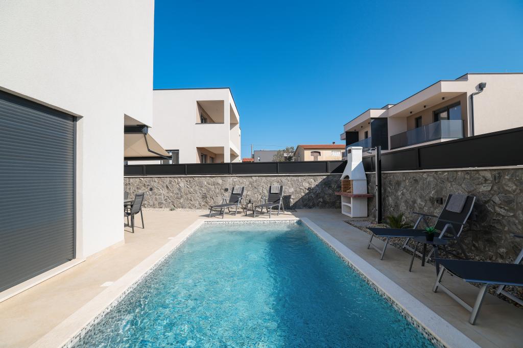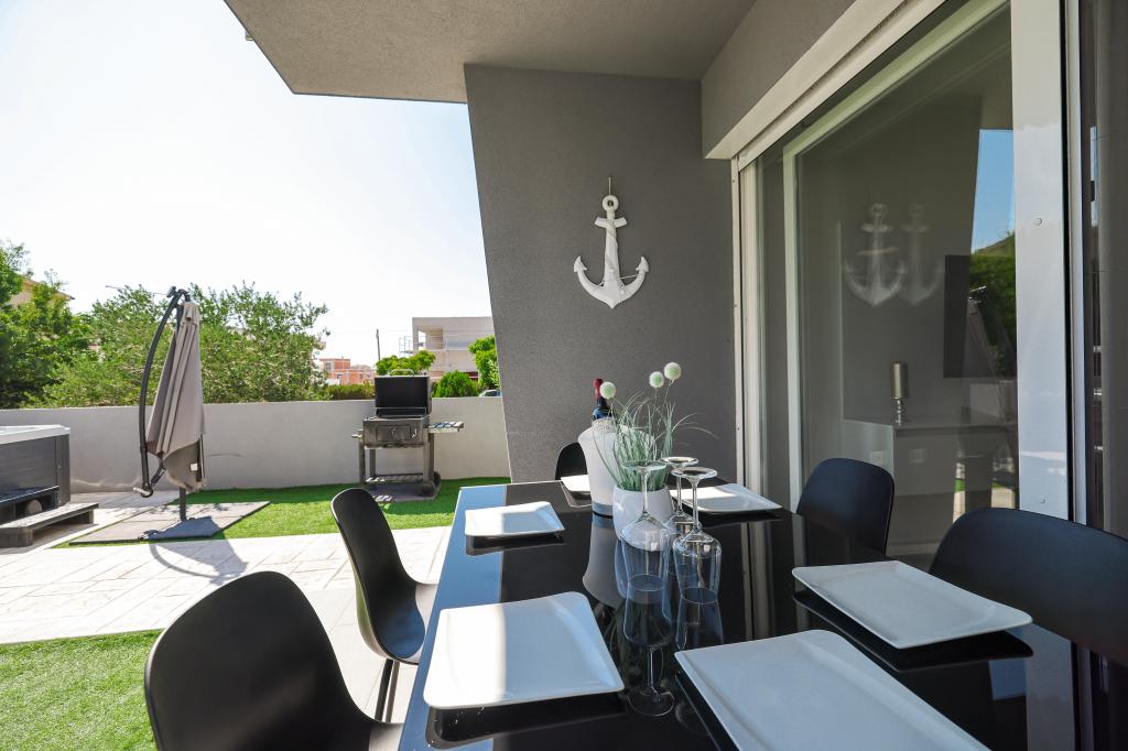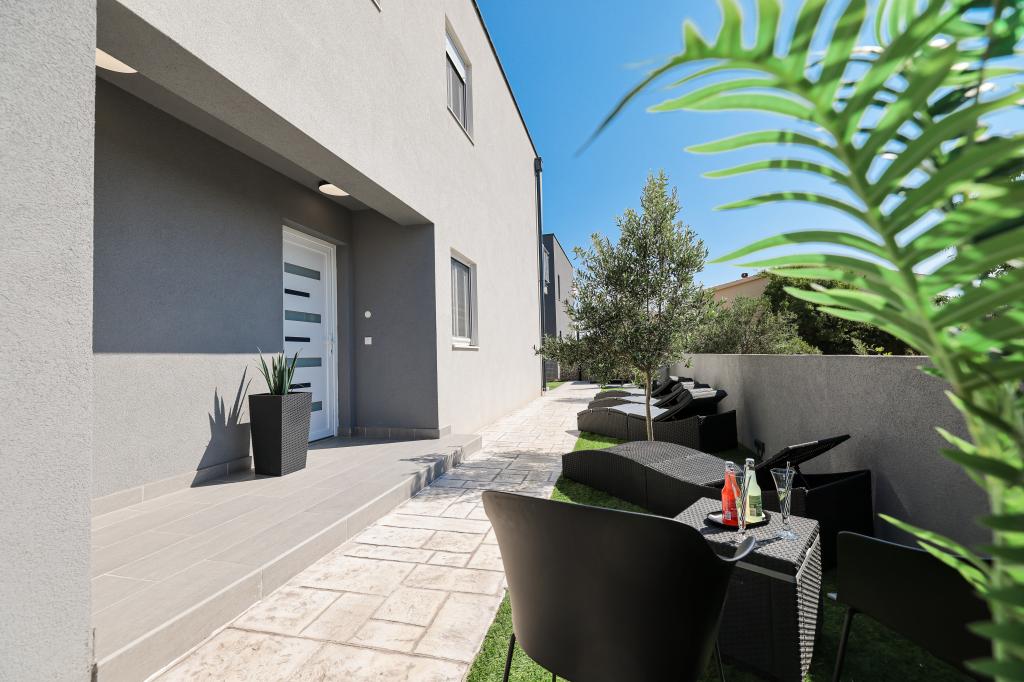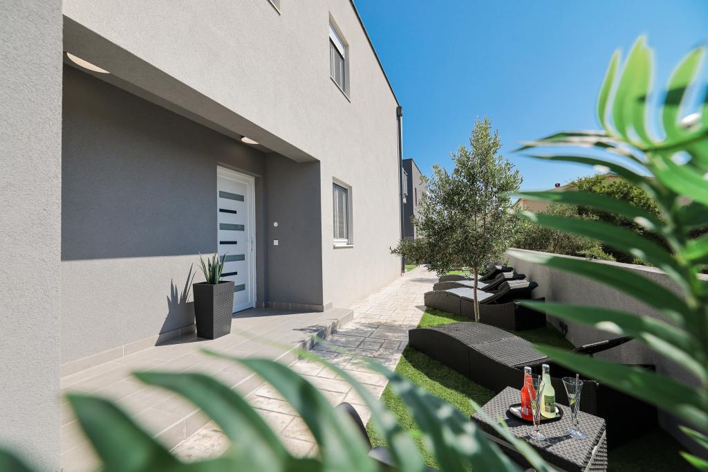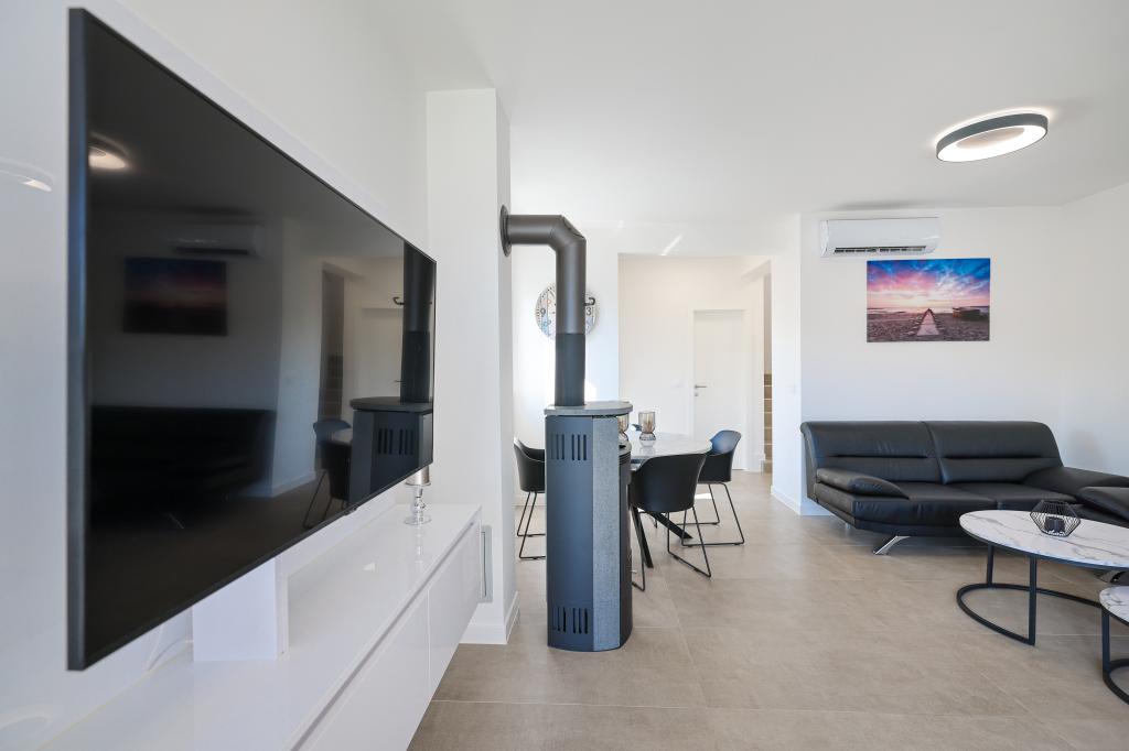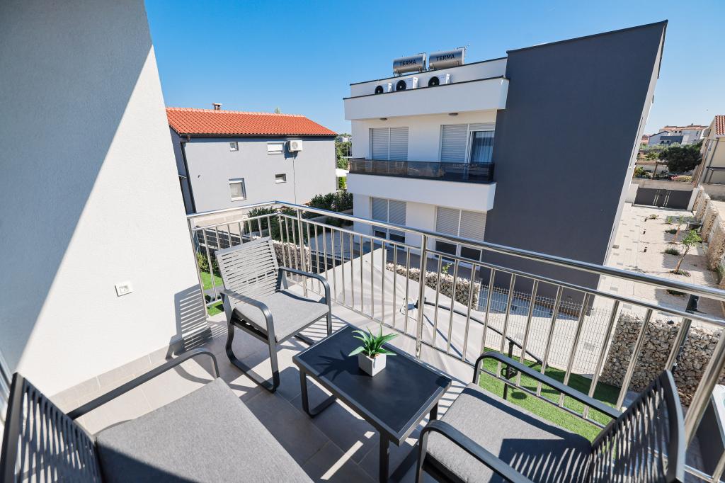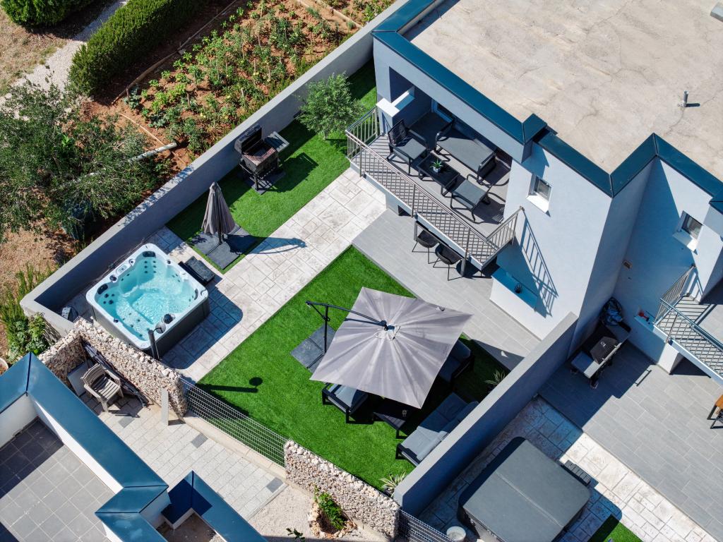 Appartamento trilocale moderno e completamente arredato in una zona tranquilla e silenziosa del villaggio di Vrsi. La struttura si trova a 800 metri dal mare, dispone di 3 camere da letto dotate di aria condizionata e tv, due bagni, un bellissimo terrazzo con vasca idromassaggio, tavolo da pranzo e lettini prendisole. La cucina è completamente attrezzata e nell'area comune sono disponibili un'altra TV e un condizionatore d'aria.