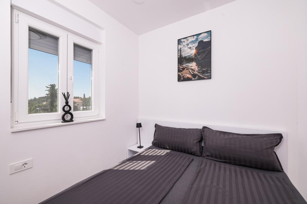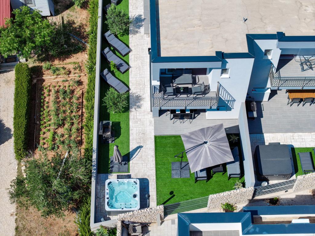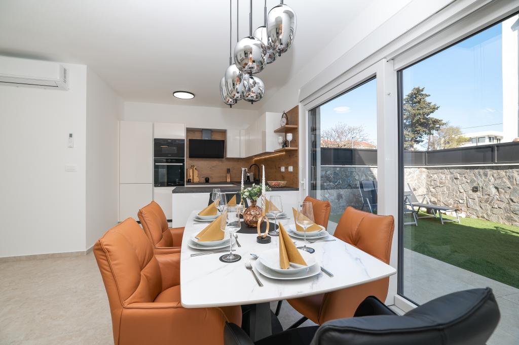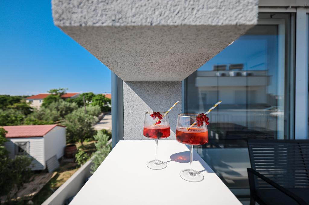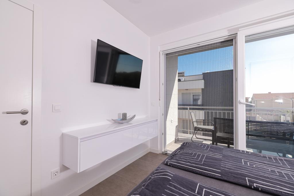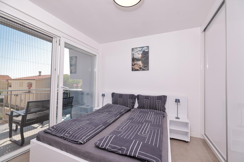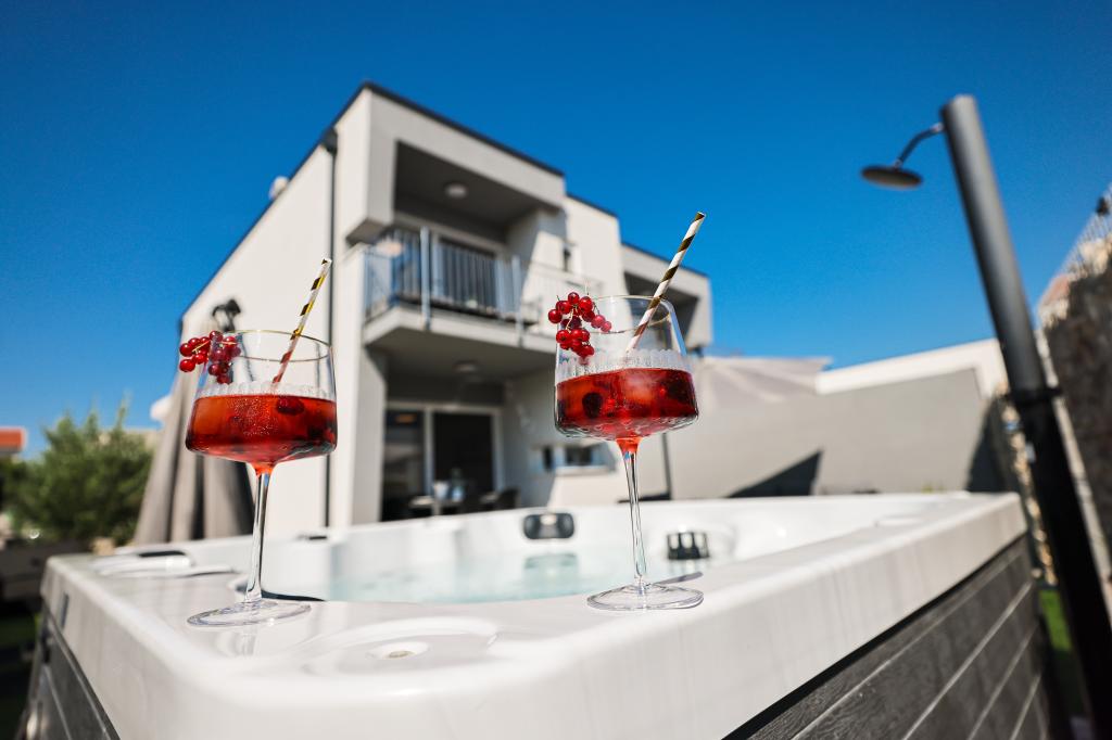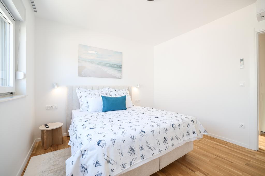Appartamento trilocale moderno e completamente arredato in una zona tranquilla e silenziosa del villaggio di Vrsi. La struttura si trova a 800 metri dal mare, dispone di 3 camere da letto dotate di aria condizionata e tv, due bagni, un bellissimo terrazzo con vasca idromassaggio, tavolo da pranzo e lettini prendisole. La cucina è completamente attrezzata e nell'area comune sono disponibili un'altra TV e un condizionatore d'aria.