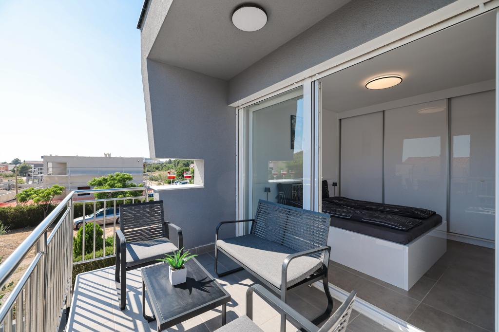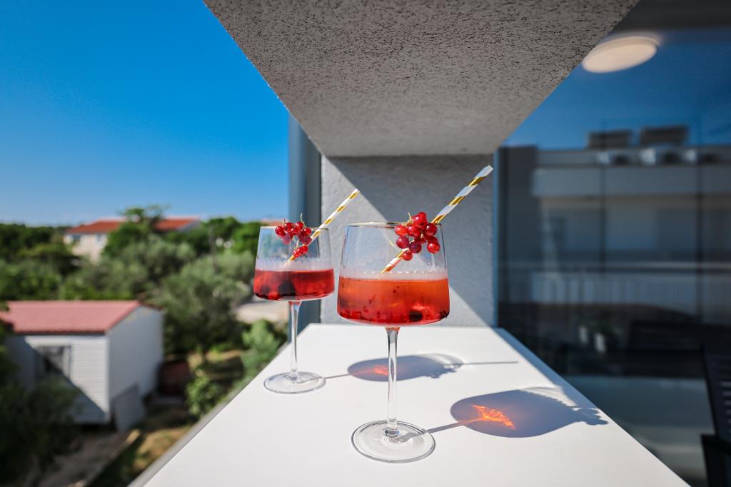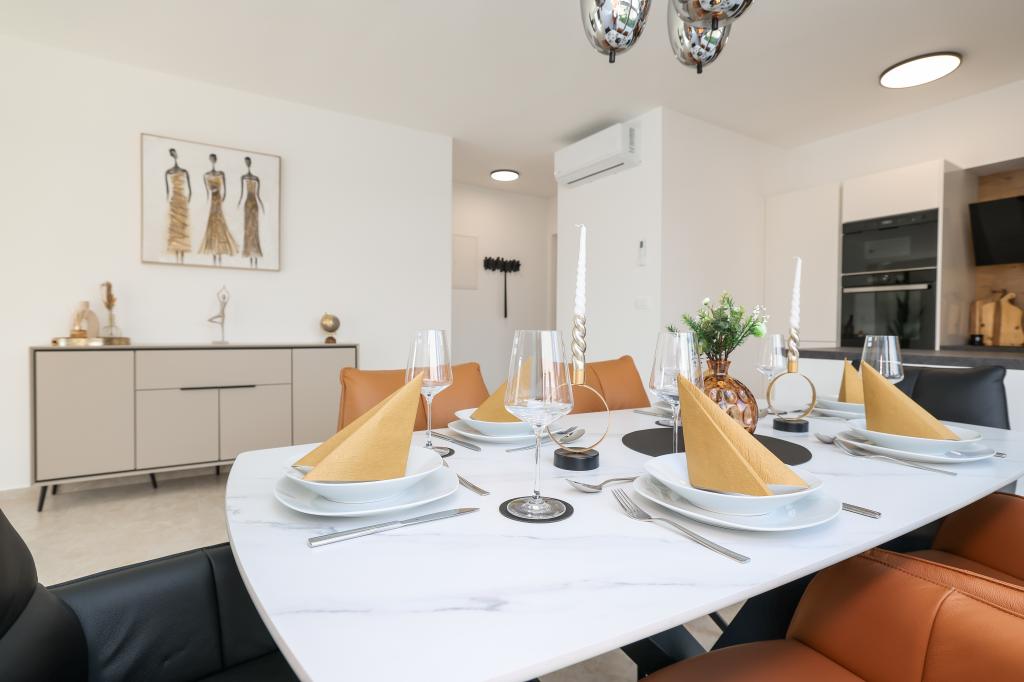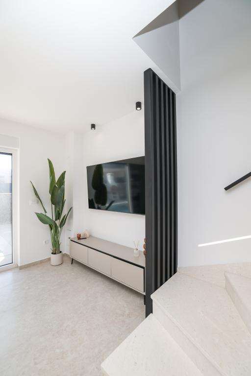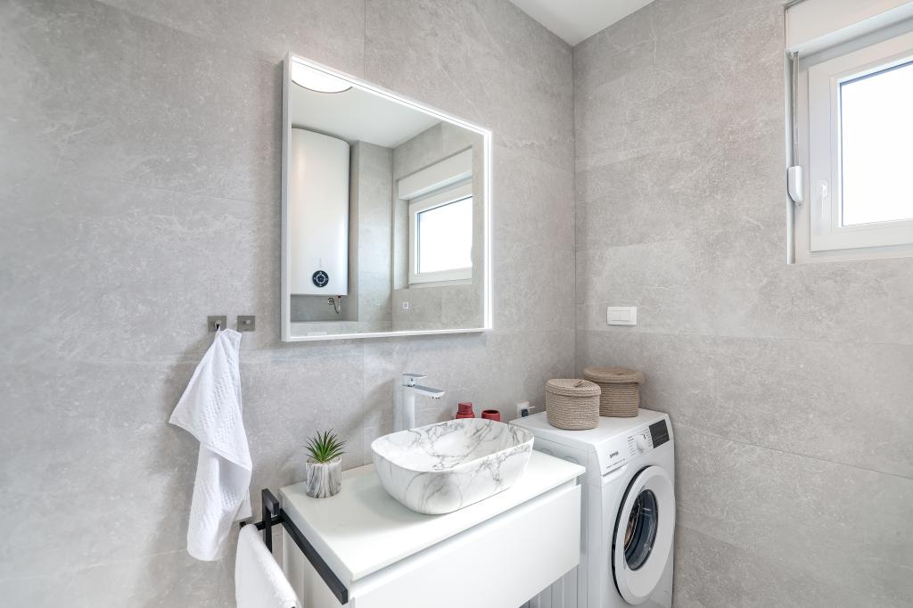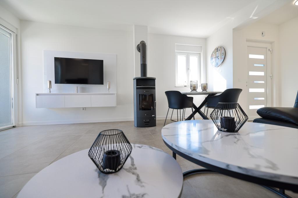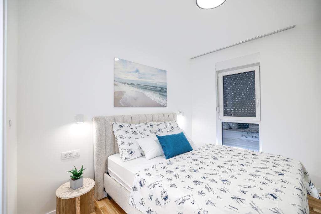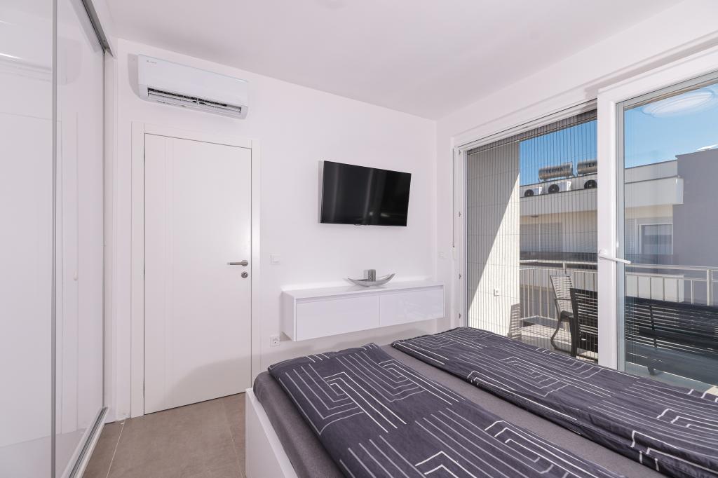 Appartamento trilocale moderno e completamente arredato in una zona tranquilla e silenziosa del villaggio di Vrsi. La struttura si trova a 800 metri dal mare, dispone di 3 camere da letto dotate di aria condizionata e tv, due bagni, un bellissimo terrazzo con vasca idromassaggio, tavolo da pranzo e lettini prendisole. La cucina è completamente attrezzata e nell'area comune sono disponibili un'altra TV e un condizionatore d'aria.