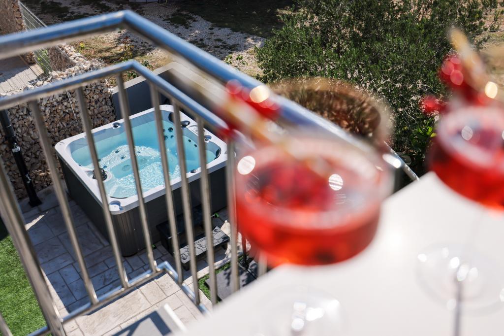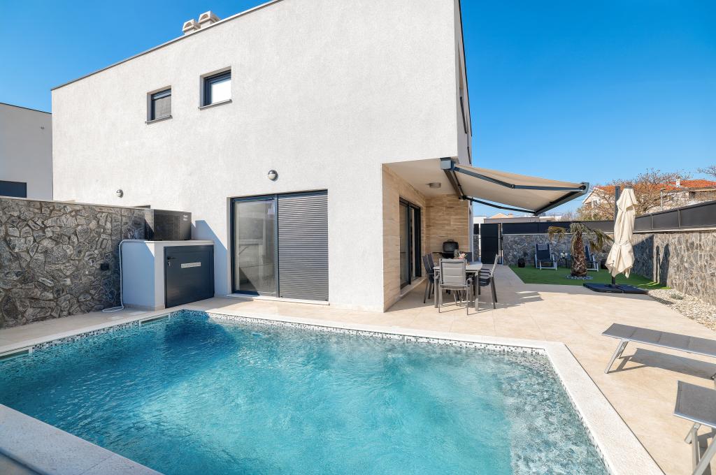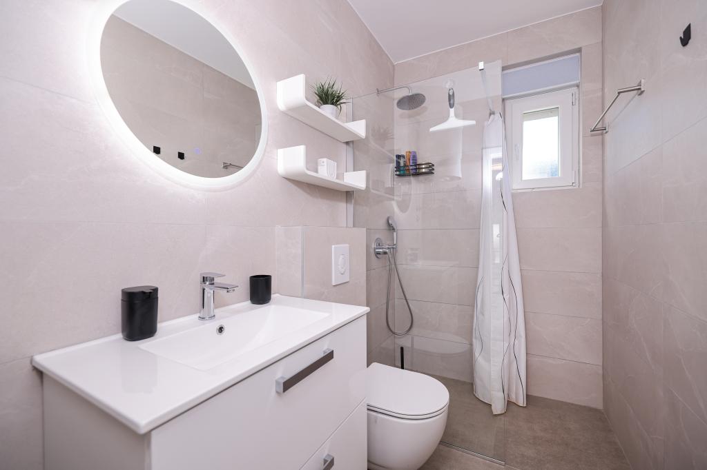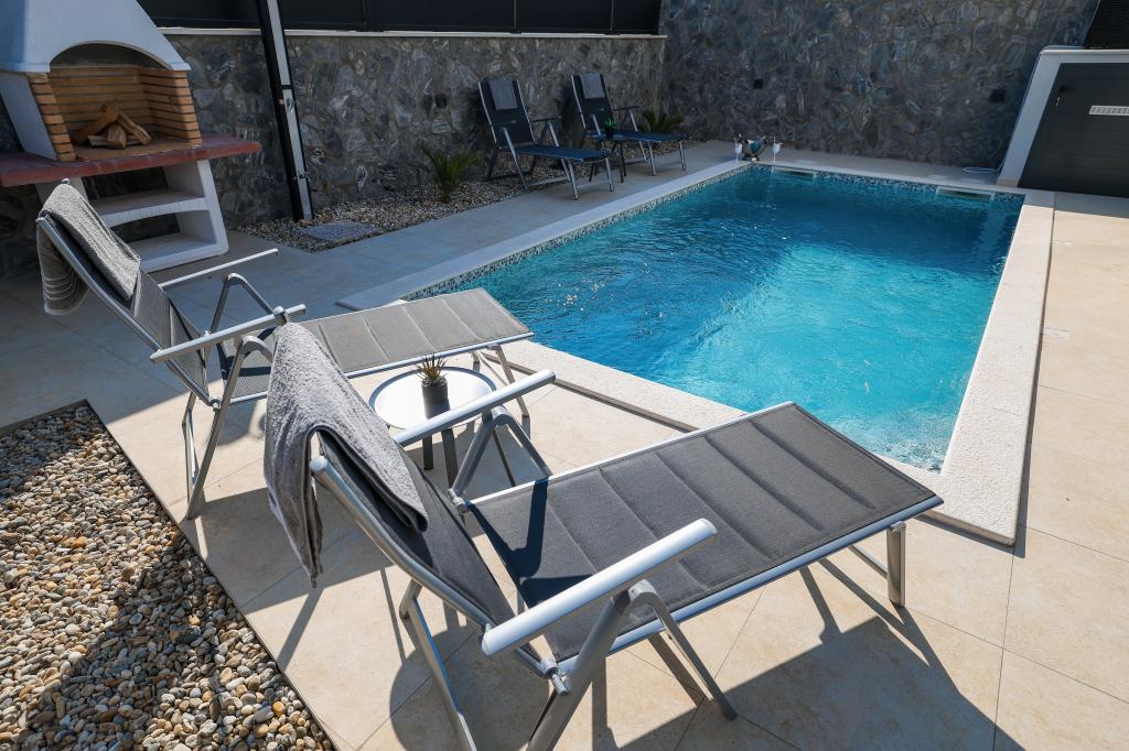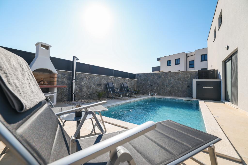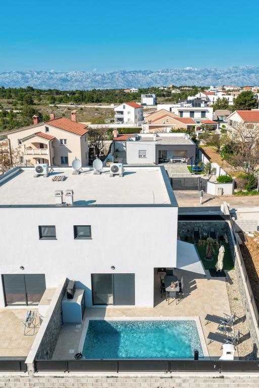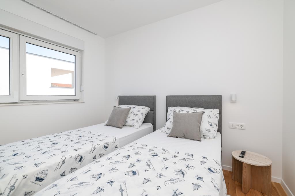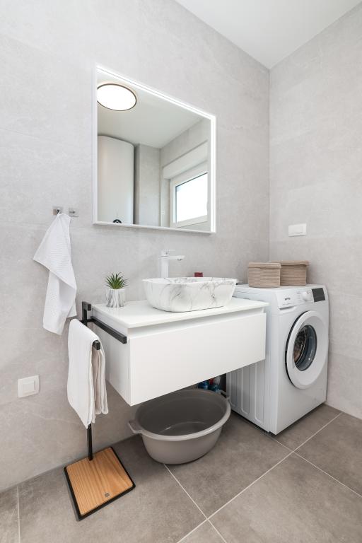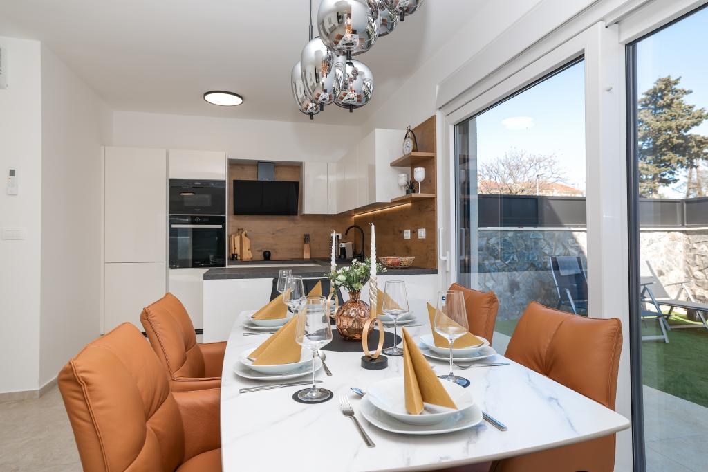 Appartamento trilocale moderno e completamente arredato in una zona tranquilla e silenziosa del villaggio di Vrsi. La struttura si trova a 800 metri dal mare, dispone di 3 camere da letto dotate di aria condizionata e tv, due bagni, un bellissimo terrazzo con vasca idromassaggio, tavolo da pranzo e lettini prendisole. La cucina è completamente attrezzata e nell'area comune sono disponibili un'altra TV e un condizionatore d'aria.