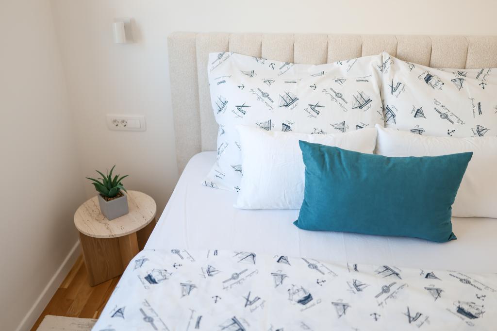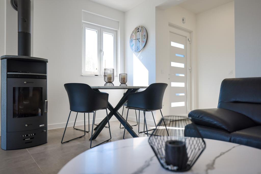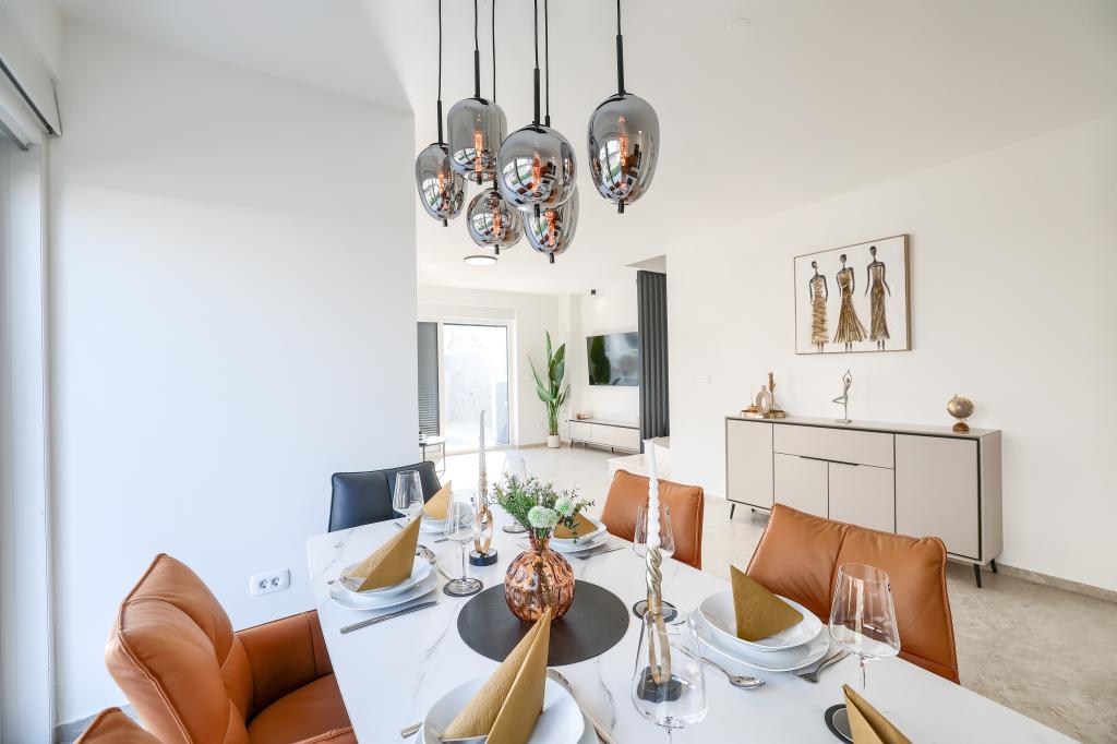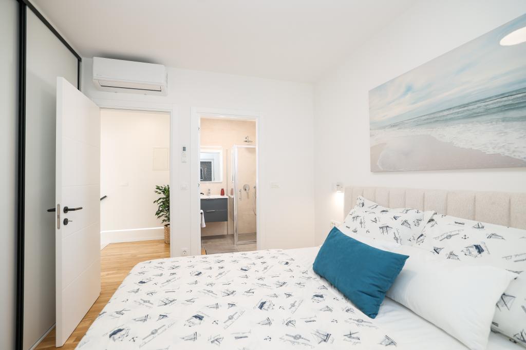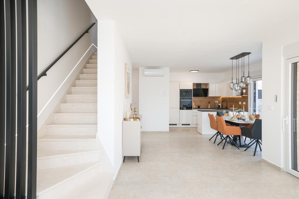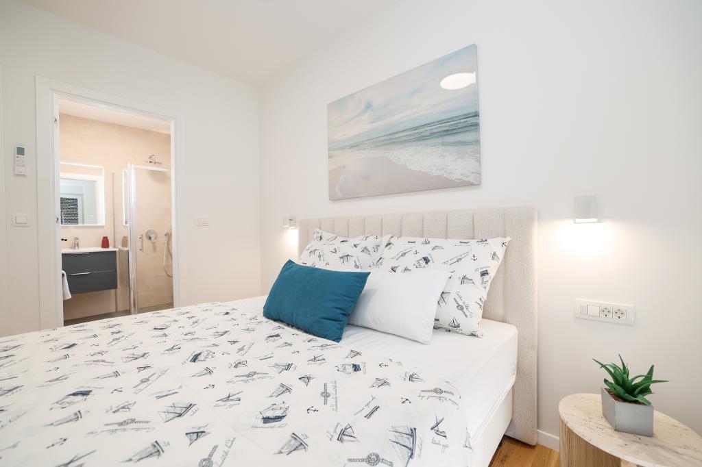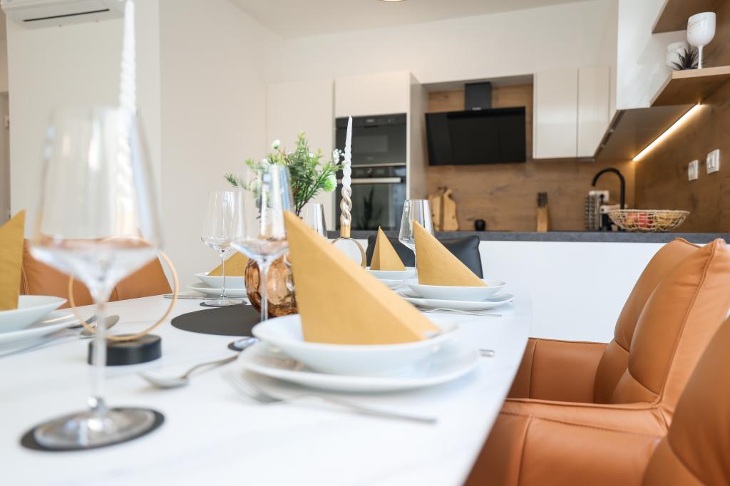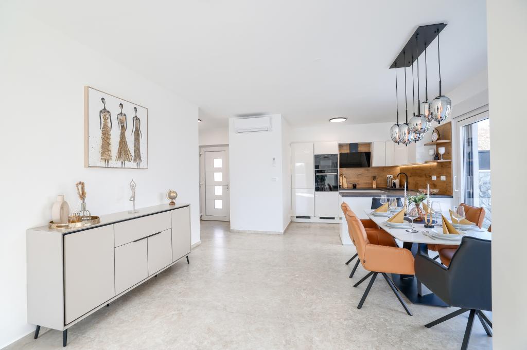 Appartamento trilocale moderno e completamente arredato in una zona tranquilla e silenziosa del villaggio di Vrsi. La struttura si trova a 800 metri dal mare, dispone di 3 camere da letto dotate di aria condizionata e tv, due bagni, un bellissimo terrazzo con vasca idromassaggio, tavolo da pranzo e lettini prendisole. La cucina è completamente attrezzata e nell'area comune sono disponibili un'altra TV e un condizionatore d'aria.