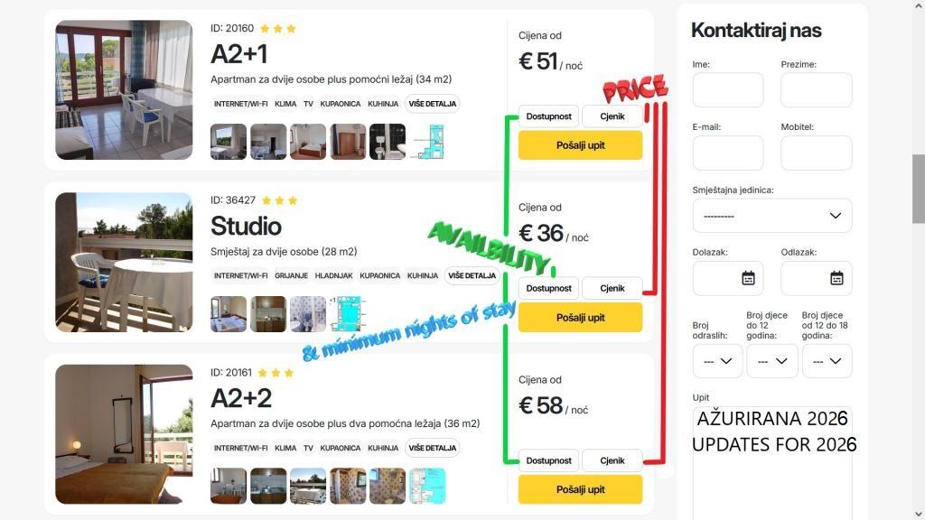 La struttura ricettiva si trova nell'ultima strada sul lato ovest di Orebić. Vicino al complesso alberghiero, proprio accanto a una pineta. Siamo a circa 2,5 minuti a piedi dal mare e dalle spiagge pubbliche. La costa è ricca di spiagge, all'ombra di pini e lecci, e sono presenti anche bar e ristoranti. Particolarmente suggestiva è la spiaggia pubblica sotto il Grand Hotel, con la sua insenatura e il mare poco profondo con fondale sabbioso. Tutti gli appartamenti dispongono di un balcone, una loggia dove, nella stagione calda e nel silenzio più assoluto, senza vento, l'aria circola in modo forte e piacevole. Gli appartamenti con letti supplementari "2+2" e "2+1" sono adatti alle famiglie con due o un bambino. L'appartamento "2+2" è dotato di due condizionatori d'aria, mentre l'appartamento "2+1" di uno. BENVENUTO