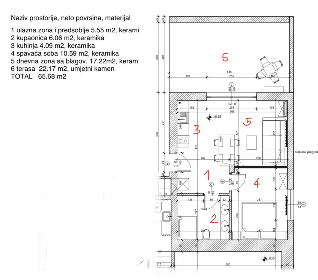 L'appartamento di 45 m² con una camera da letto è adatto a coppie, famiglie o qualsiasi altro gruppo di 2-4 persone, con la possibilità di aggiungere un letto matrimoniale o una culla su richiesta. La proprietà comprende due posti auto privati e una terrazza al piano terra esposta a est e a ovest, che vi permetterà di godervi mattine soleggiate e caffè all'aperto, nonché piacevoli tramonti e serate in un'atmosfera intima. L'interno dell'appartamento è stato recentemente dotato di tutti gli elettrodomestici di cui potreste aver bisogno durante il vostro soggiorno, come aria condizionata, Wi-Fi, TV satellitare, macchina per il caffè, lavastoviglie, lavatrice, forno portatile, ferro da stiro, asciugacapelli e molto altro. La camera da letto, con un comodo letto king-size nuovo, ha una parete in vetro che permette di godere del panorama anche dal letto, ma anche di una completa privacy tirando le tende. Il bagno è dotato di doppio lavabo, WC, bidet e un'ampia cabina doccia.