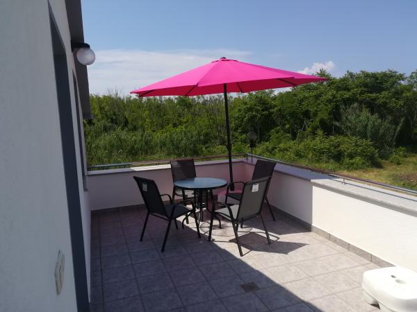 Appartamenti completamente attrezzati con terrazza, ampio giardino, con possibilità di utilizzare un parco giochi per bambini e una piscina per bambini. . Se vuoi visitare il nostro posto, puoi anche portare le nostre biciclette (gratuite) in spiaggia a 10 minuti a piedi, a piedi, in strada o in auto tranquilla per circa 3 minuti. La stazione degli autobus è a circa 200-300 metri di distanza. Gli appartamenti hanno tutte le attrezzature per la preparazione del cibo, biancheria da letto, asciugamani, zanzariere alle finestre, TV a schermo piatto (programma satellitare), WIFI gratuito, aria condizionata, barbecue, parcheggio coperto, lavatrice, doccia esterna. Importante: Esiste la possibilità di ESTRATTI A LUNGO TERMINE IN CONDIZIONI ECCESSIVE.