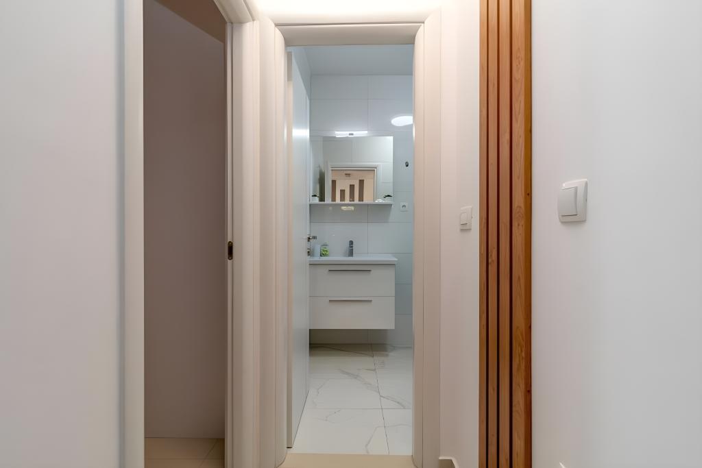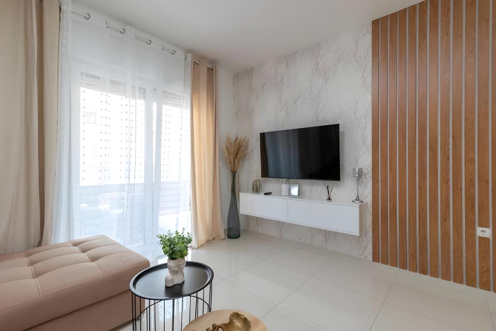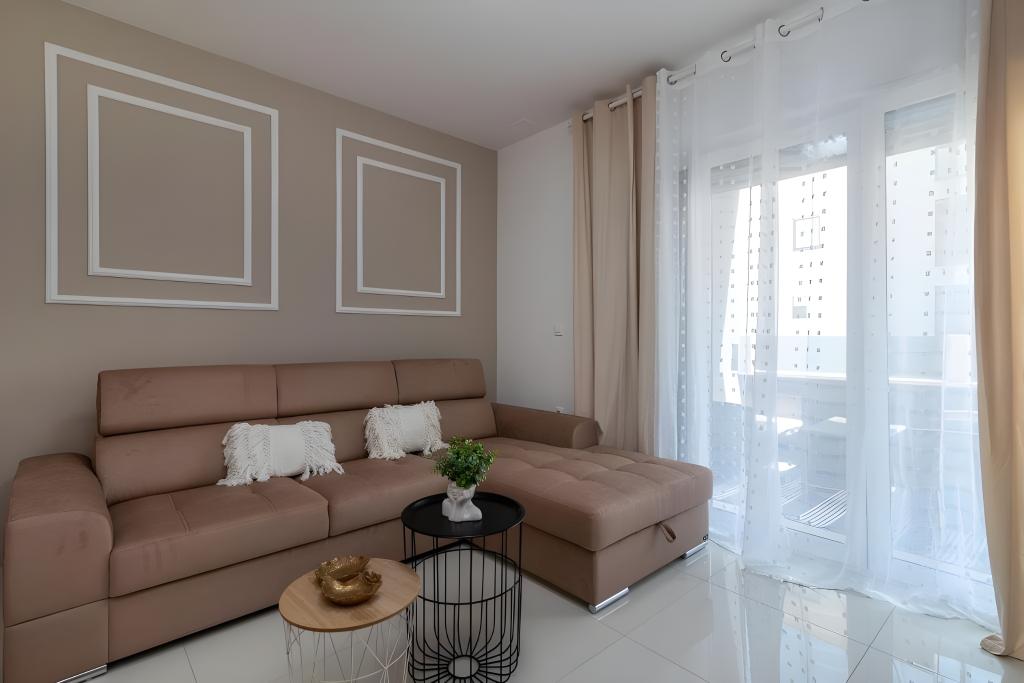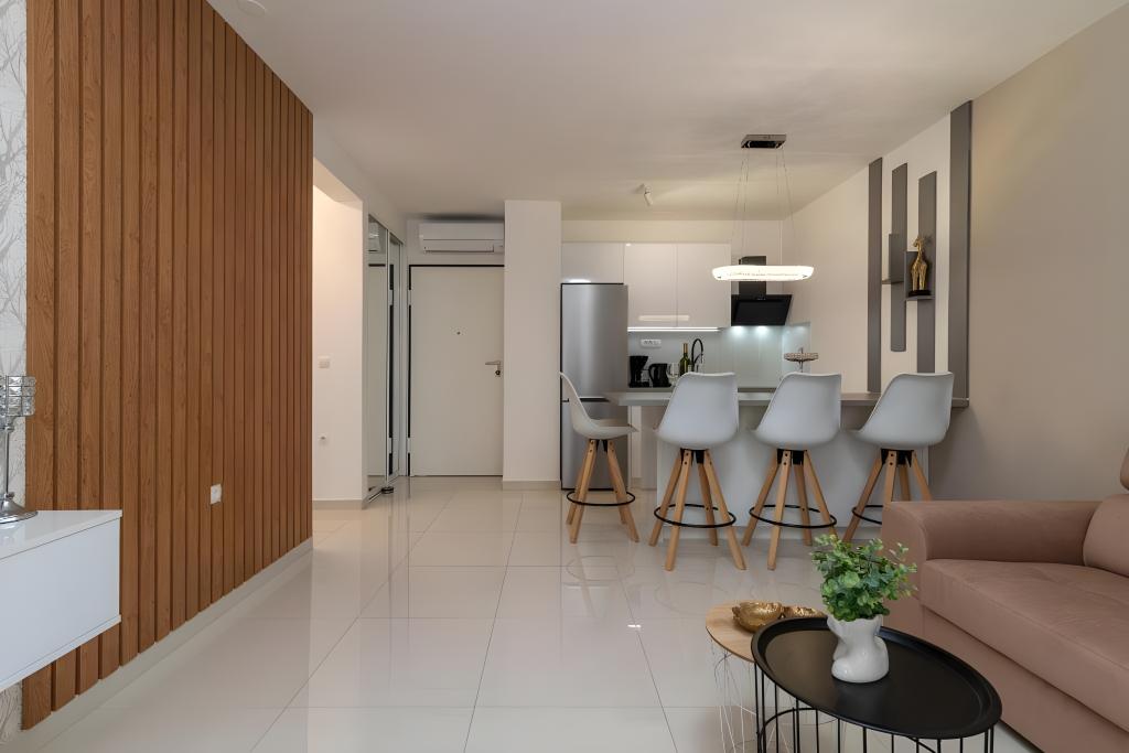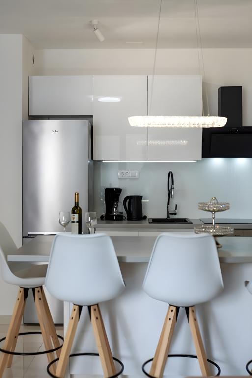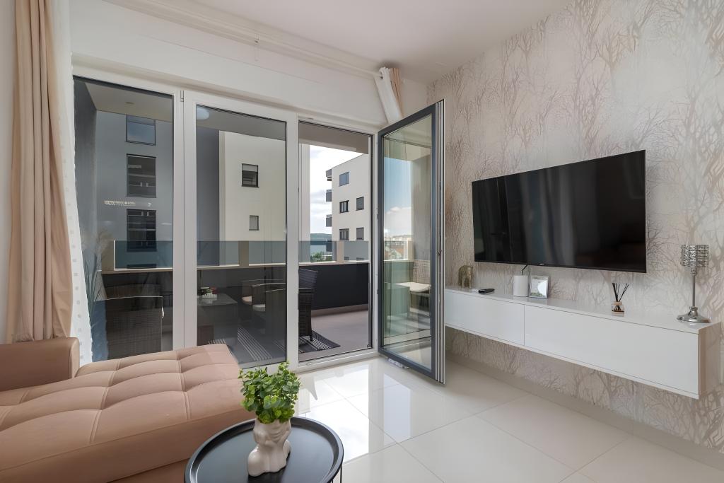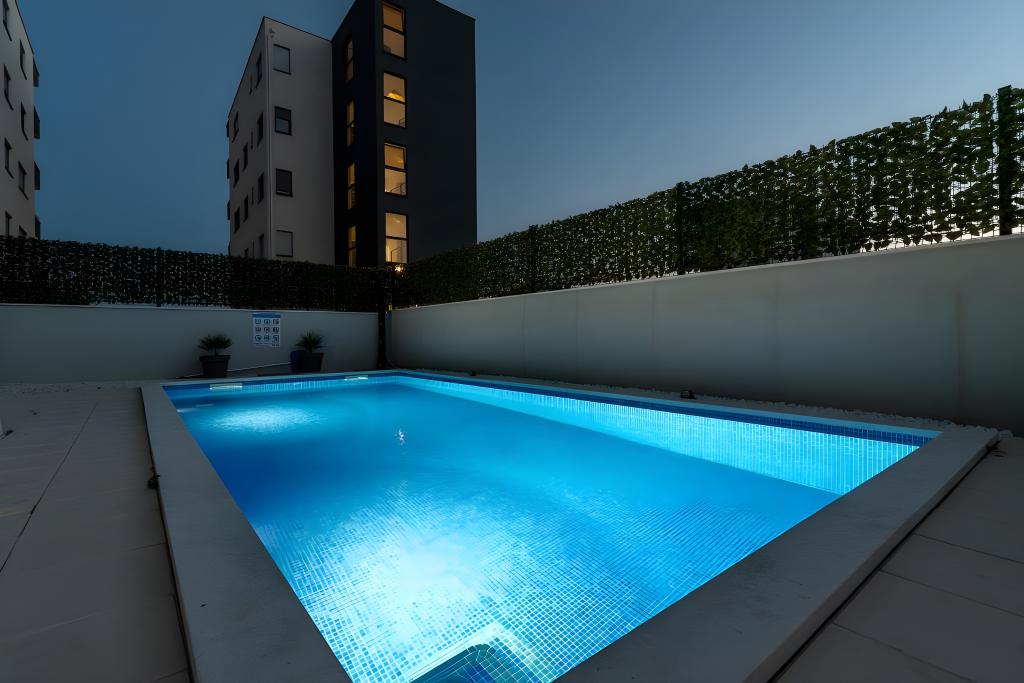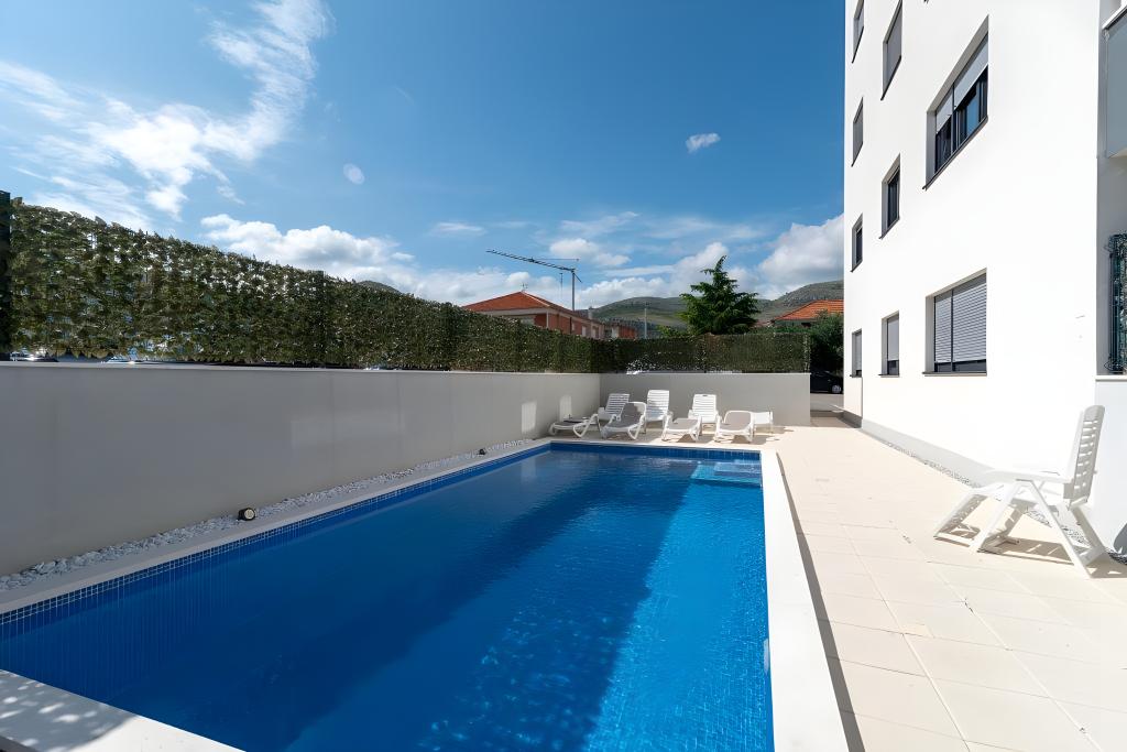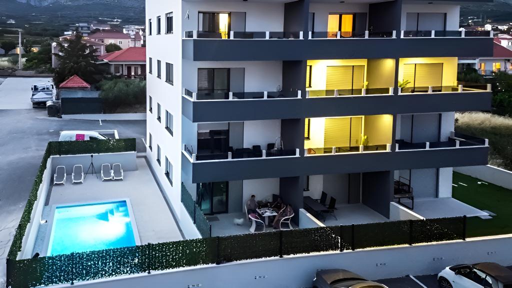 L'alloggio è situato in un moderno edificio di recente costruzione, in un ambiente tranquillo e ben curato, ideale per una vacanza rilassante e spensierata. La struttura offre agli ospiti una piscina all'aperto all'interno dell'edificio, perfetta per rilassarsi nelle giornate calde, e un parcheggio gratuito. L'appartamento è composto da una camera da letto con un comodo letto matrimoniale, un soggiorno con divano letto, una cucina completamente attrezzata, un bagno e un balcone. Lo spazio è arredato in stile moderno con particolare attenzione al comfort e alla funzionalità, creando un'atmosfera piacevole e rilassante. Il balcone arricchisce ulteriormente l'ambiente e offre il luogo ideale per gustare un caffè al mattino o rilassarsi la sera. La posizione garantisce privacy e tranquillità, offrendo al contempo un facile accesso a tutti i principali servizi della zona, rendendo questo alloggio una combinazione ideale di relax e praticità.