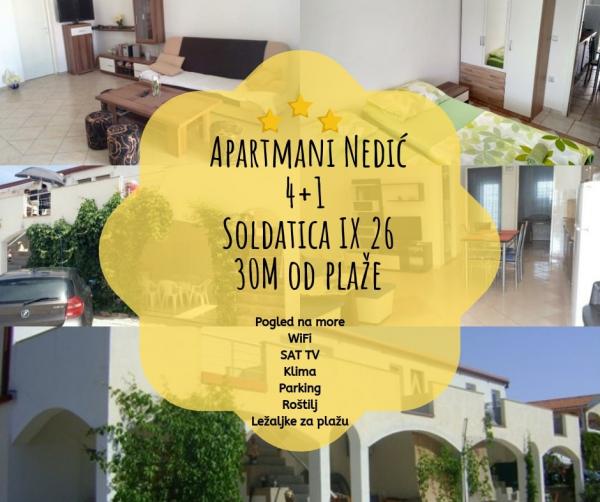 Spaziosi appartamenti completamente attrezzati sulla tranquilla parte orientale dell'isola di Vir, a soli 30 metri dalla spiaggia di ciottoli. Ciascuno dei 3 appartamenti dispone di 70 metri quadrati e può ospitare fino a 5 persone. Gli appartamenti dispongono di due camere da letto, un ampio soggiorno, una cucina completamente attrezzata e terrazze con vista sul mare. Scelta ideale per famiglie con bambini o coppie più giovani. C'è anche un barbecue nel cortile, e ogni appartamento ha il proprio spazio di parcheggio.