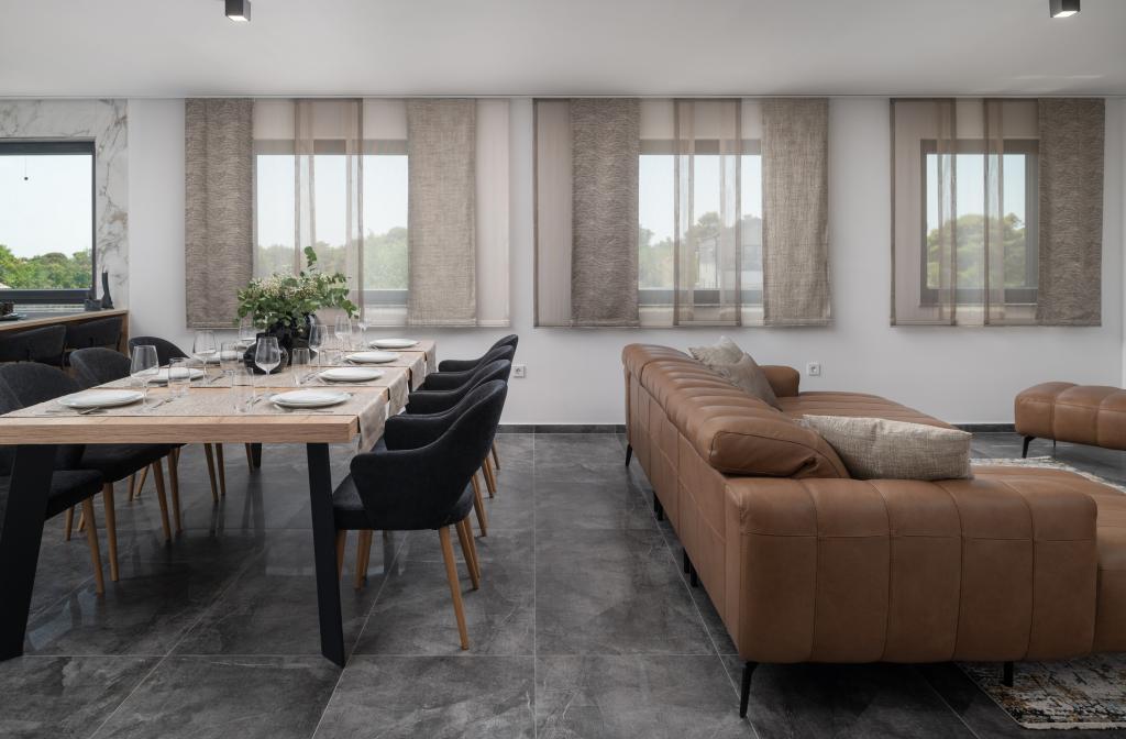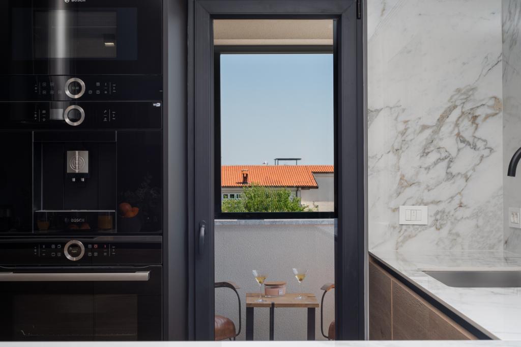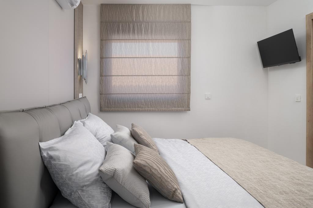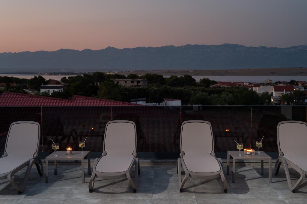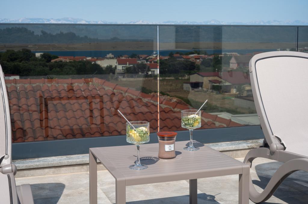 L'attico a 5 stelle, arredato con gusto e completamente ristrutturato di recente, si trova al secondo piano, nel centro dell'isola di Vir. L'attico di 100 m² è ideale per ospitare 4-5 persone. È suddiviso in un soggiorno con cucina completamente attrezzata e zona pranzo, un bagno separato, una cabina armadio, due camere da letto climatizzate con letto matrimoniale e TV satellitare e due bagni privati (uno con doccia e uno con vasca). Il soggiorno dispone di un divano letto per una persona. L'attico dispone di un balcone coperto di 3 m² dotato di barbecue elettrico, tavolo e sedie, da cui si gode di una vista parziale sul mare. L'attico dispone di una terrazza sul tetto (90 m²) con vista mare e lettini prendisole.