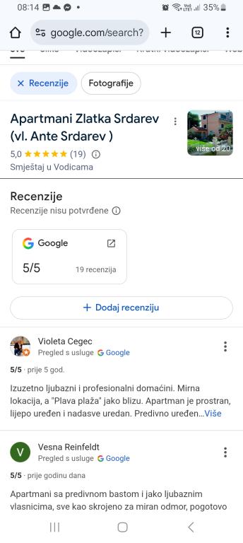Gli appartamenti Zlatka Srdarev si trovano in una zona tranquilla della città di Vodice conosciuta come Blata; vicino all'hotel Punta. La spiaggia principale dista solo 150 metri dall'appartamento Zlatka, mentre il centro città è a 300 metri. Gli appartamenti sono situati in una strada privata e sono circondati da una splendida vegetazione e piante mediterranee come ulivi, viti, fichi, kiwi... Possiamo vantarci di essere stati premiati due volte con il miglior giardino paesaggistico. Gli ospiti possono utilizzare il barbecue. I nostri appartamenti sono completamente separati l'uno dall'altro e ogni appartamento ha la sua terrazza. Gli ospiti hanno accesso al parcheggio all'interno del cortile. Venite e divertitevi con noi!