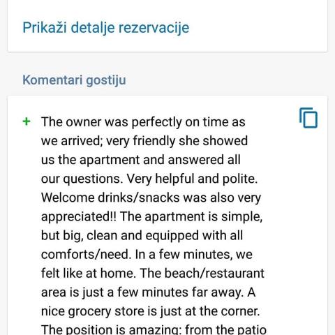 Super posto per un buon riposo. Pace e tranquillità. Molto gentile e attento padroni di casa. Martin molto protettivo. Appartamento dotato lo stretto necessario. Buon posto per escursioni alle cascate di Krka e alle grandi città di Sibenik, Trogir, Spalato. La spiaggia e il mare pulito e piacevole. Suggerirei!