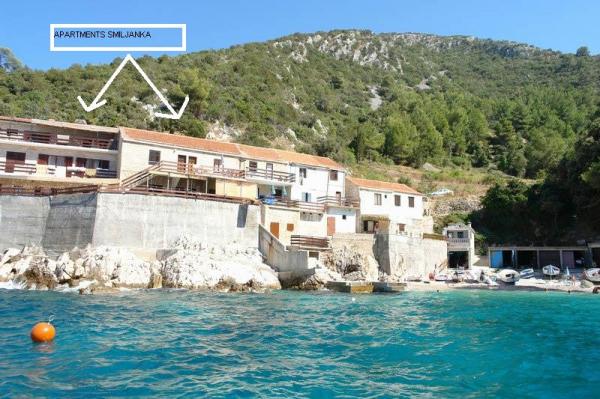Appartamenti Robinson Smiljanka sono situati nella baia, confutando una zona appartata dell'isola. La casa del vecchio pescatore ristrutturato per il turismo e di offrire una romantica vacanza ideale per chi vuole fuggire dalla caotica vita quotidiana. Strada di accesso abilitato (ultimi 3 km di strada sterrata). Parcheggio e parcheggio grill. Distanza da Gdinj 20 min. dalla spiaggia 20 m. Anche se isolato e lontano dalla civiltà solida e semplicemente attrezzato per la vita di tutti i giorni. I pannelli solari forniscono l'illuminazione in casa e telefono cellulare di ricarica. L'acqua da serbatoi di acqua piovana. L'acqua fredda è stato installato in cucine e bagni. Doccia esterna riscaldata dal sole. Frigorifero e fornello a gas. Offriamo due appartamenti: 1 APP (6 persone) A due piani, ingresso esterno indipendente, con vista sul mare. 2 camere, bagno, balcone, cucina, bagno, terrazzo con posti a sedere all'aperto. 2 APP (8 persone): su due piani, entrata esterna indipendente, con vista sul mare. 3 camere, 2 bagni, balcone, cucina, terrazza con posti a sedere all'aperto. Benvenuto