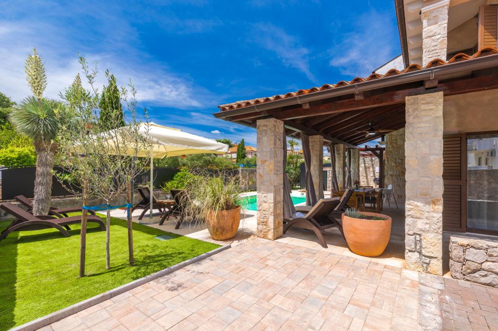 La lussuosa villa Bernarda si trova a Porat, vicino a Malinska. Può ospitare da 6 a 7 persone e dispone di tre camere da letto e due bagni, distribuiti su due piani. Al piano terra si trovano un soggiorno con divano letto per una persona, una cucina con zona pranzo, una dispensa e un bagno di servizio. Al primo piano si trovano tre camere matrimoniali, due bagni con doccia e un bagno di servizio. Nell'ampio spazio esterno si trovano una piscina privata riscaldata, una terrazza coperta, una zona barbecue, una doccia esterna e tanto spazio per divertirsi! Parcheggio incluso.