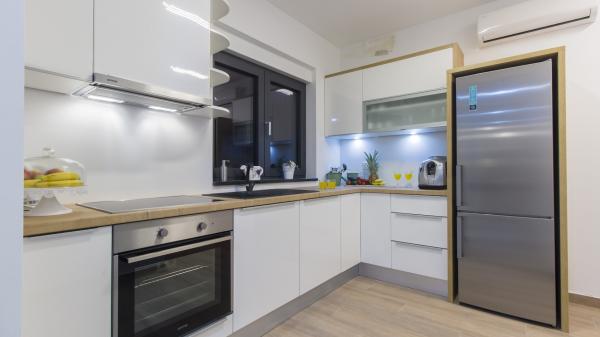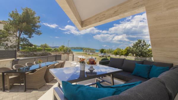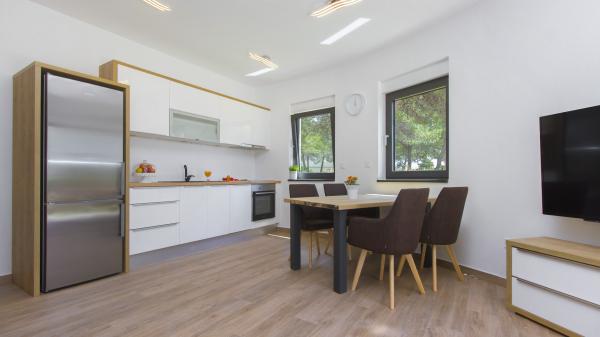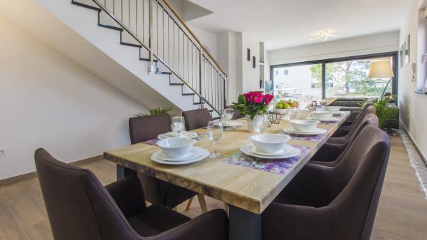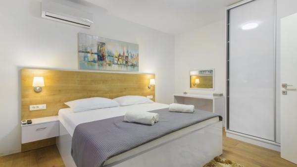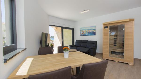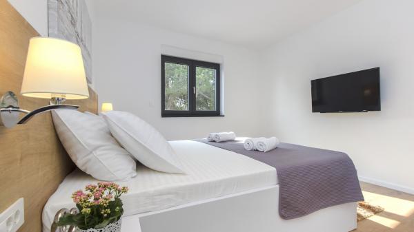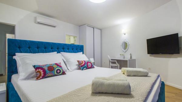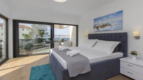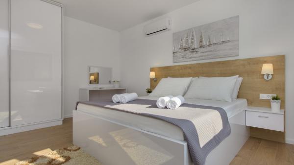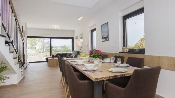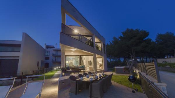 Villa Okit è una villa moderna di nuova costruzione situata a soli 50 metri dalla spiaggia sabbiosa di Srima, a 3 km da Vodice, a 13 km da Sebenico. Al piano terra c'è una cucina, soggiorno e soggiorno che compongono una unità e un bagno separato, dal soggiorno c'è una terrazza e un cortile paesaggistico con mobili da giardino e una zona solarium. La cucina è completamente attrezzata con utensili e angoli cottura necessari per la preparazione di pasti e bevande. Al piano terra c'è anche un appartamento separato con una camera da letto, bagno, cucina e sala da pranzo dove è possibile uscire dal cortile. Al 1 ° piano della casa ci sono 4 camere da letto e 3 bagni. Camera da letto 1, 20m2 con bagno privato e uscita sul balcone, letto 180X200, TV. Camera 2, 25m2, con bagno privato e uscita sul balcone, letto 180X200, TV. Camera 3 e Spoke 4 hanno un bagno in comune, ciascuno di 15m2 ciascuno, ognuno ha un letto 180x200, un cassettone e un televisore. Cortile recintato con area prendisole e mobili da giardino, posto auto.